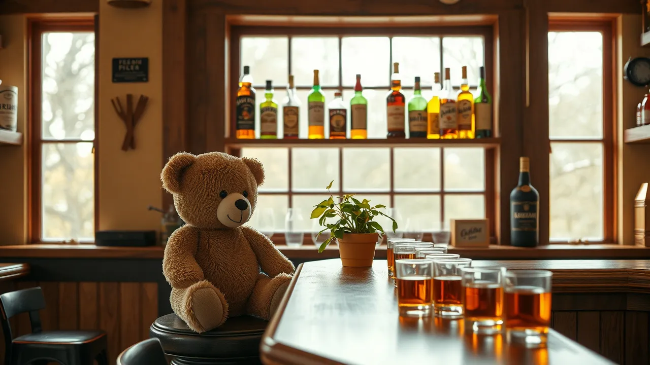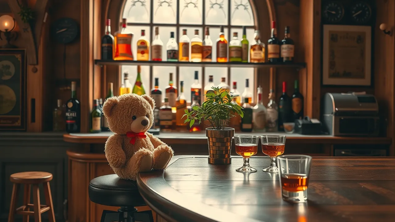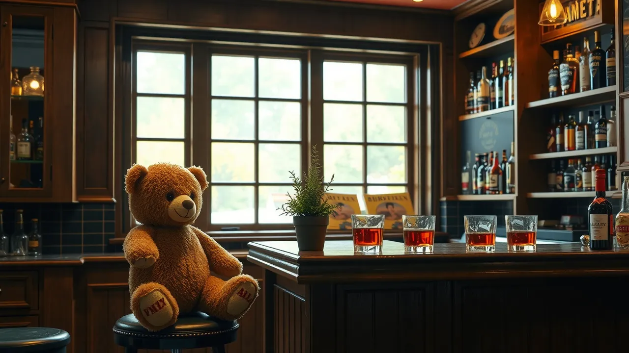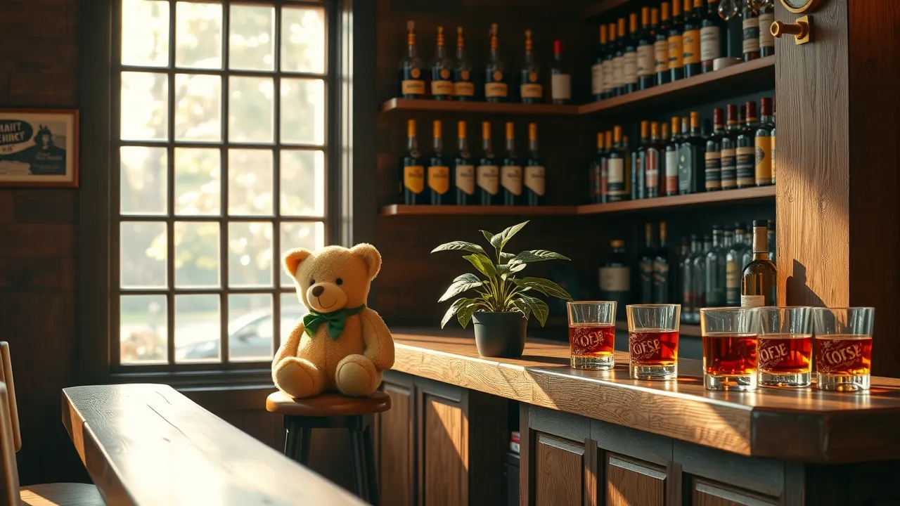 A cozy bar scene featuring a teddy bear sitting on a stool in front of a window with soft natural light streaming in. The wooden bar is adorned with several liquor bottles on the shelves behind it, and several glasses filled with amber liquid sit on the bar top. A small potted plant adds a touch of greenery to the warm and inviting atmosphere, highlighted by rich wood tones and vintage decor.
