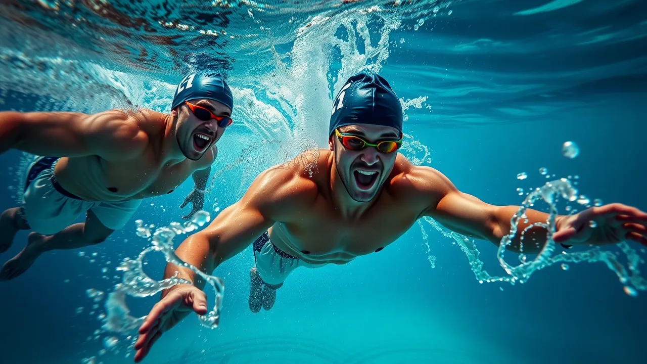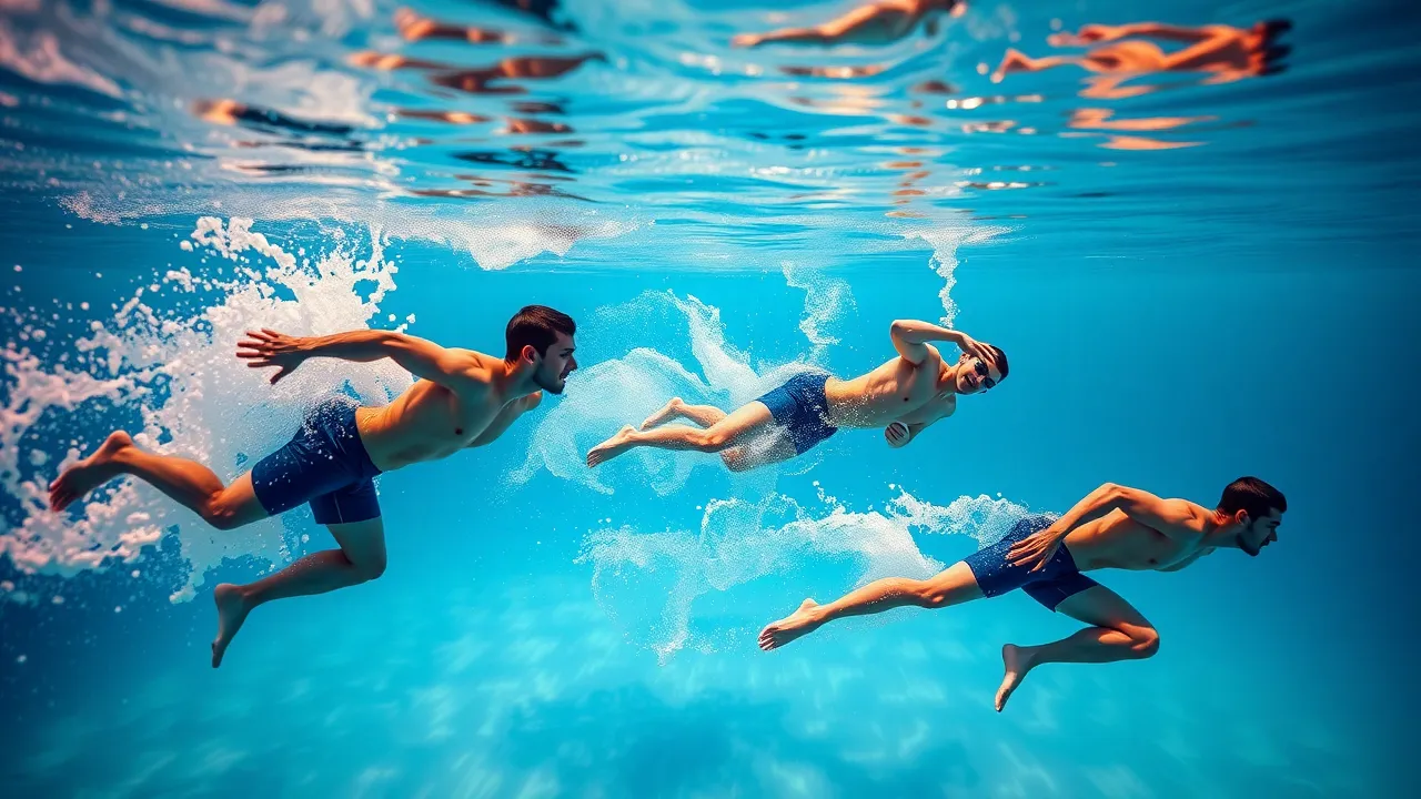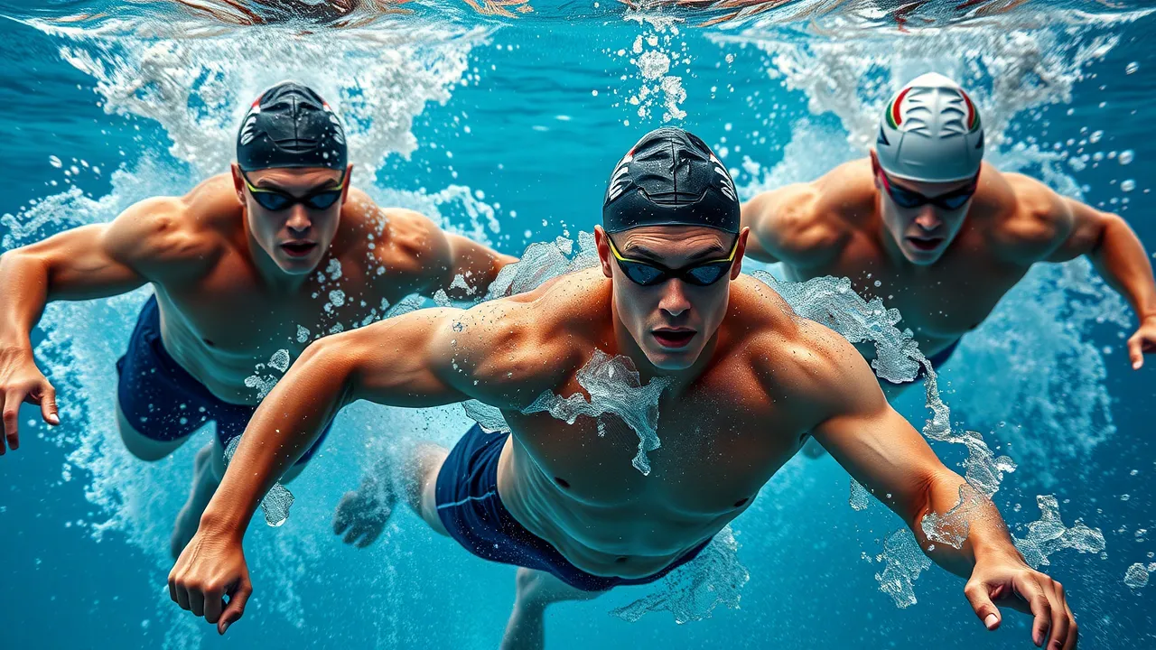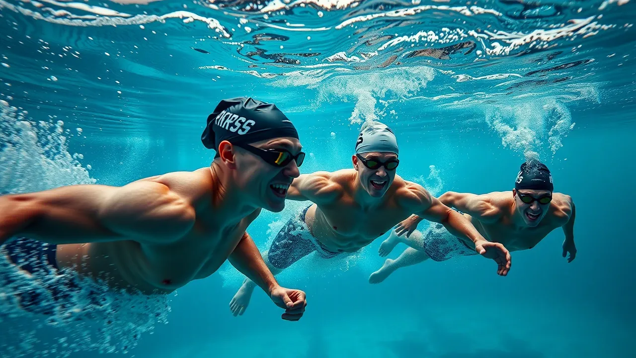 Dynamic underwater photography featuring three muscular swimmers in motion, adorned with swim caps and goggles, capturing rippling bubbles of water and air, emphasizing fluid movement and athleticism. The highly detailed, cinematic, photorealistic image