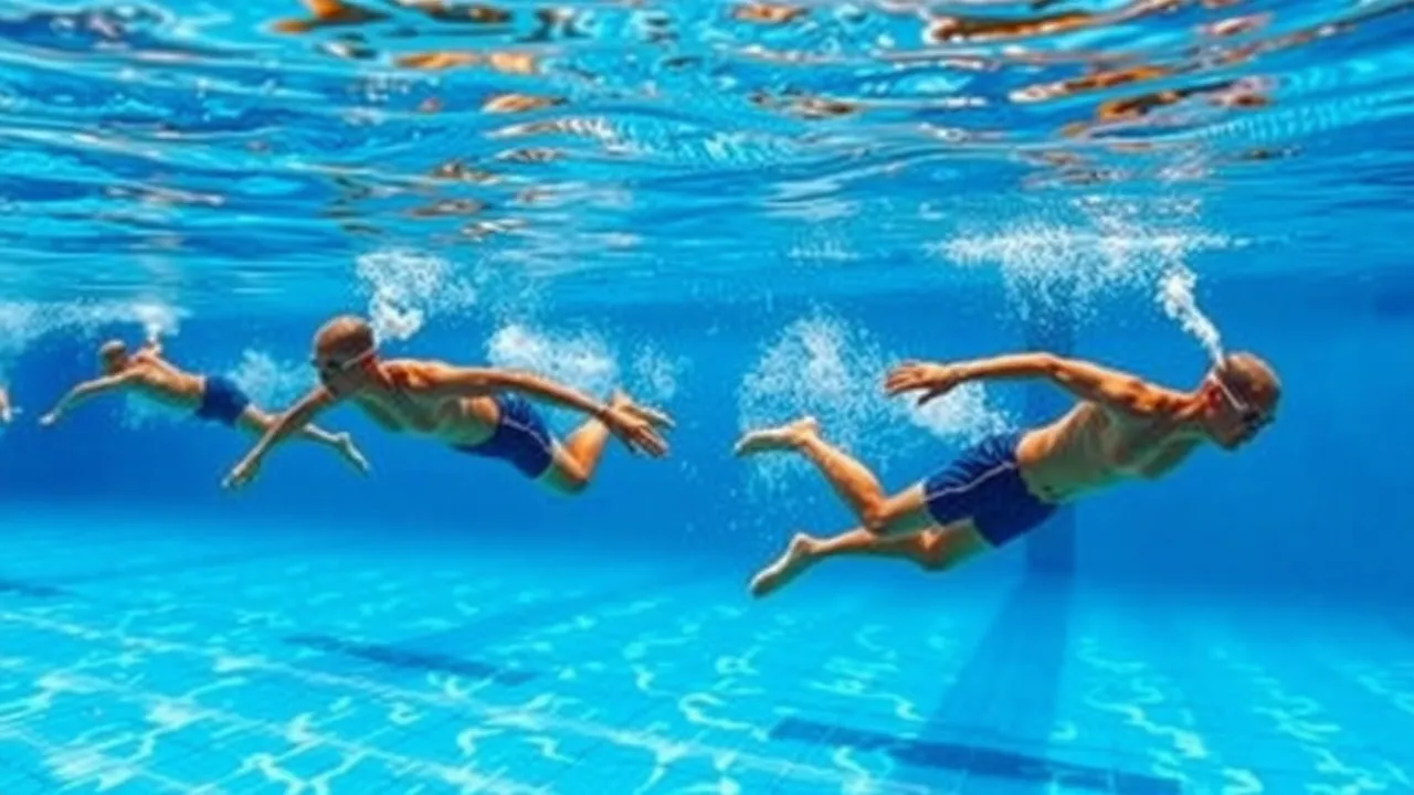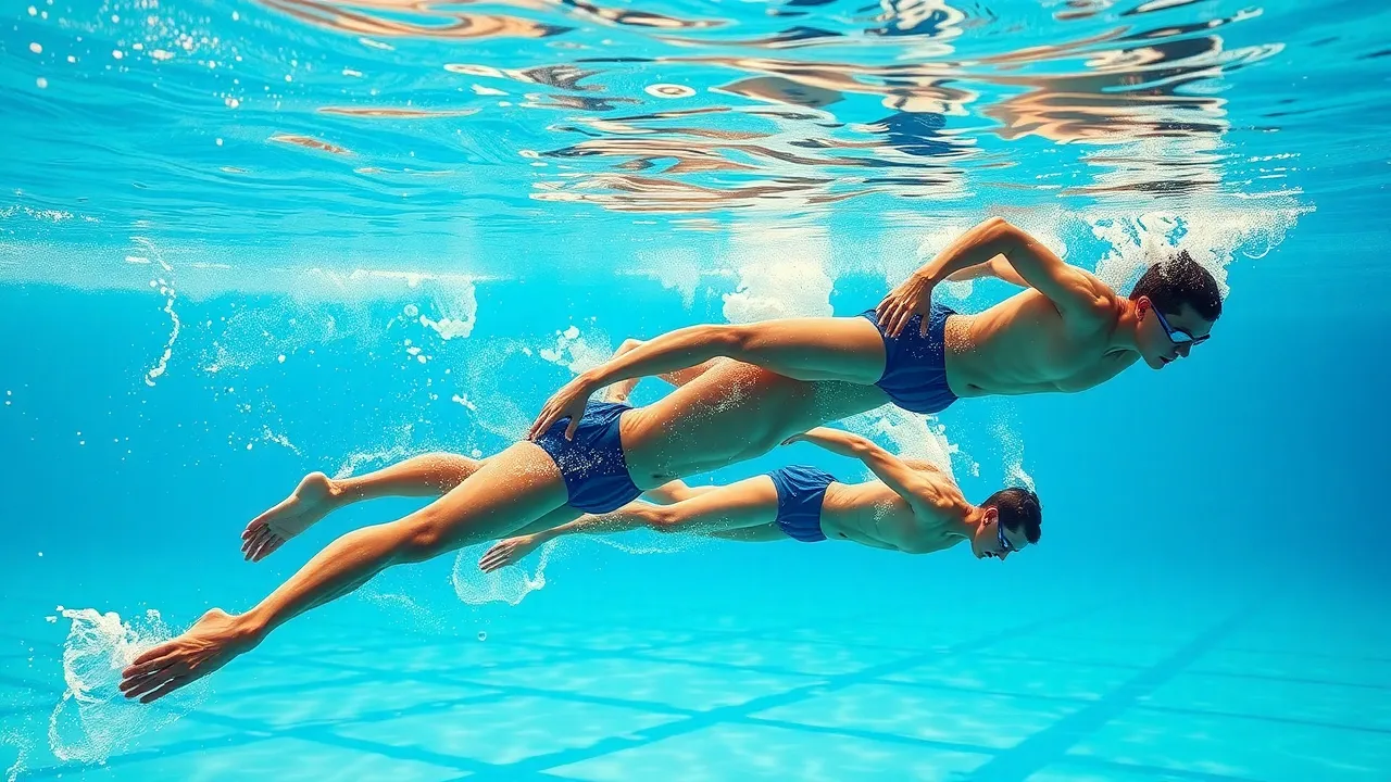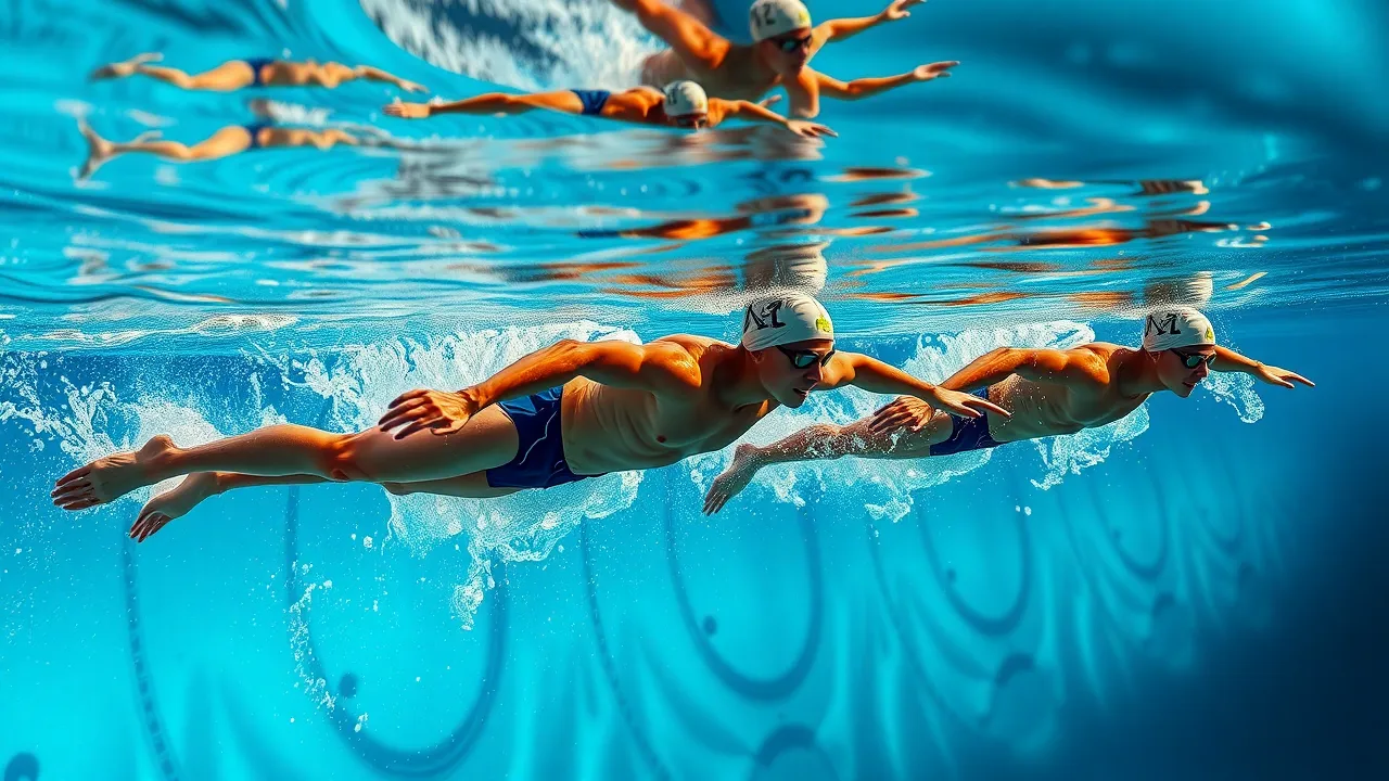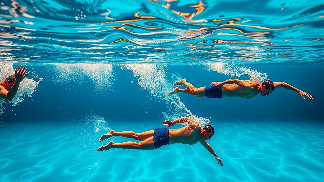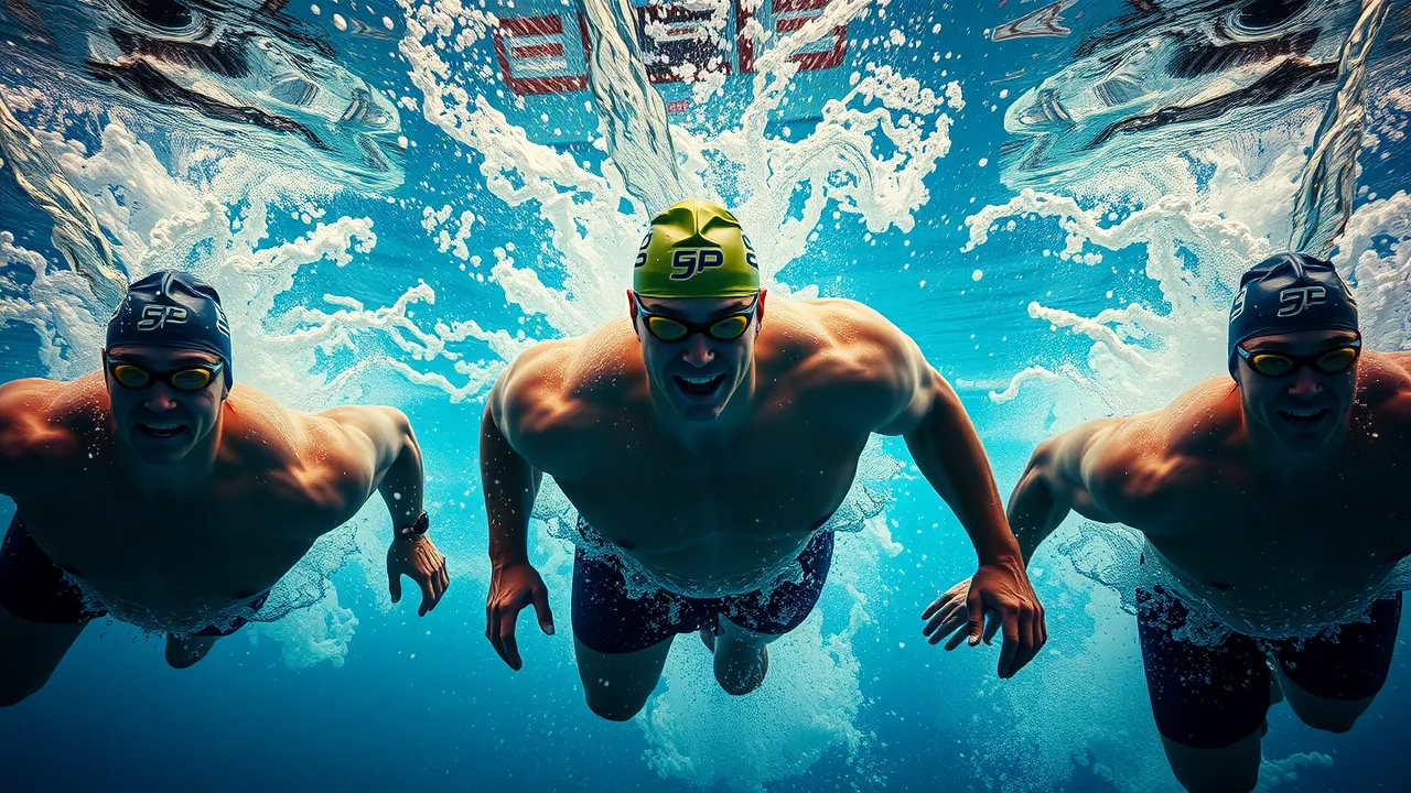 Dynamic underwater photography featuring three muscular swimmers in motion, adorned with swim caps and goggles, capturing rippling bubbles of water and air, emphasizing fluid movement and athleticism. The highly detailed, cinematic, photorealistic image