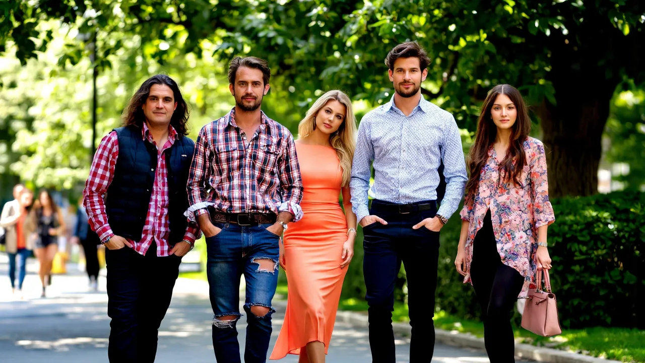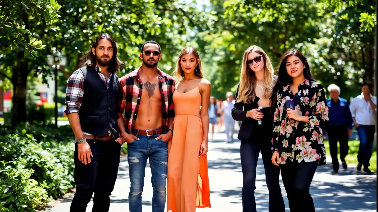 A vibrant street scene featuring four elegantly dressed people in a sunny park. On the left, a man with long, wavy hair wears a black vest over a plaid shirt and black pants. Beside him, another man stands confidently in a colorful, open shirt and distressed jeans, showing off his toned physique. He is accompanied by two women: one in a fitted peach dress and the other in a loose-fitting floral-print shirt and black pants. Lush vegetation and trees frame the background, while other pedestrians can be seen in the distance.