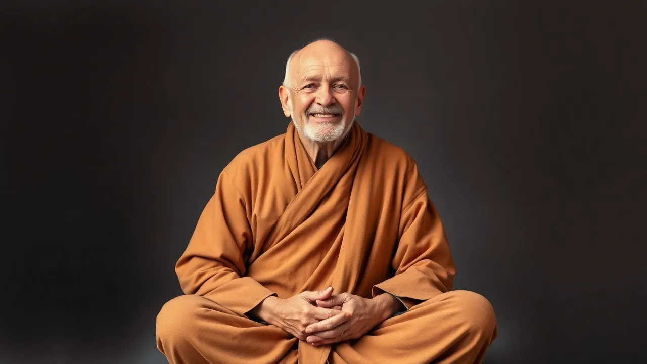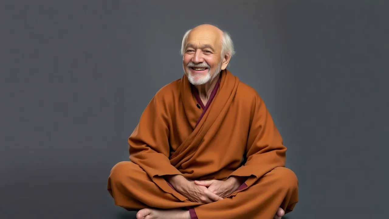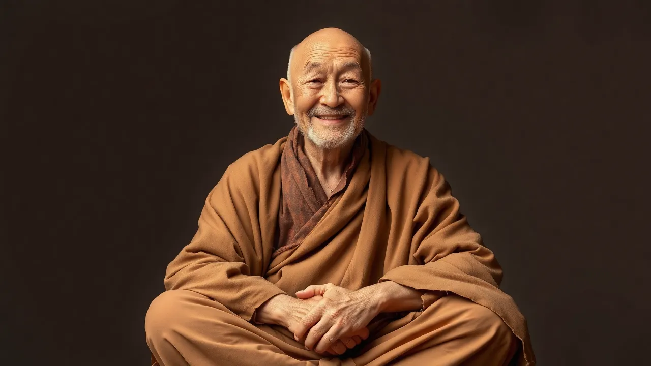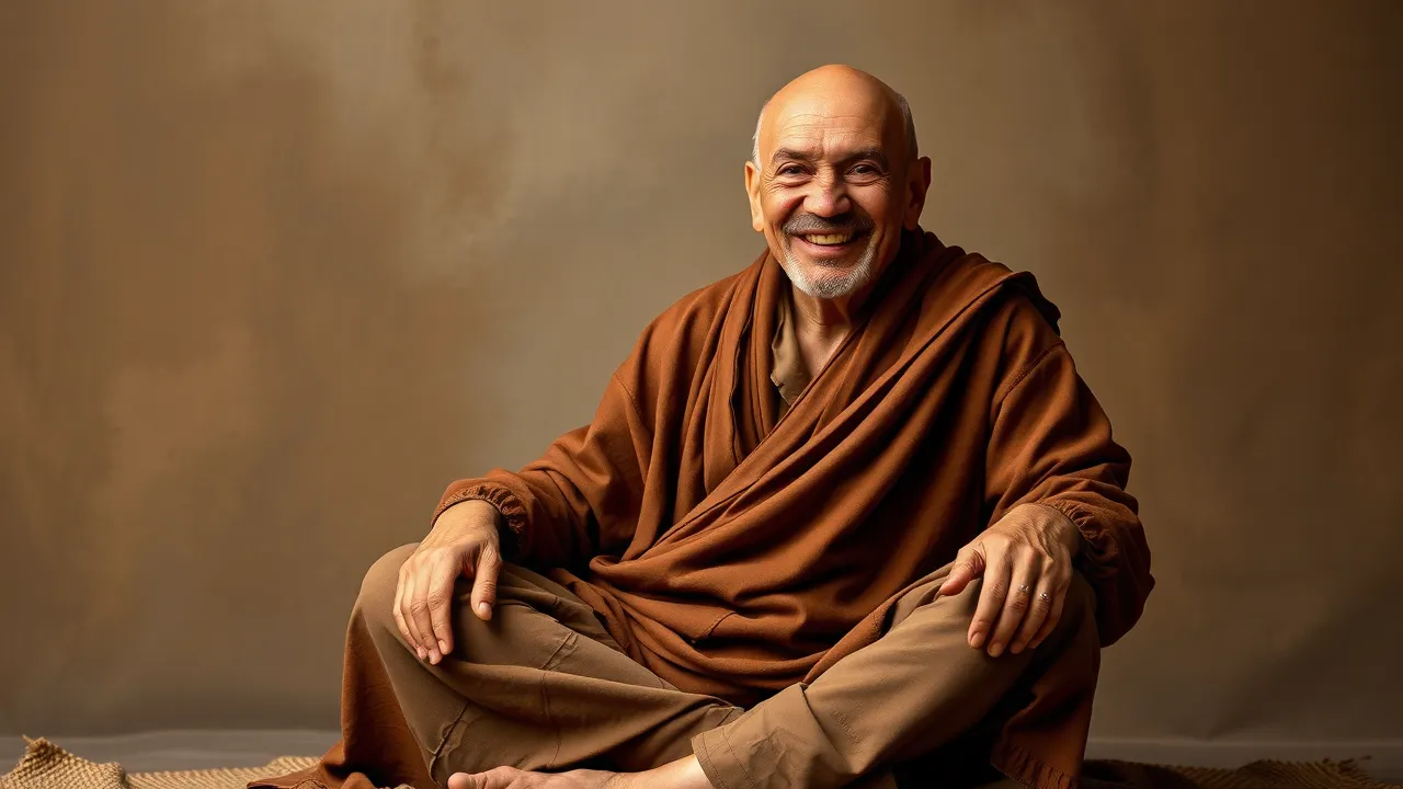 A serene old man with a warm smile sits cross-legged, dressed in a flowing brown robe. His skin is marked by age lines, reflecting a lifetime of wisdom. The overall composition conveys peace and reflection.