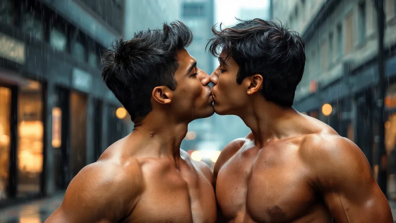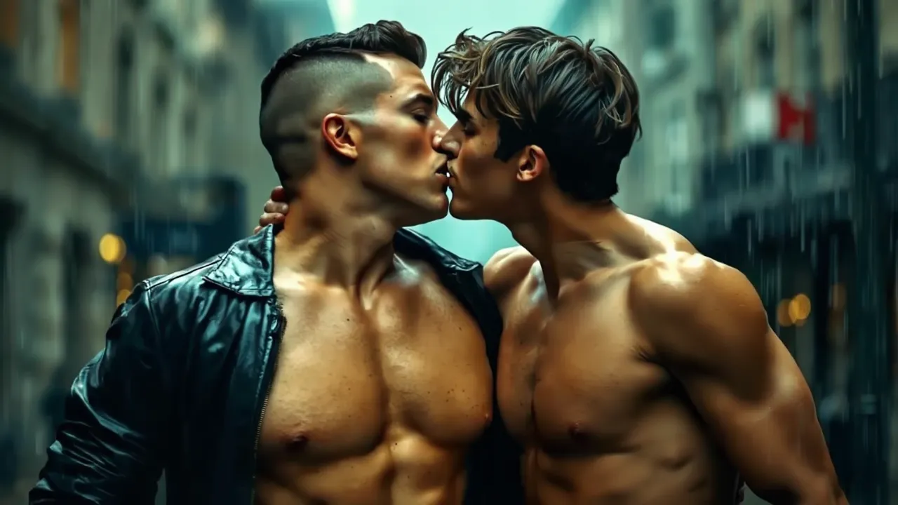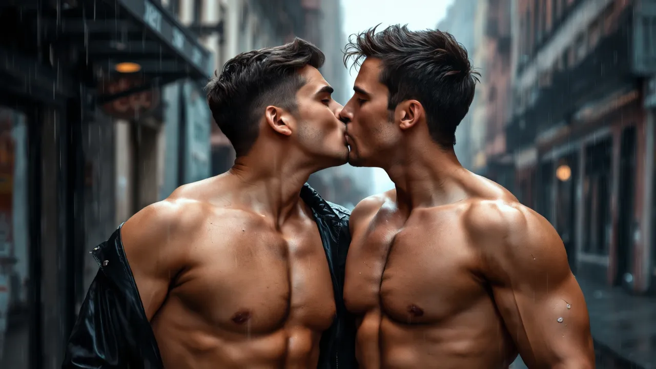 Two men are kissing in a rain-soaked urban setting. They are both shirtless, showcasing their athletic physiques. One man wears a leather jacket, while the other has a slightly tousled hairstyle. The background features blurred architecture and street elements, with rain cascading down, creating an intimate and romantic atmosphere.