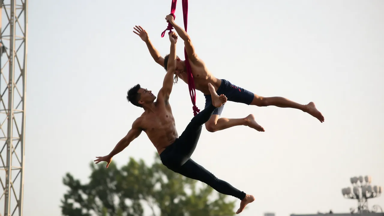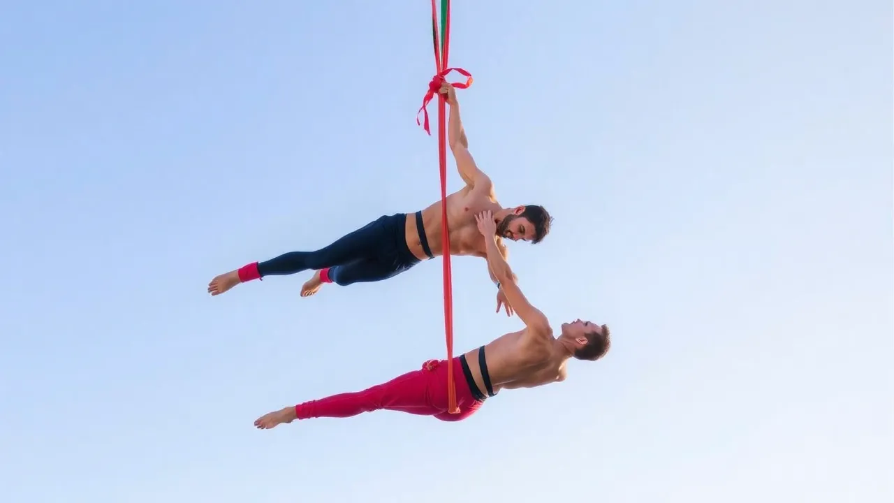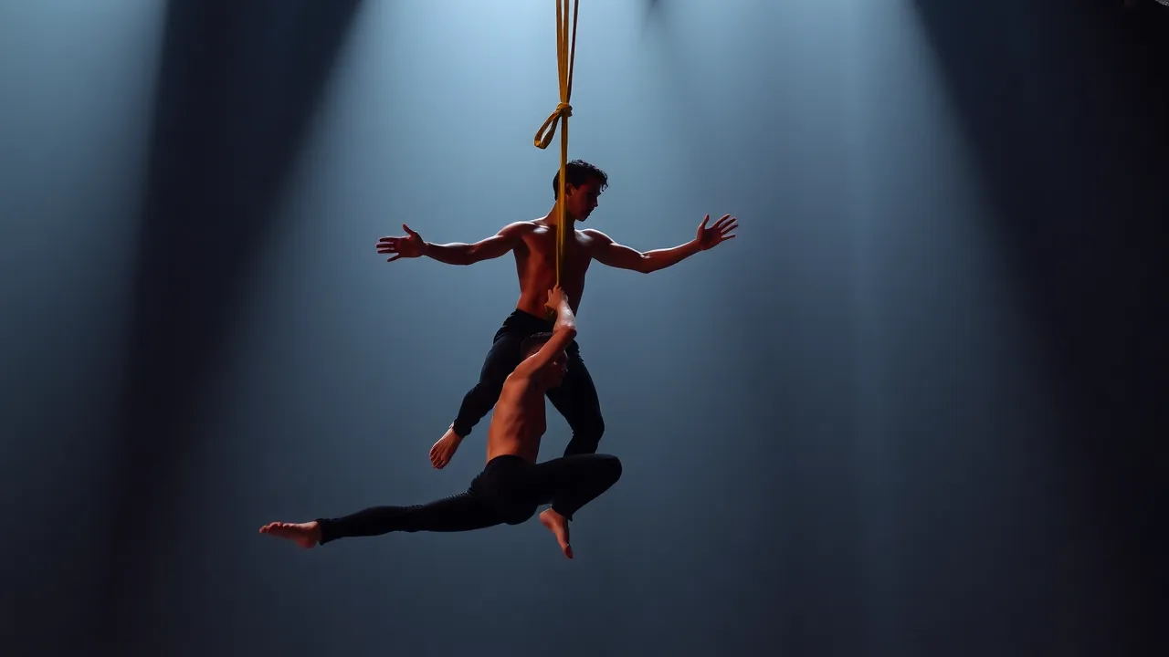 Fotografía de dos acróbatas aéreos machos realizando una actuación en el aire. Uno de ellos, suspendido de una cuerda, está boca abajo, mientras que el otro, abajo, extiende la mano para atraparlo. La imagen está iluminada por dramáticos rayos de luz que irradian desde arriba, creando una atmósfera dinámica e intensa. Las figuras musculosas y atléticas exhiben la gracia y la fuerza de su desempeño sobre un fondo que enfatiza el movimiento y la energía.