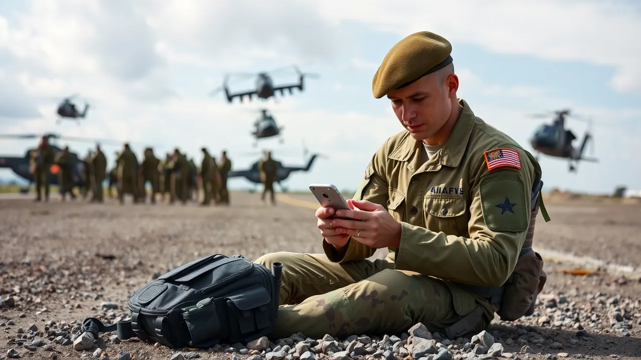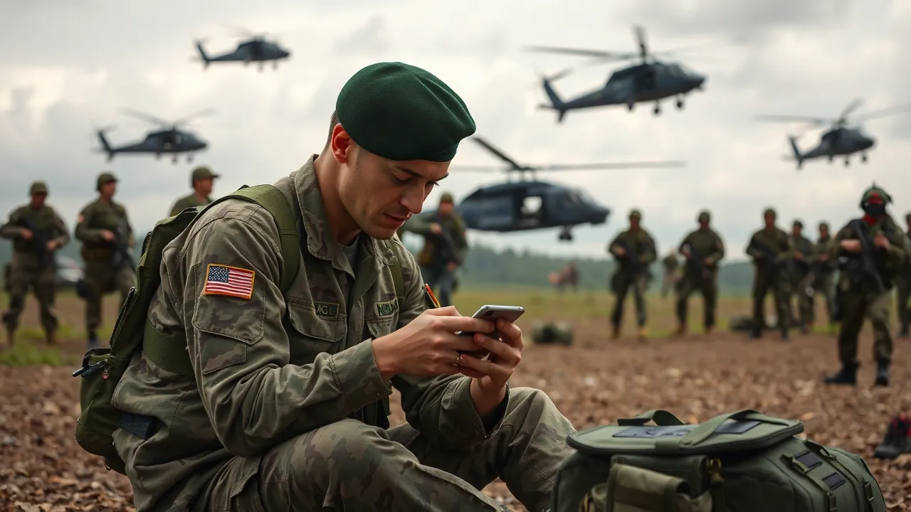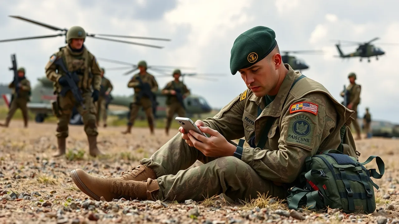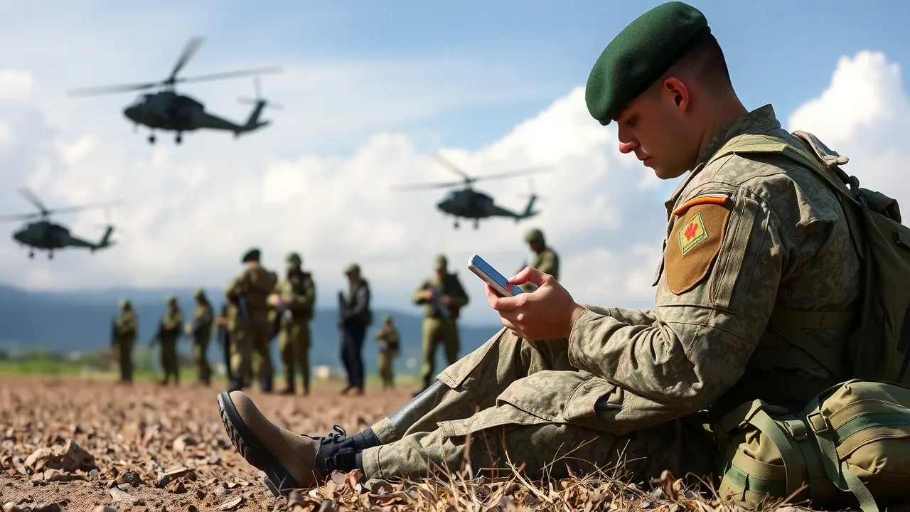 A soldier wearing a beret sits on the ground, focused on a smartphone in his hands. He wears a camouflage uniform adorned with military patches, and a backpack rests nearby. In the background, several helicopters hover, partially obscured by clouds, while other armed soldiers stand nearby, creating a tactical operations scenario.