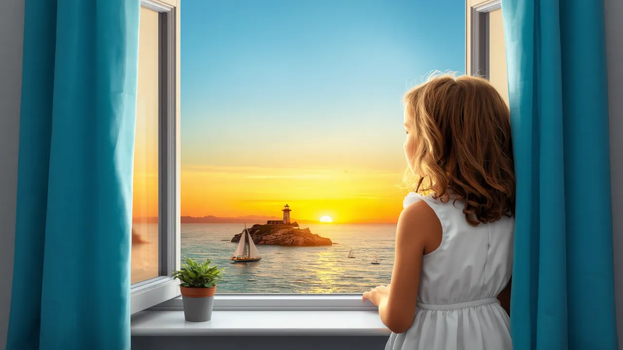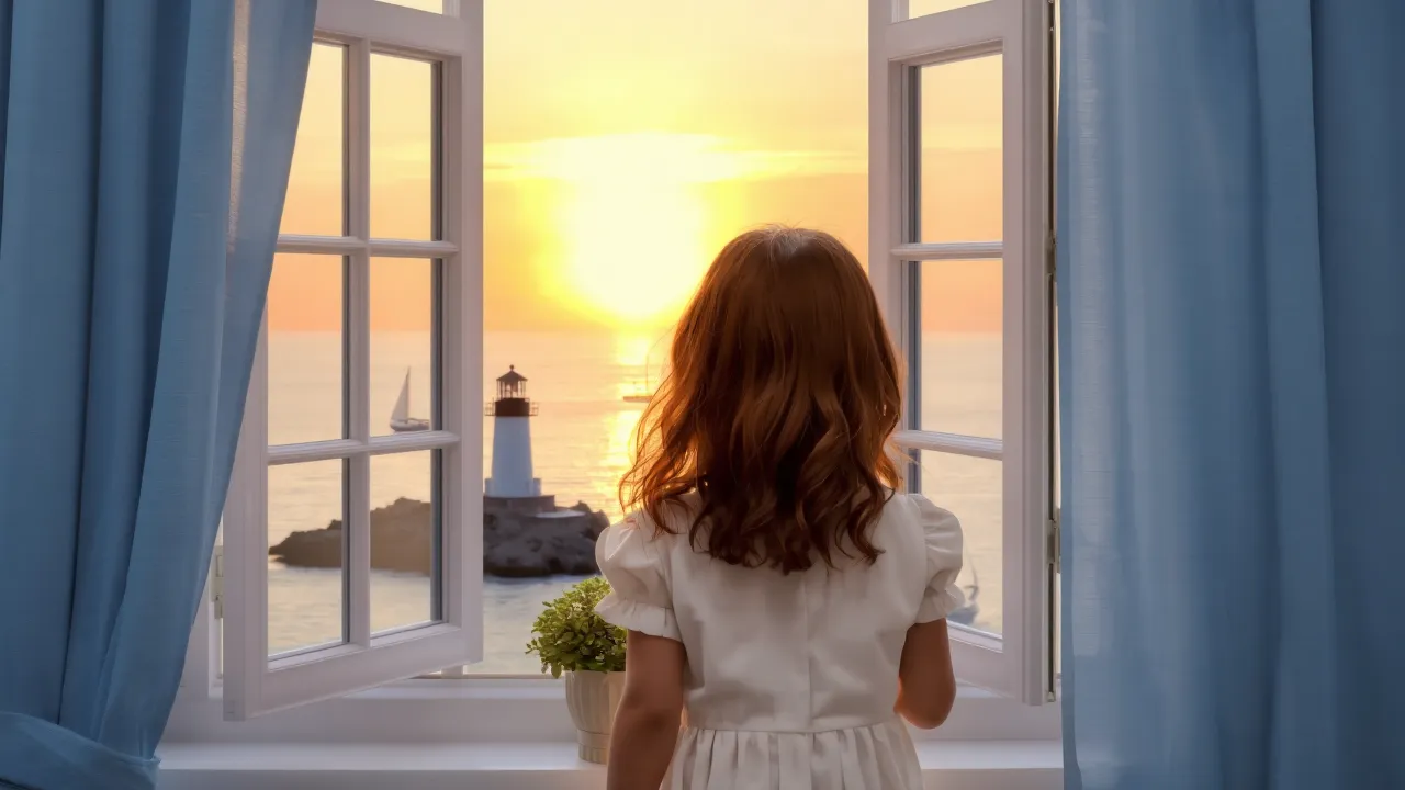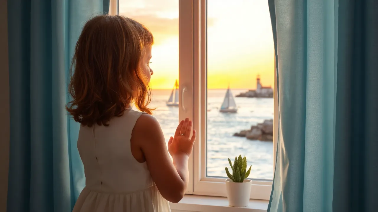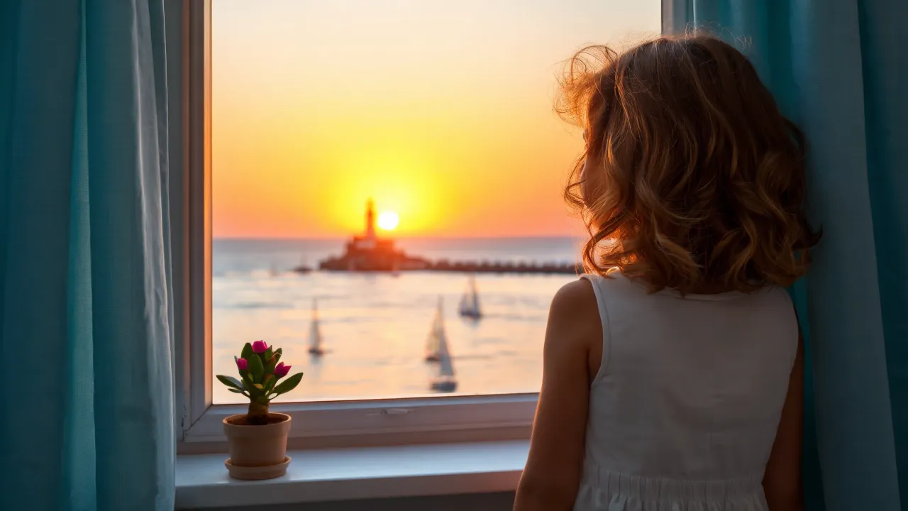 A young girl with wavy hair, wearing a white dress, gazes out of an open window framed by light blue curtains. The view showcases a tranquil sea with sailboats gliding past a lighthouse on a rocky shore, illuminated by a warm sunset. A small potted plant sits on the windowsill, adding a touch of color to the serene scene.