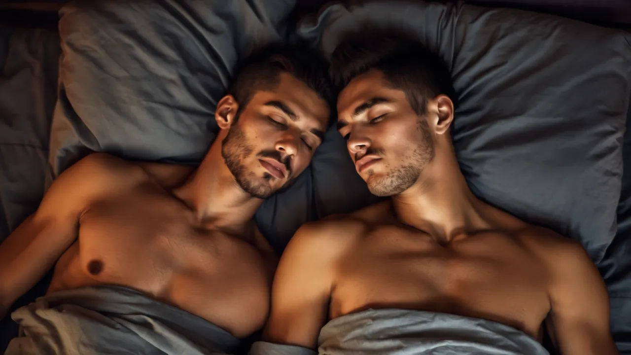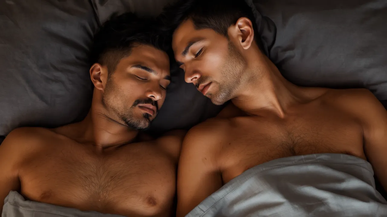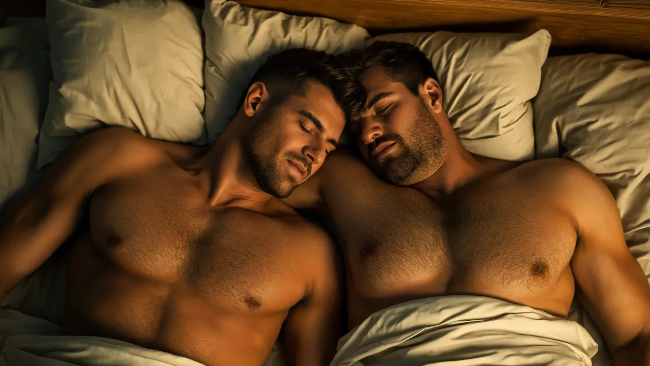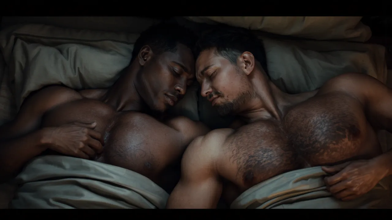 Two shirtless men lie close together in bed, sharing an intimate, relaxed moment. One man rests his head against the other, whose eyes are closed, appearing peaceful. Soft gray bedding surrounds them, and the warm lighting creates a cozy atmosphere, highlighting their muscular bodies and the gentle connection between them.