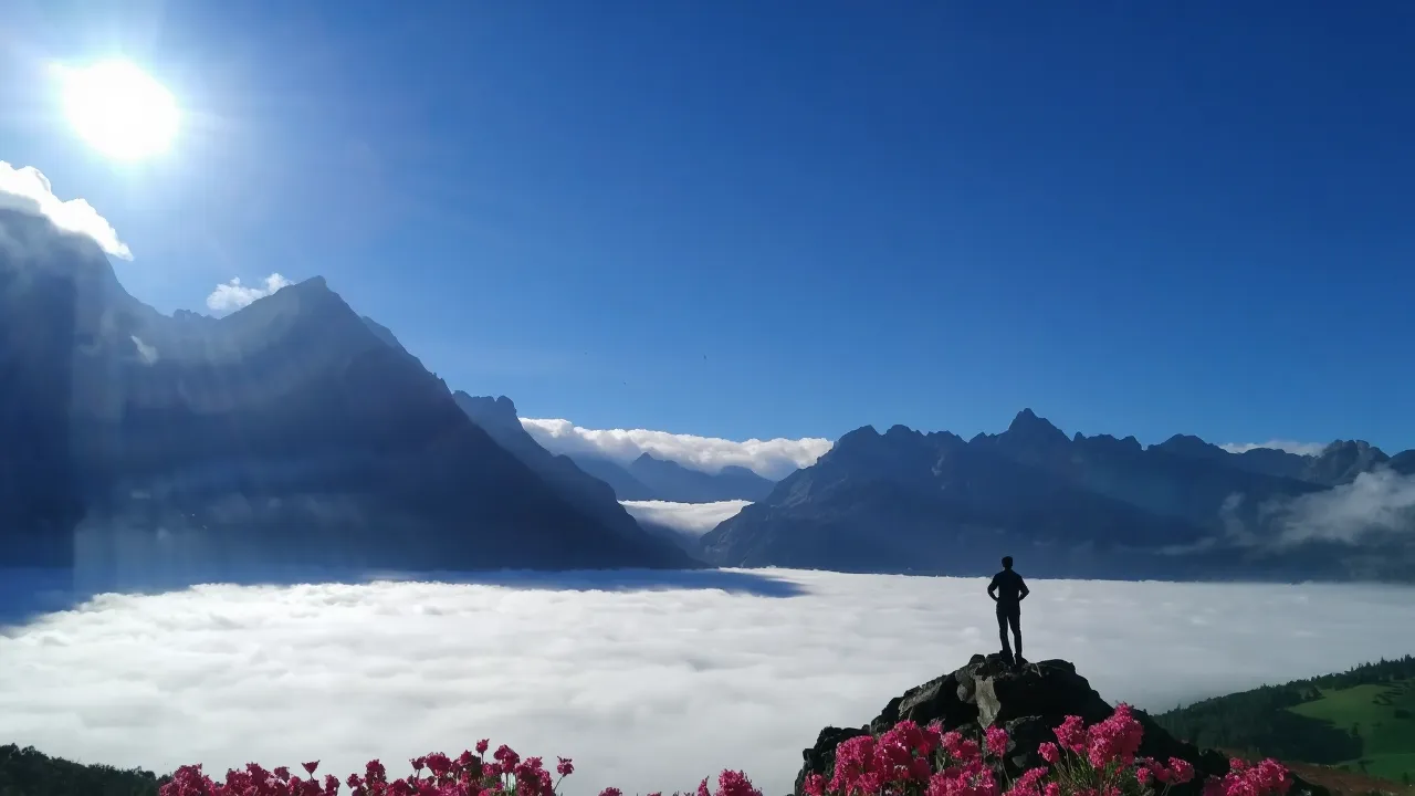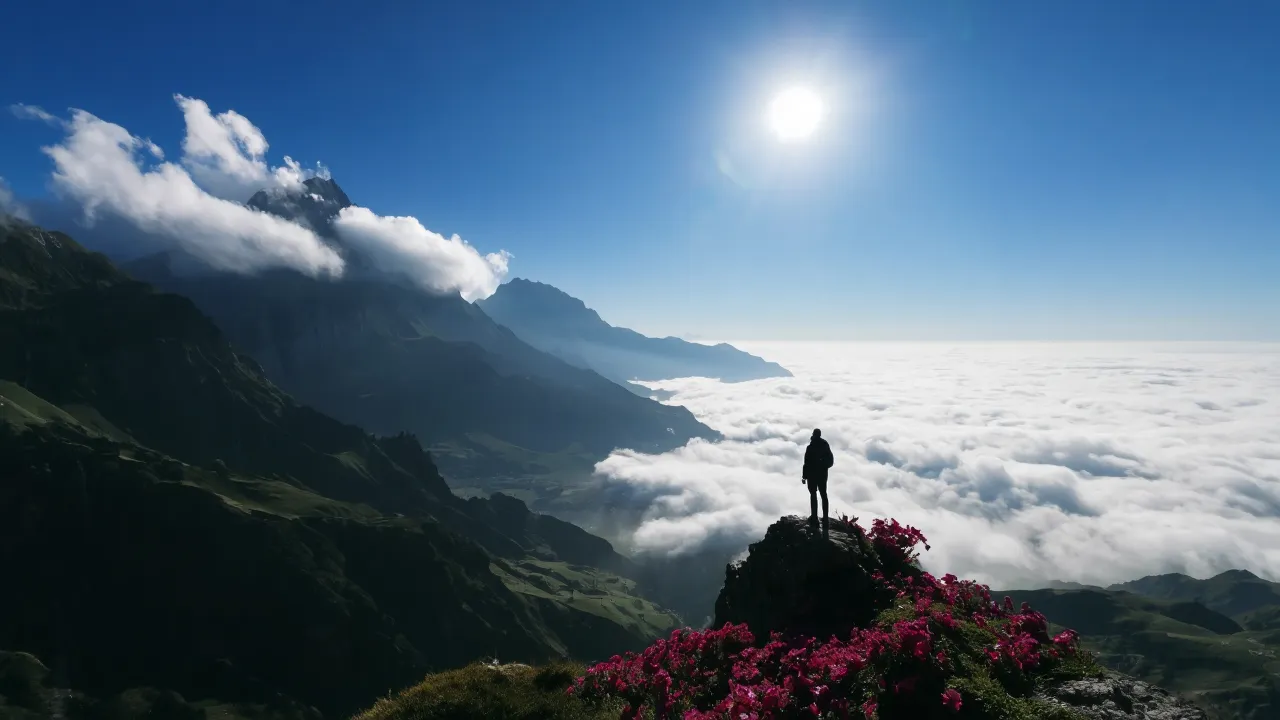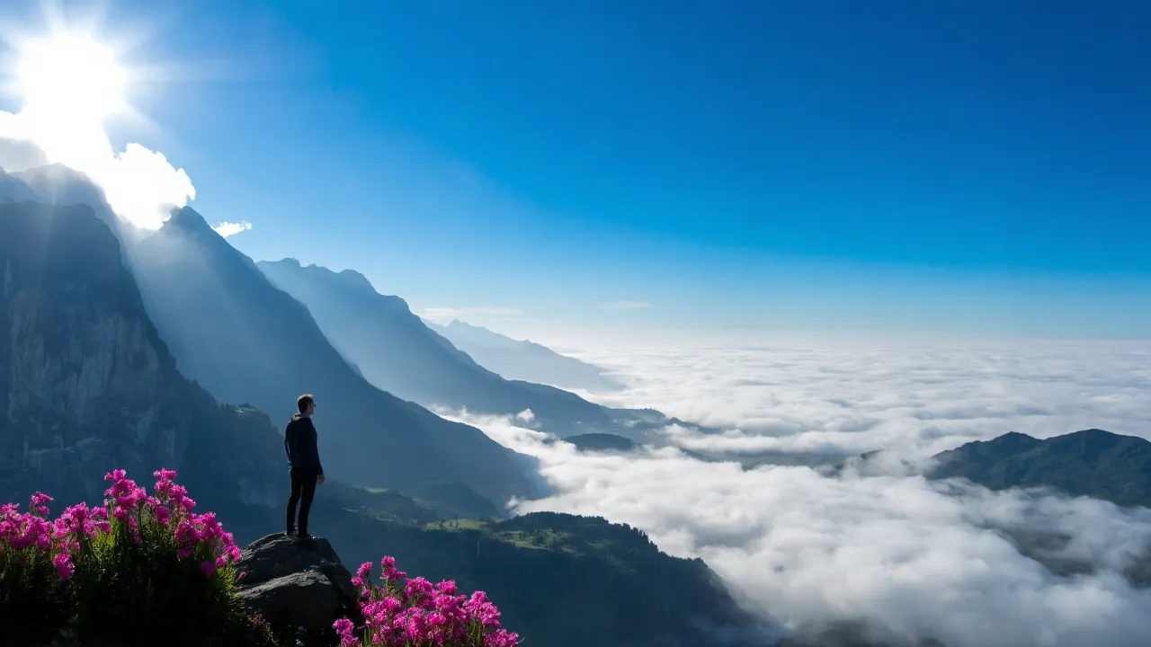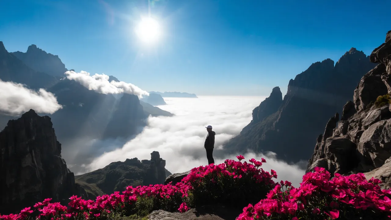 A stunning landscape with towering, jagged mountains partially shrouded in mist, the sun shining brightly in a clear blue sky. In the foreground, a figure stands on a rocky outcrop, gazing toward the horizon, surrounded by vibrant pink flowers. Below, a sea of clouds envelops distant hills and peaks, creating a sense of depth and tranquility.