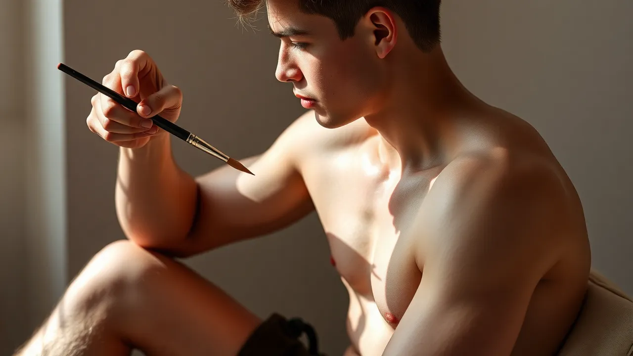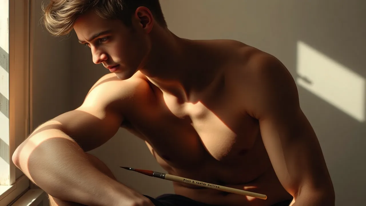 A shirtless young man sitting in a relaxed pose, holding a paintbrush. The man’s muscular arm and profile are highlighted, emphasizing his focused expression, and the light falling on his face adds depth to the composition.