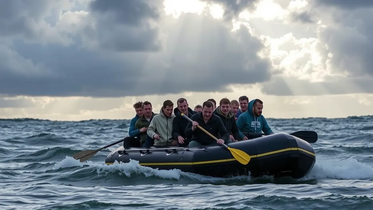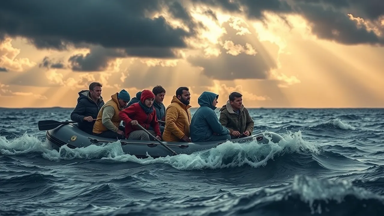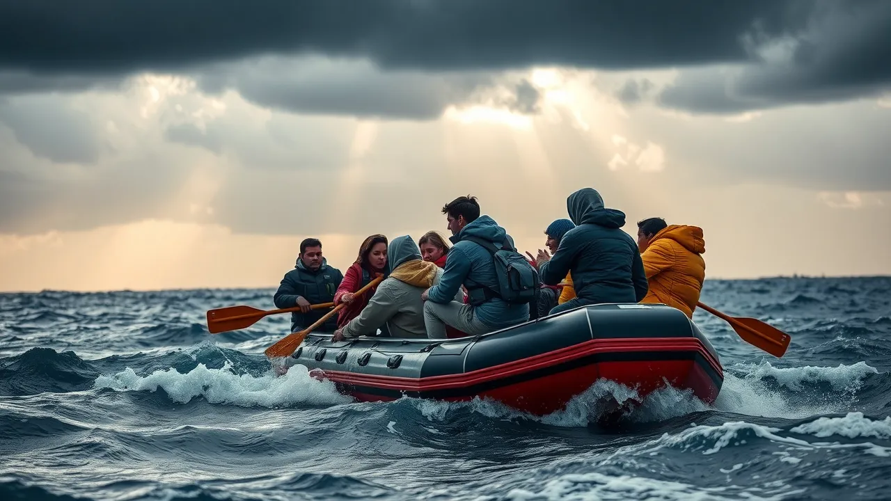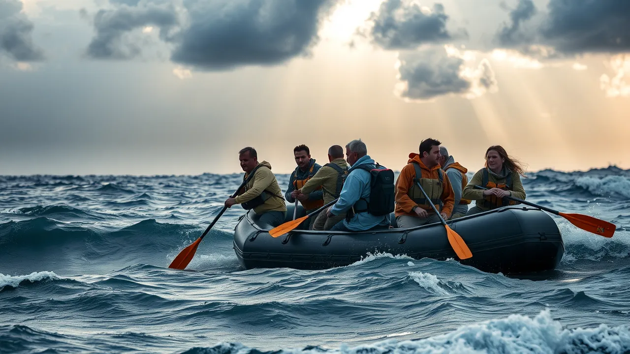 A group of people dressed in sturdy clothing are huddled on a small inflatable raft, navigating choppy ocean waves under a dramatic sky filled with dark clouds. Some wield oars, while others appear worried or tired, facing the turbulent waters around them. The scene captures a sense of urgency and desperation, illuminated by the soft glow of sunlight piercing the clouds.