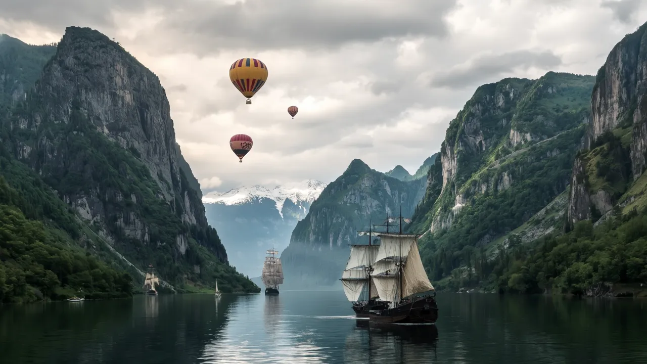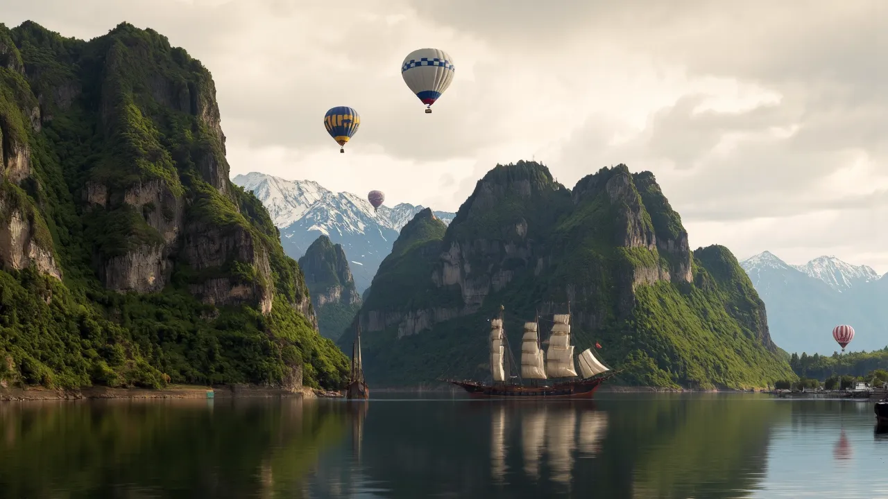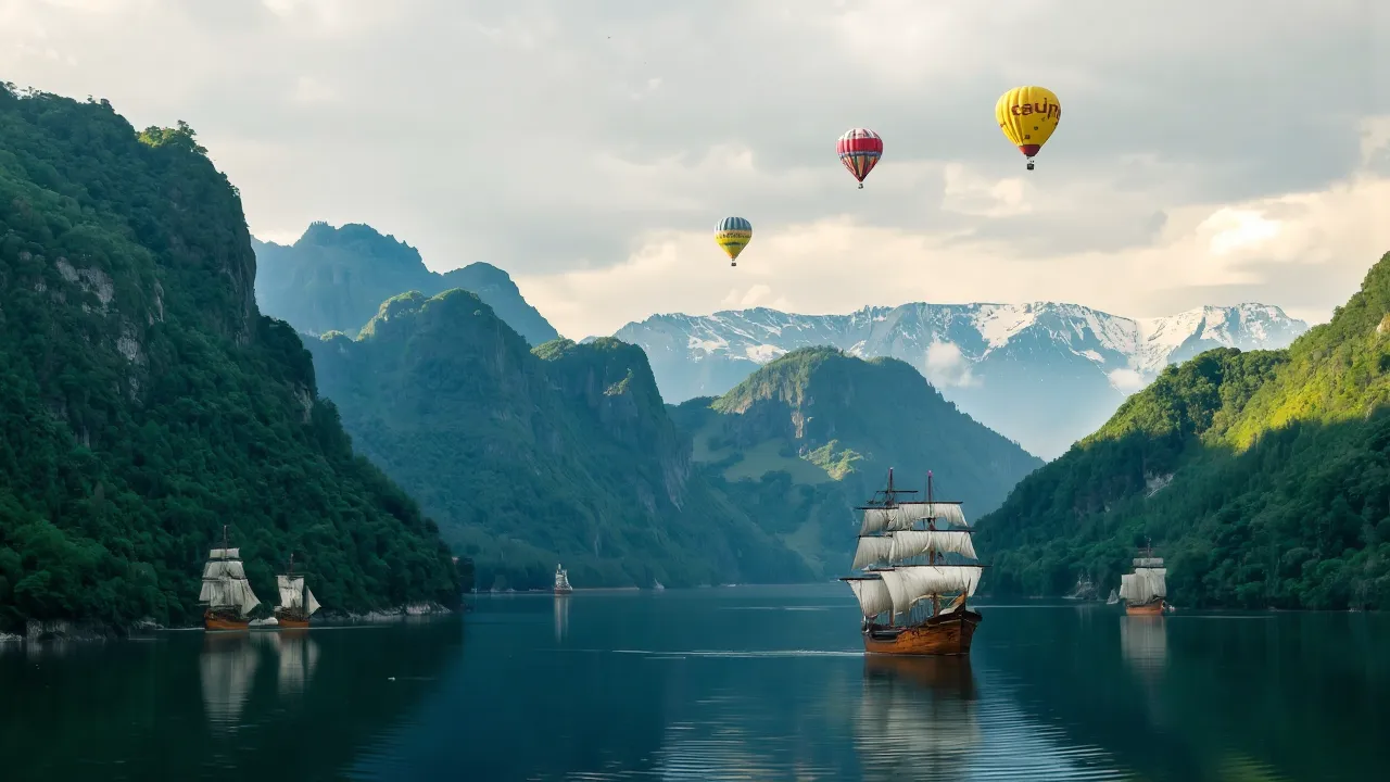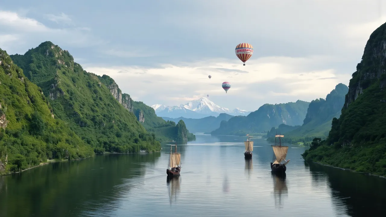 A serene landscape featuring towering green cliffs flanking a calm river, which reflects the soft light of a cloudy sky. Several traditional sailing ships navigate the waterway, while a few colorful hot air balloons drift overhead, adding a whimsical touch to the tranquil scene. The distant mountains are capped with snow, enhancing the picturesque quality of the vista.