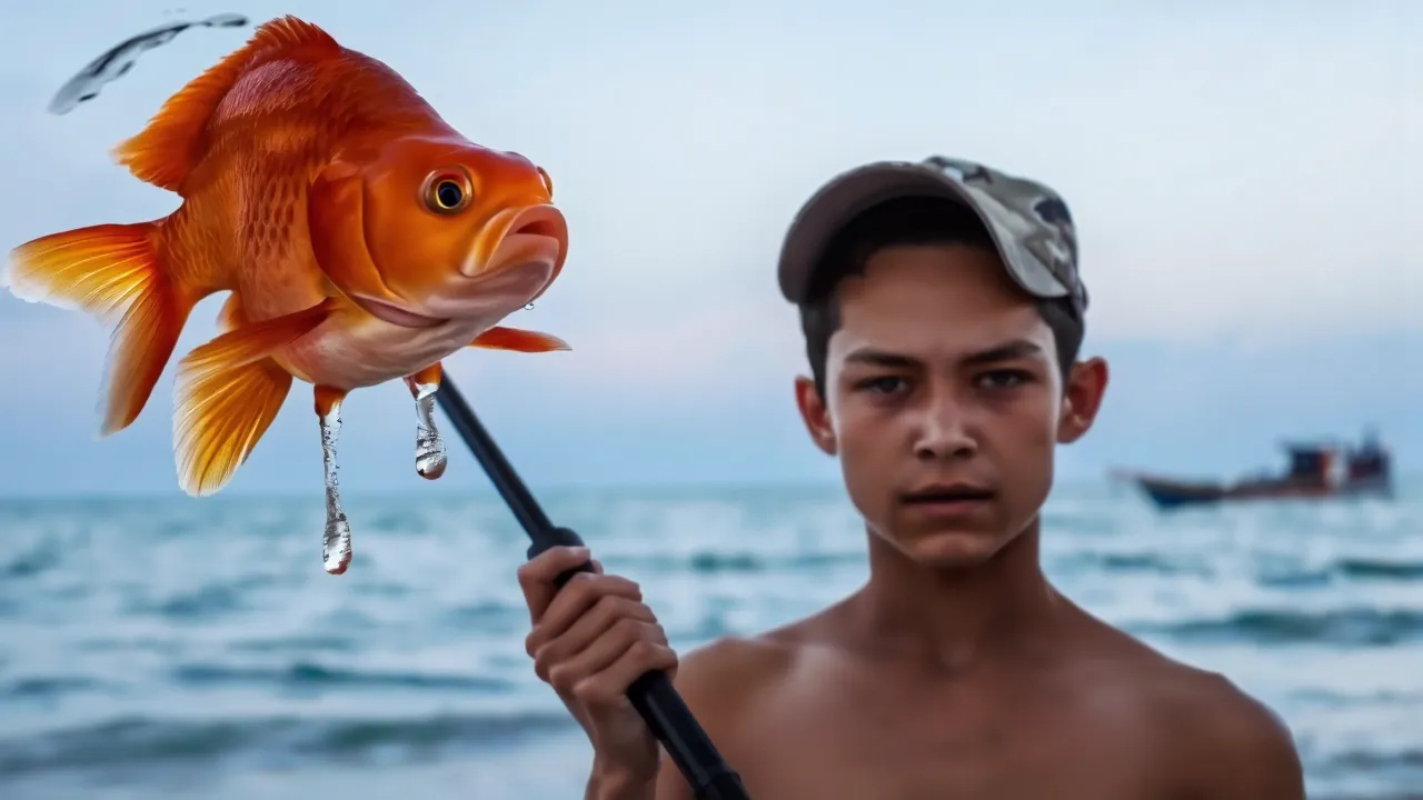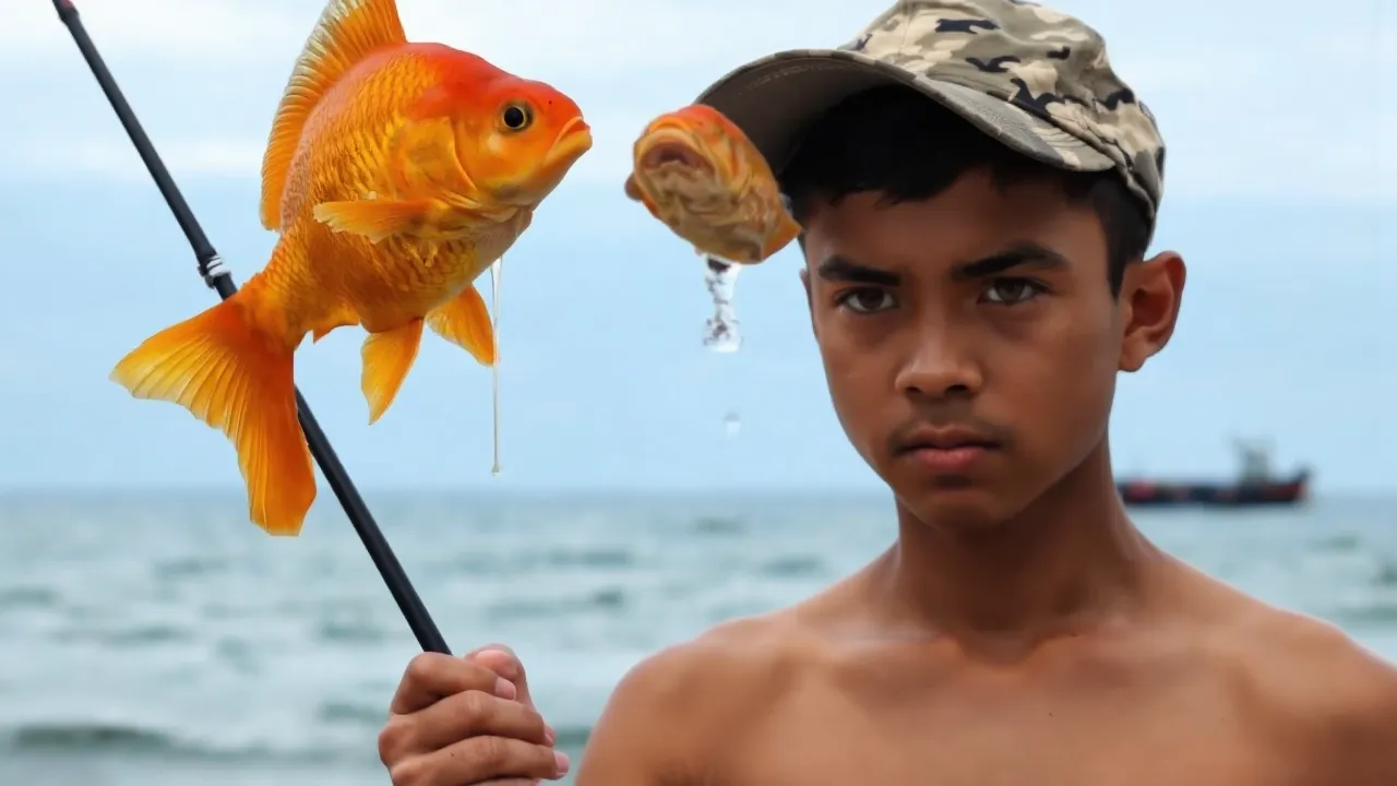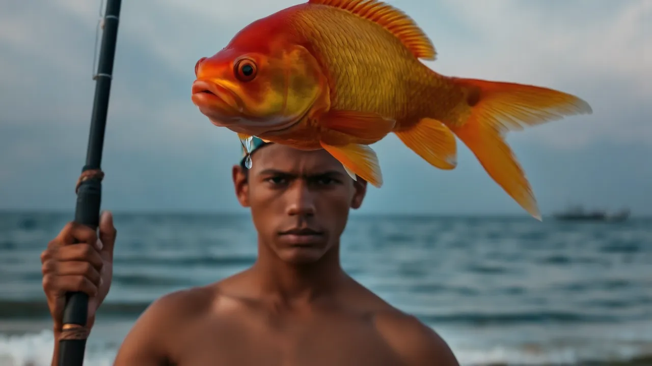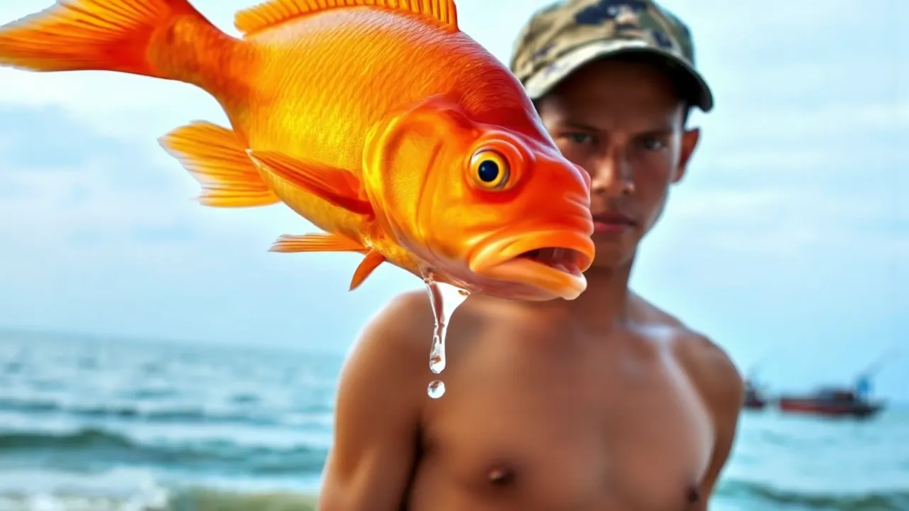 Photograph of a young man standing on a beach, holding a fishing rod. He has an intense expression and is shirtless, wearing a camouflage cap. Above him, a large, vibrant orange goldfish floats, with water droplets glistening as they drip from its mouth. The background features calm ocean waves and a distant fishing boat under a subtle blue sky.