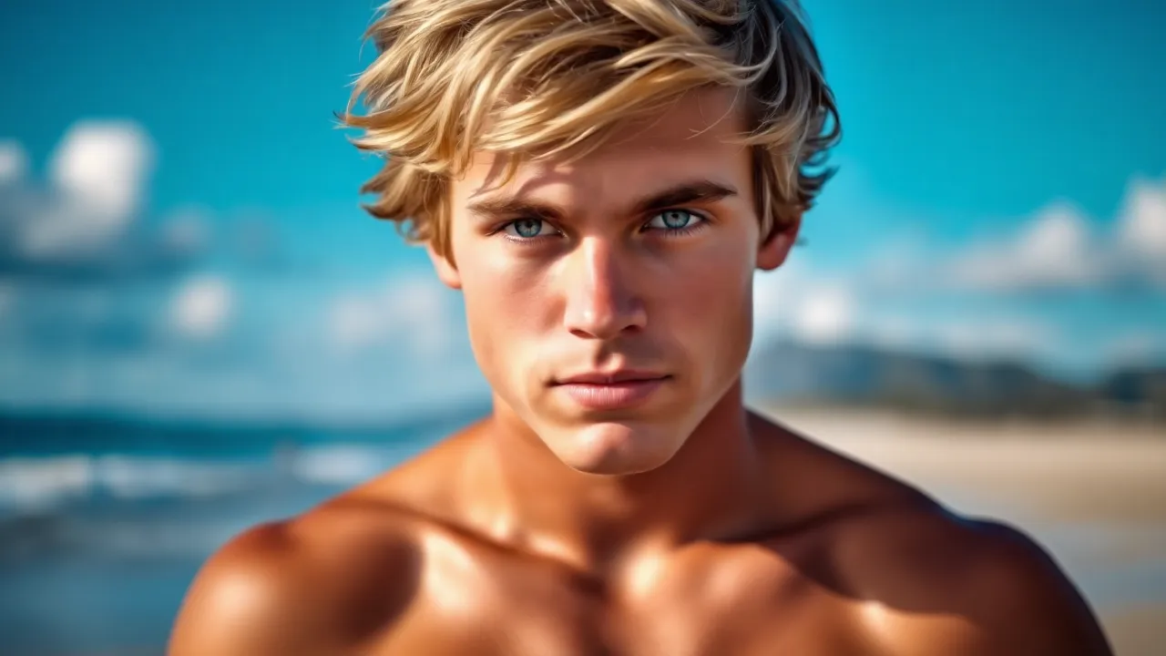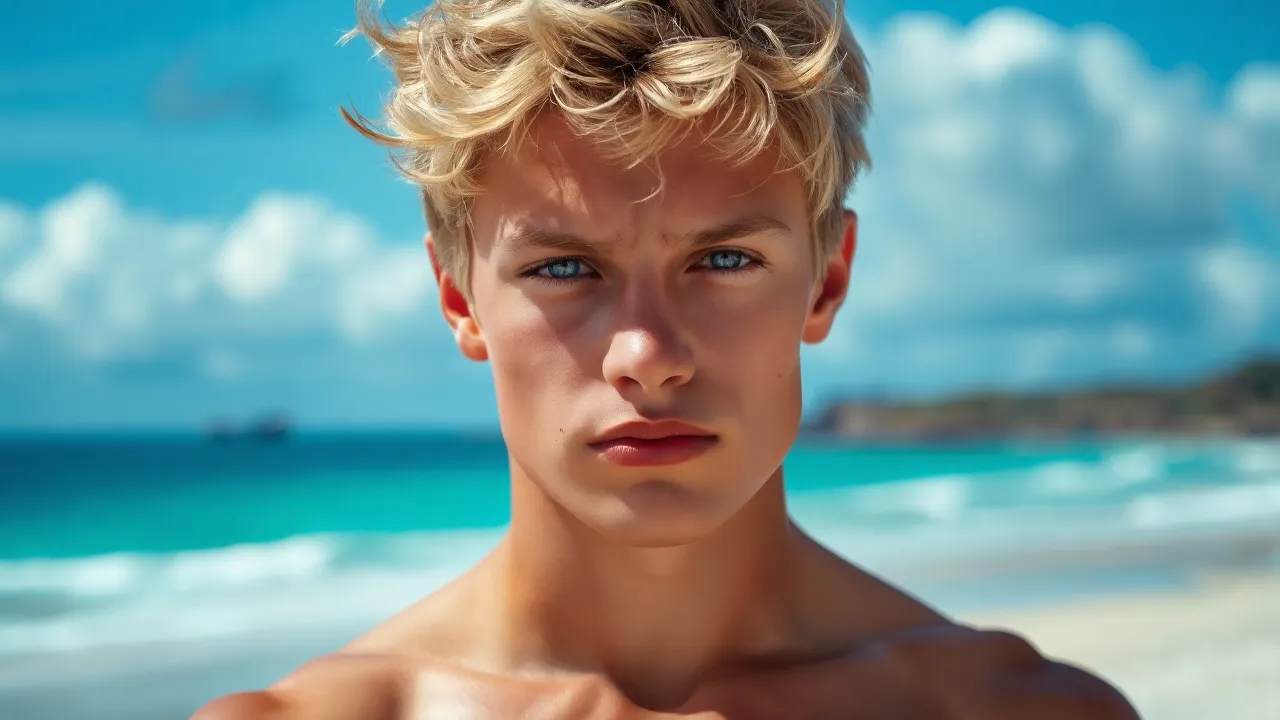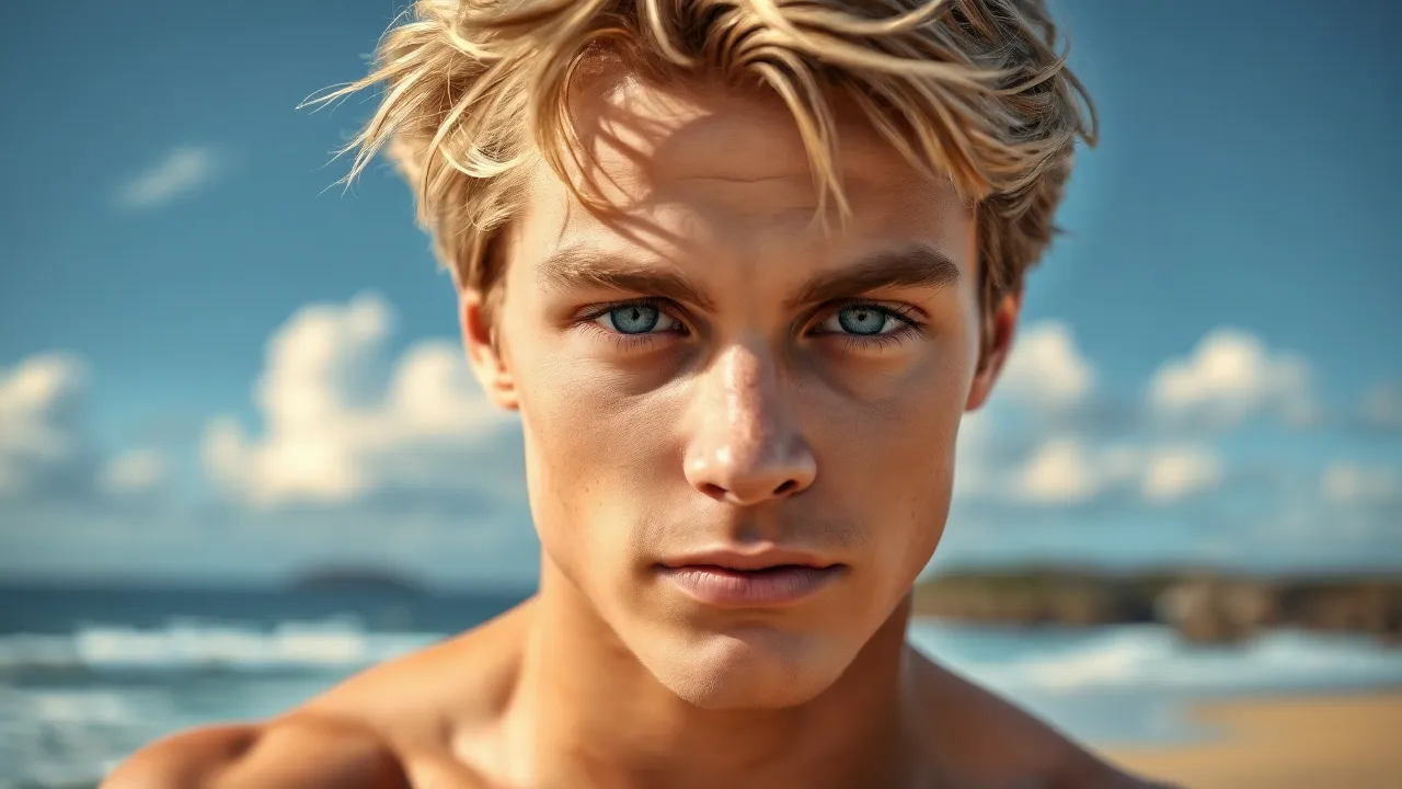 A close-up portrait of a young man with tousled sandy-blond hair and striking blue eyes, standing against a beach background. His muscular upper body is bare, revealing well-defined shoulders and a smooth, sun-kissed complexion. In the background, soft clouds and a coastal landscape can be seen, enhancing the vibrant, natural surroundings. The overall mood is youthful and serene, conveying a sense of confidence and tranquility.