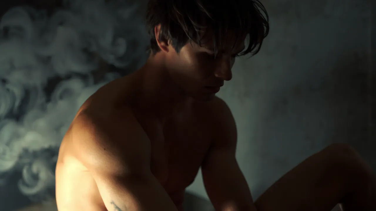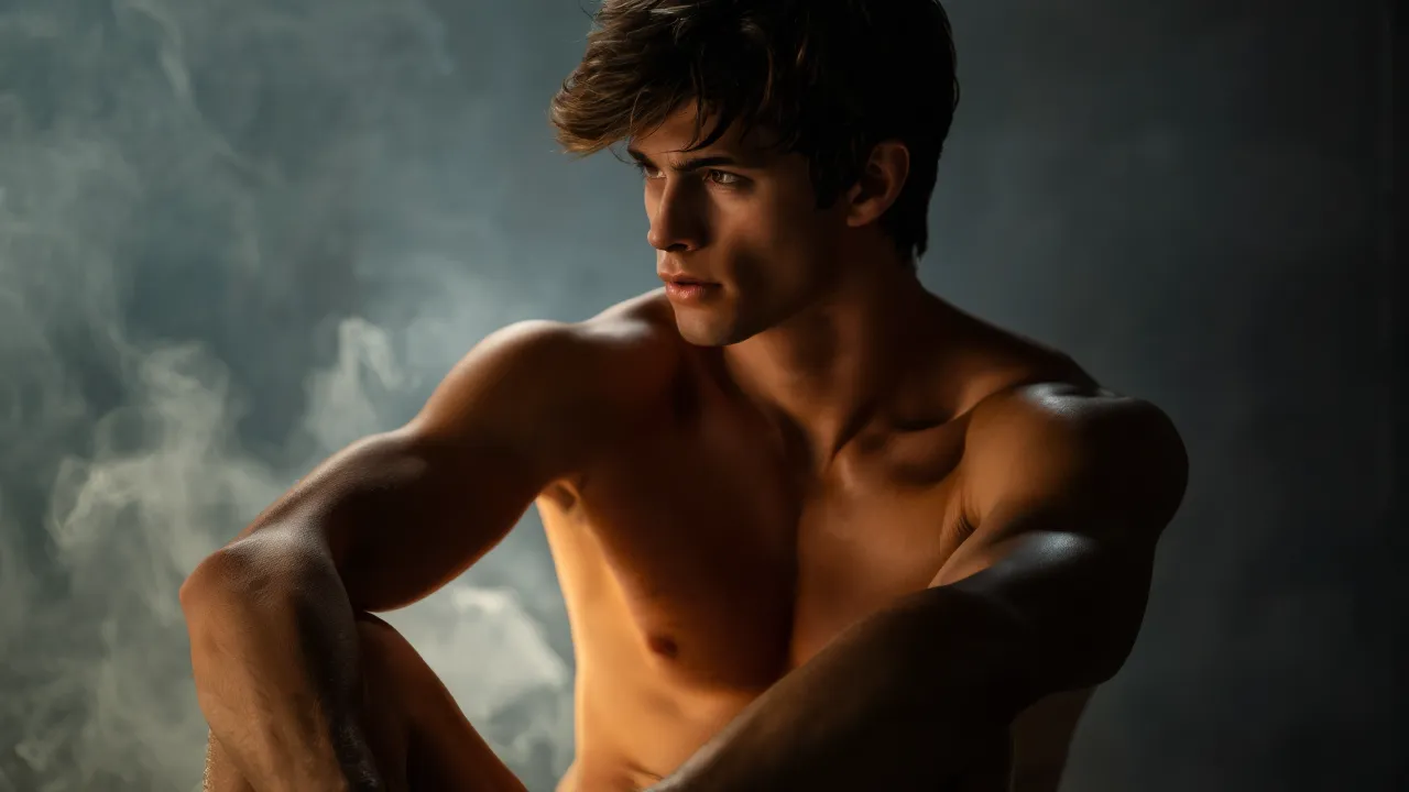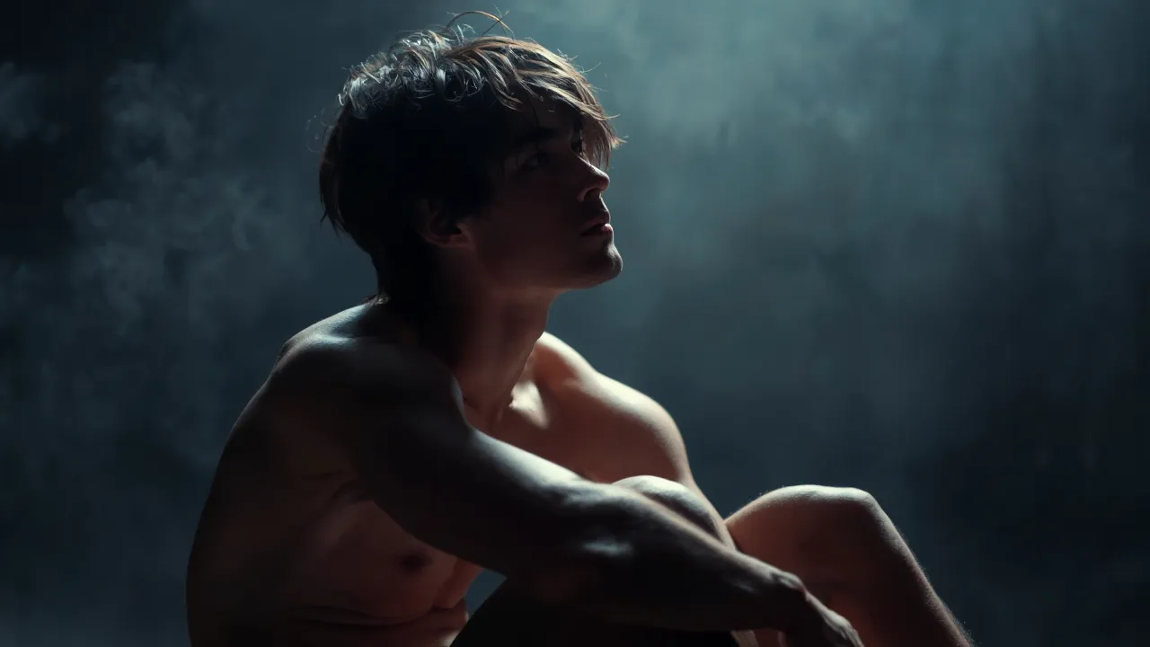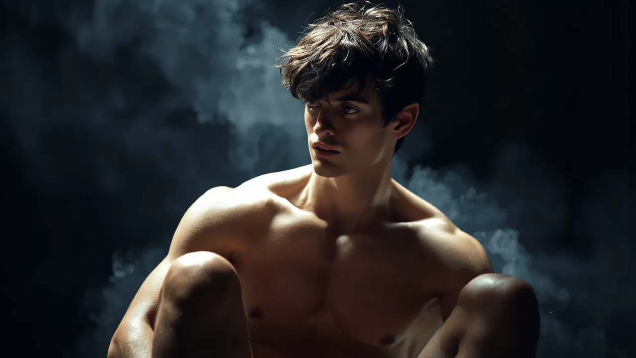 A young man with disheveled hair sits in a thoughtful pose, his body illuminated by soft, ethereal lighting that creates a hazy, dreamlike background. The light highlights his toned physique, accentuating his muscles and contours. The atmosphere suggests tranquility and introspection.