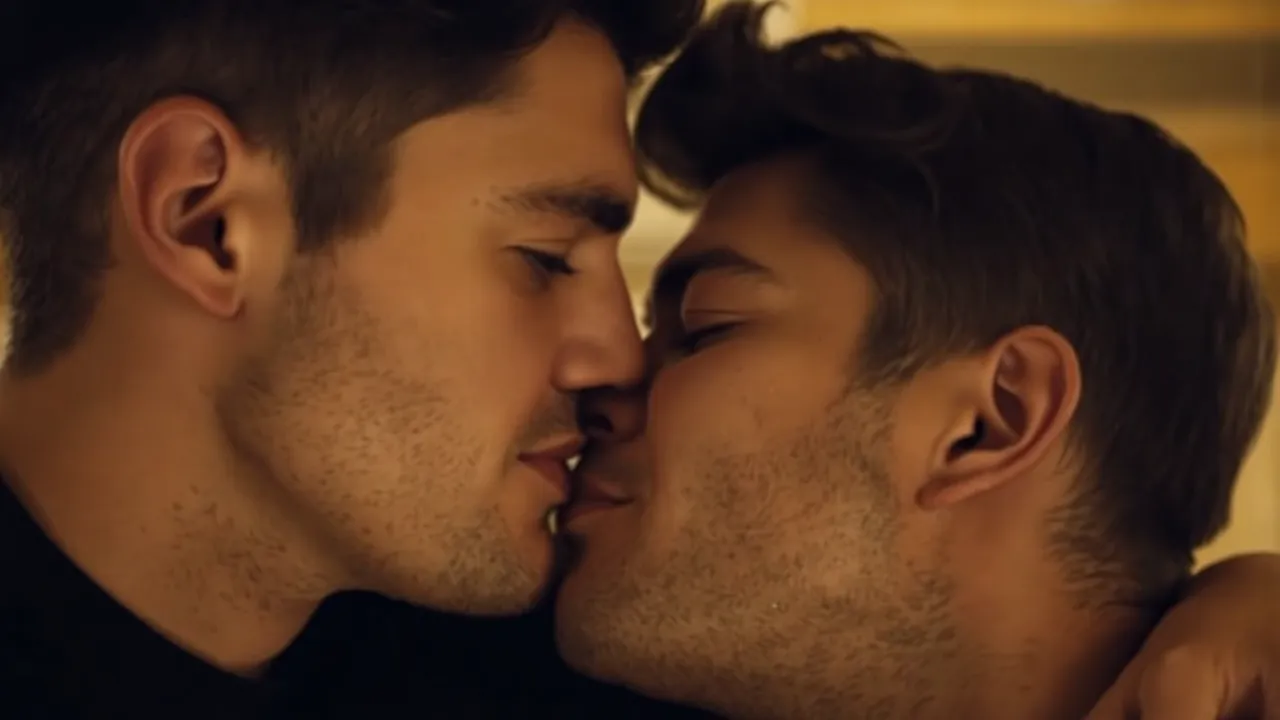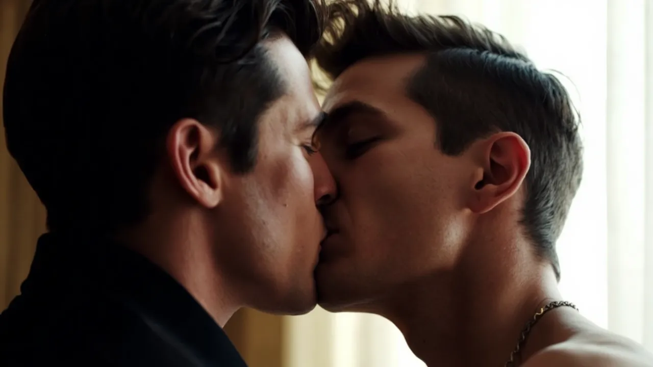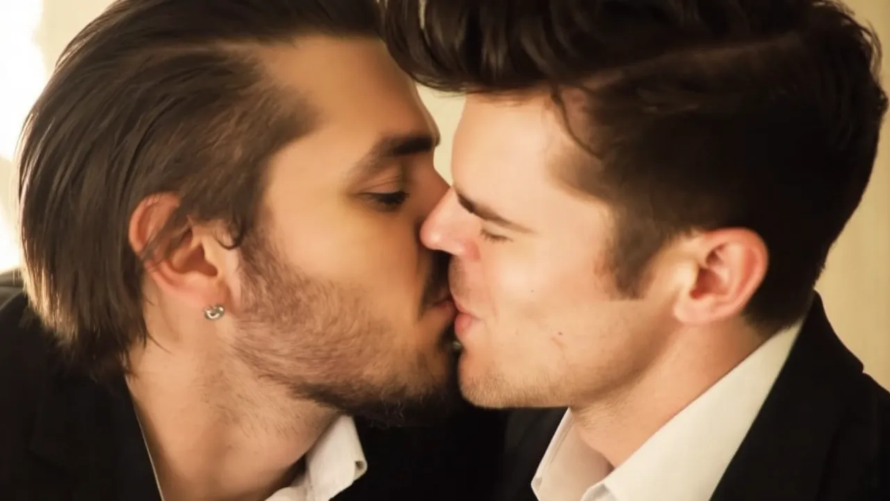 A close-up of two men kissing softly, their lips almost touching. Both have elegantly styled hair, and the soft lighting creates an intimate and warm atmosphere. The background is slightly blurred, emphasizing their connection. They seem to share a tender moment, radiating affection and warmth.