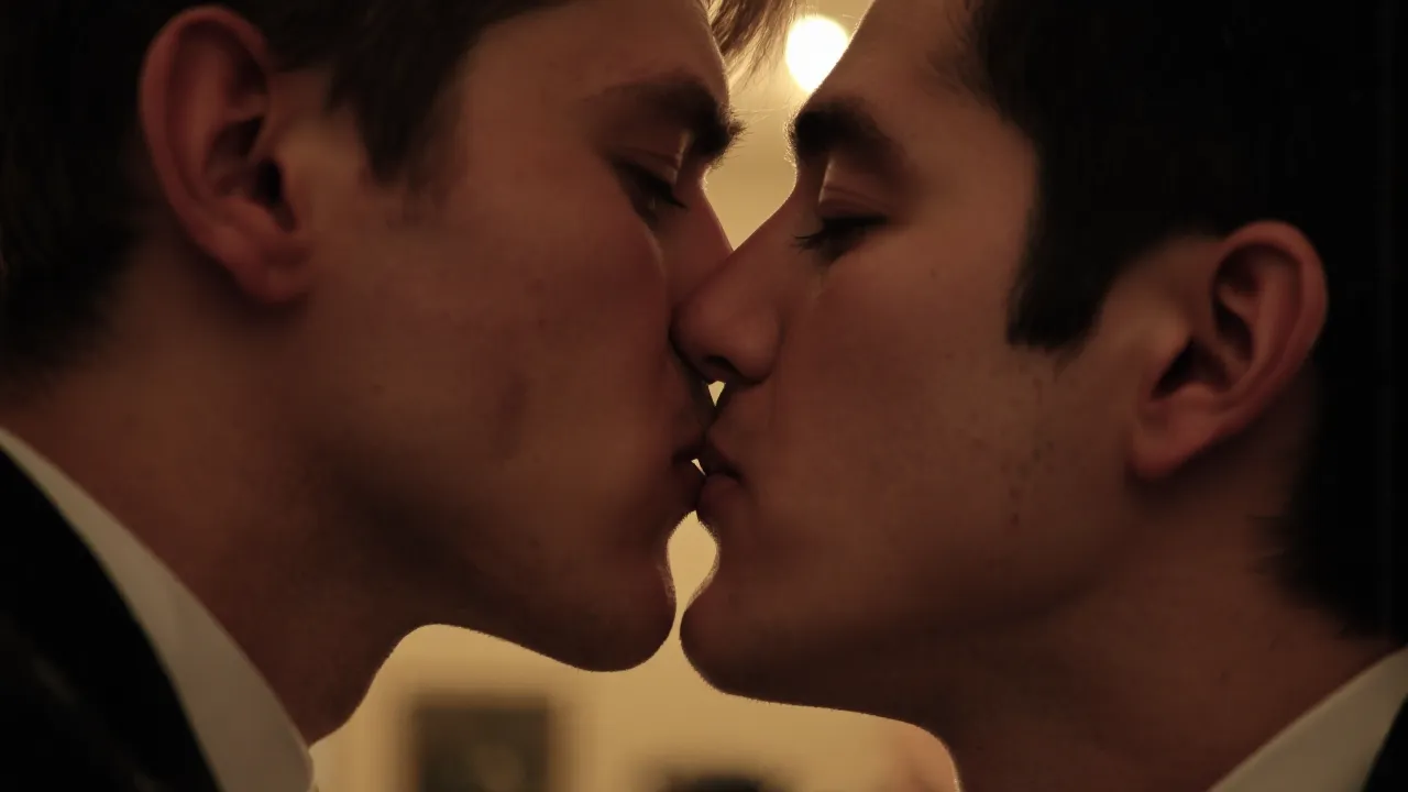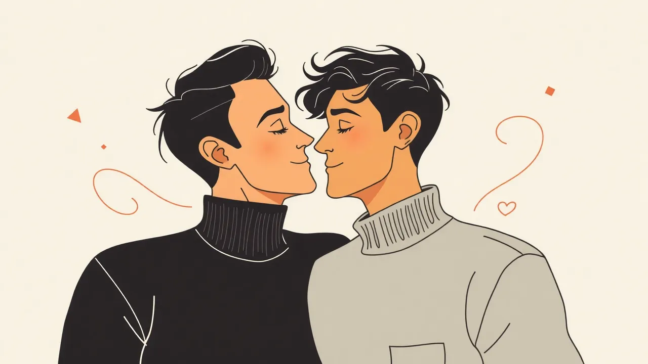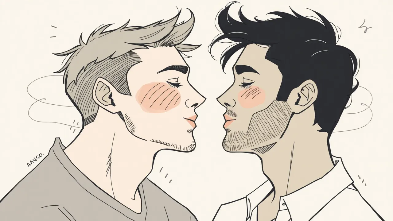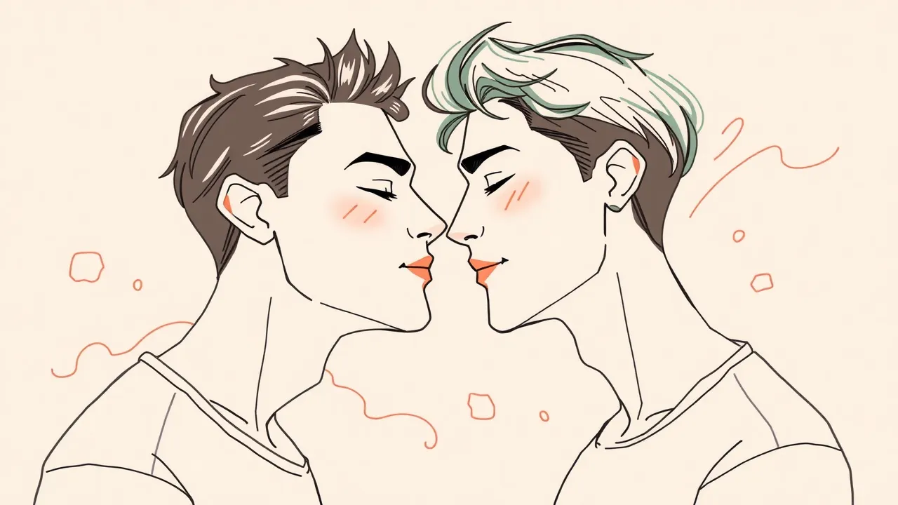 A close-up of two men kissing softly, their lips almost touching. Both have elegantly styled hair, and the soft lighting creates an intimate and warm atmosphere. The background is slightly blurred, emphasizing their connection. They seem to share a tender moment, radiating affection and warmth.