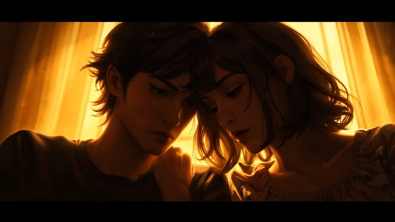 A warm and intimate scene depicting two young people leaning gently toward each other, their heads almost touching. Soft golden light filters through a window, creating a serene atmosphere. The figures each have wavy hair; one rests his eyes, while the other gazes thoughtfully. Their expressions convey a sense of connection and tenderness, highlighting a moment of closeness and contemplation.