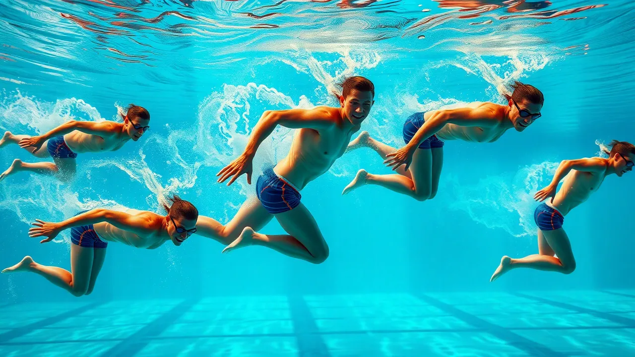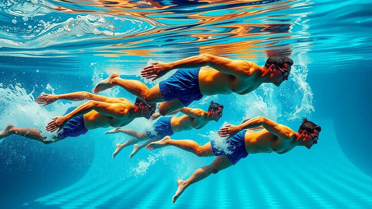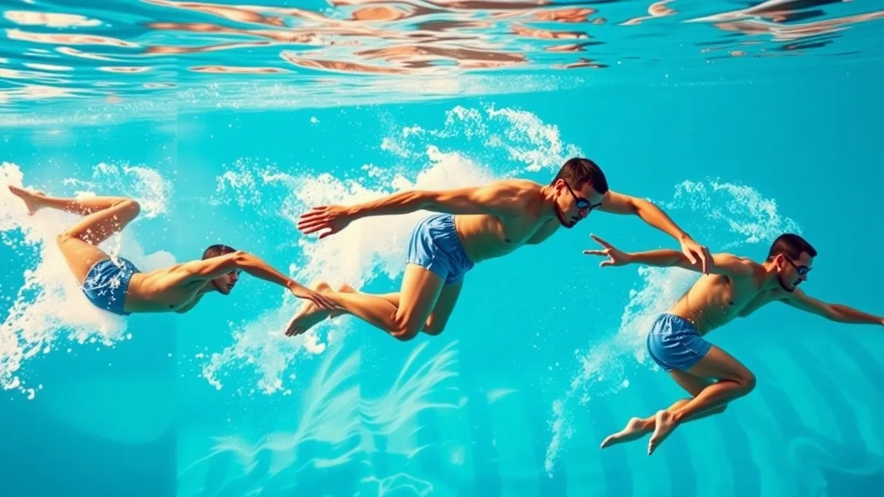 A dynamic photograph of a swimmer, depicted in a sequence of underwater strokes. The swimmer, depicted in various positions, has an athletic build and wears blue swim shorts. The work captures the fluid motion of swimming, with splashes and reflections creating a vibrant palette of warm blues, enhancing the sense of movement and depth in the water.