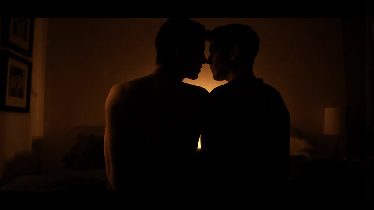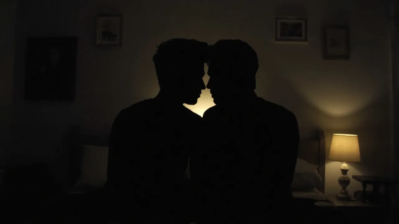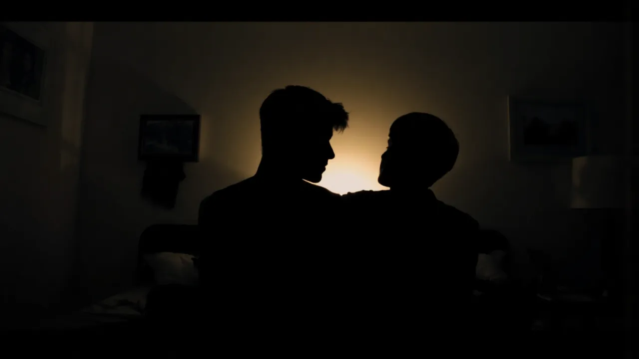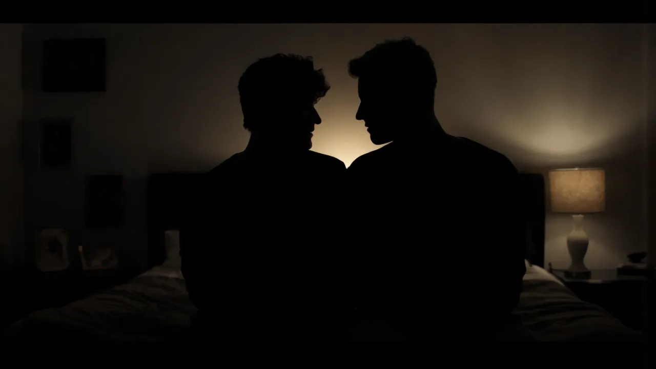 A dimly lit room features two young men sitting together on a bed, their silhouettes enhancing the intimate atmosphere. They gaze at each other, their foreheads almost touching, conveying a sense of connection. A soft, warm light emanates from behind them, highlighting their figures against the muted tones of the room, which includes framed photographs on the walls and a bedside lamp. The overall atmosphere is tender and romantic.