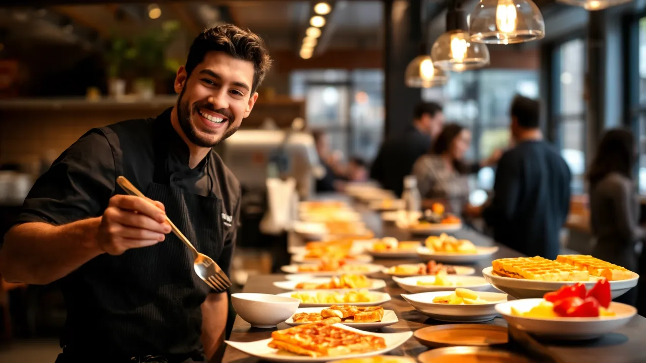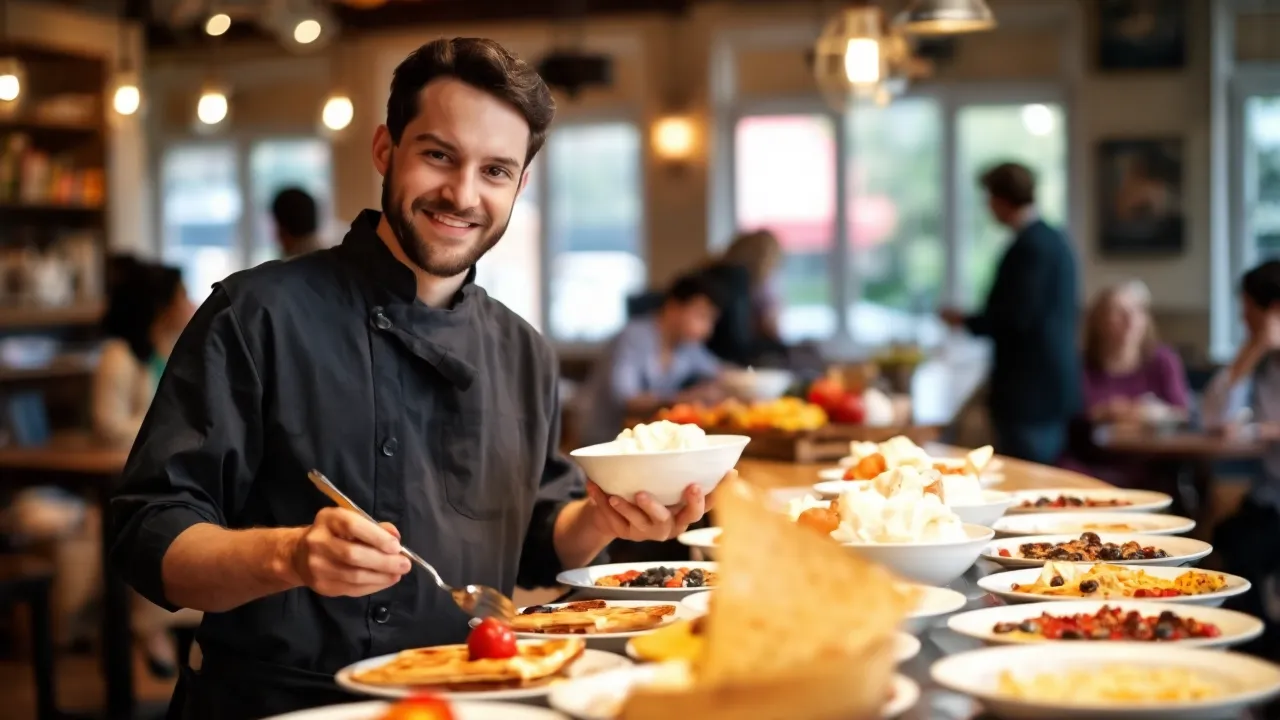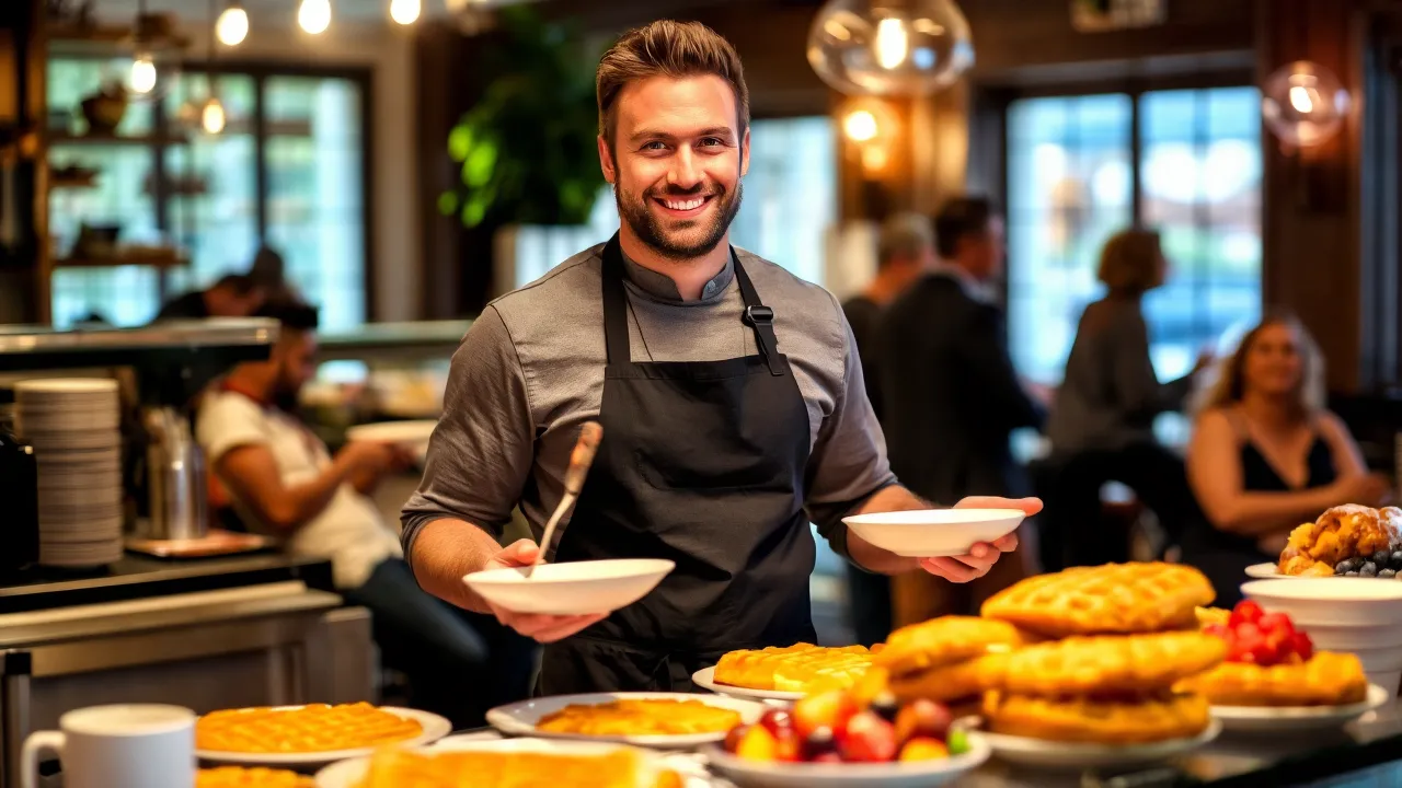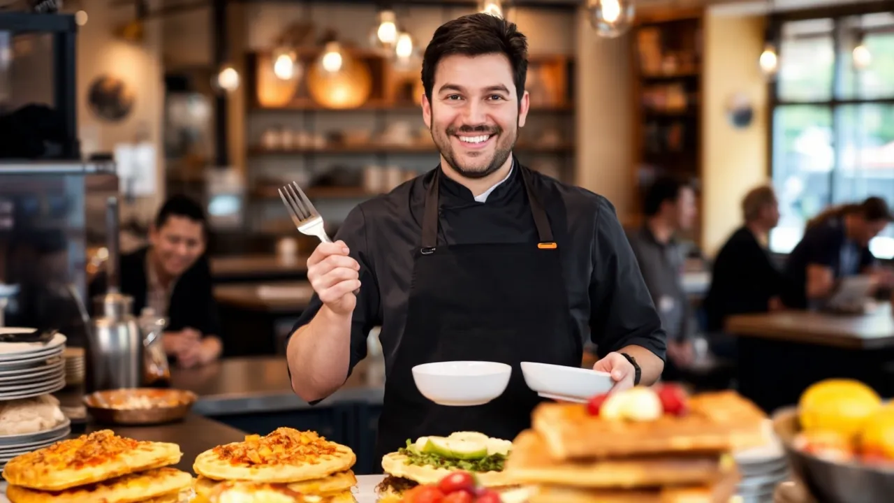 A smiling male chef in a black apron stands at a counter filled with colorful dishes, including waffles and fruit. He holds a fork in one hand and a bowl in the other, preparing to serve. The background features a bright, cozy café atmosphere with warm lighting and people engaged in conversation.