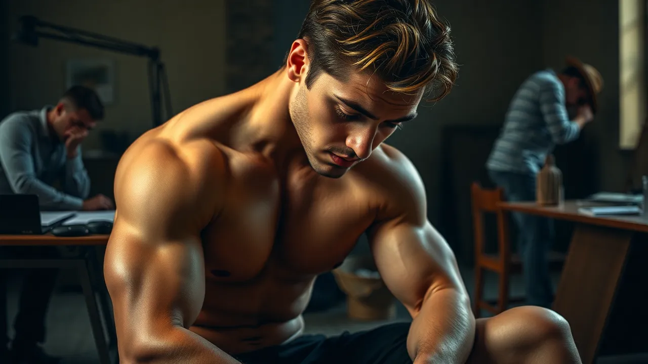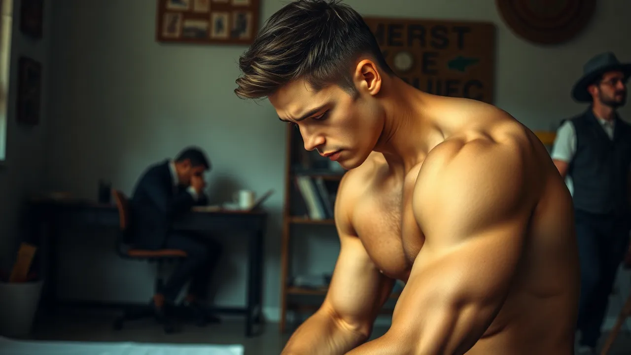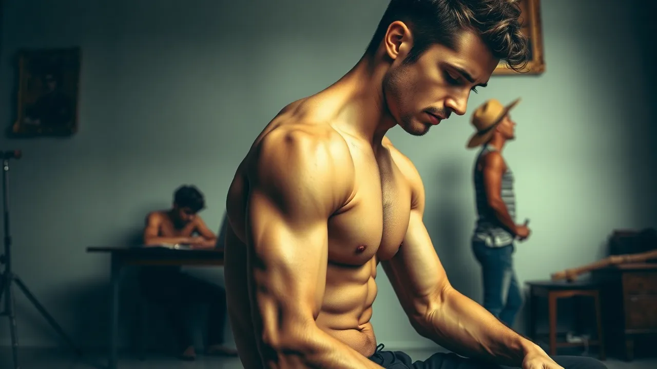 A muscular young man in the foreground, seated with his head bowed and a contemplative expression. He’s shirtless and displays defined abs and a toned physique. In the background, two other figures can be seen: one seated at a desk, deep in thought, and the other standing, wearing a hat, looking toward the main subject. The overall composition conveys a sense of artistic focus and study.