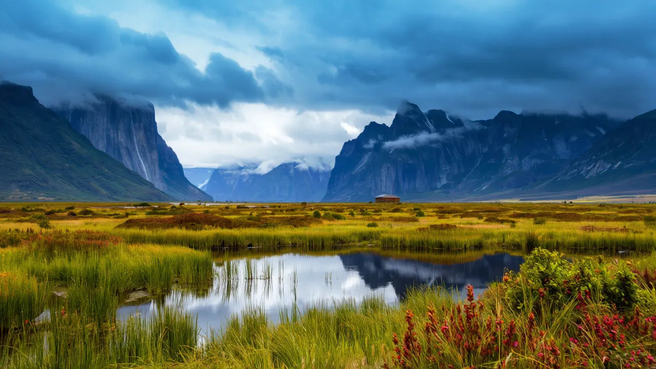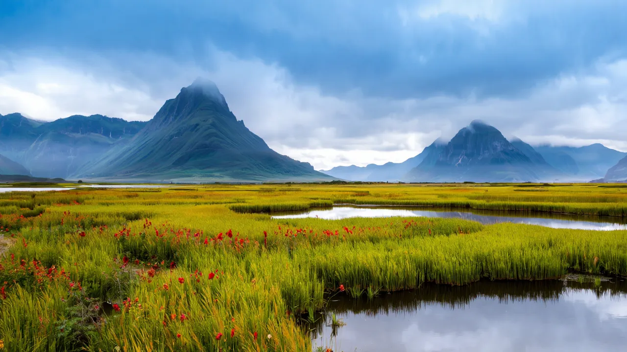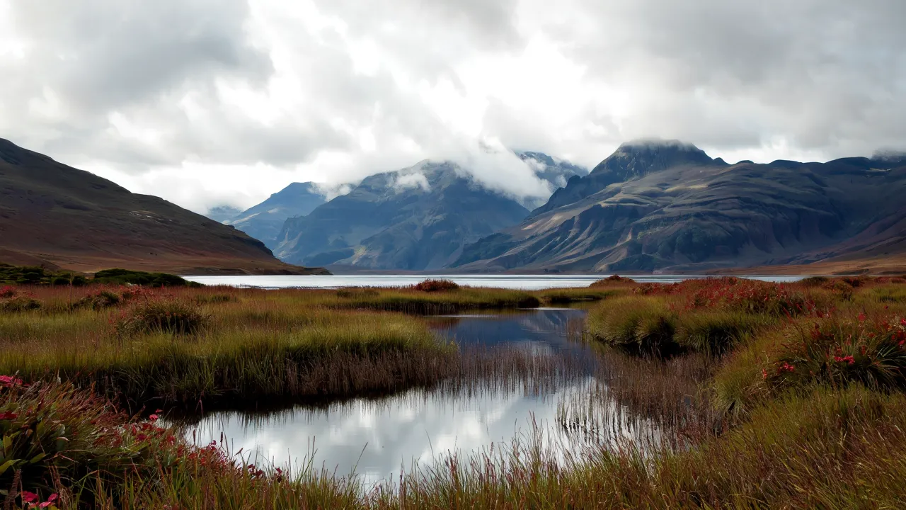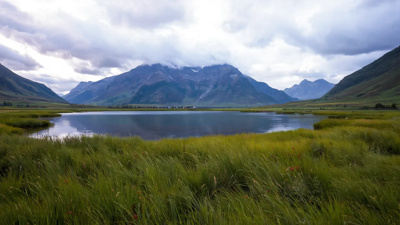A serene landscape featuring a reflective body of water in the foreground, surrounded by lush grasses with reddish flowers. In the background, towering mountains rise, partially obscured by a dramatic, cloudy sky. The scene conveys a sense of tranquility and natural beauty.
