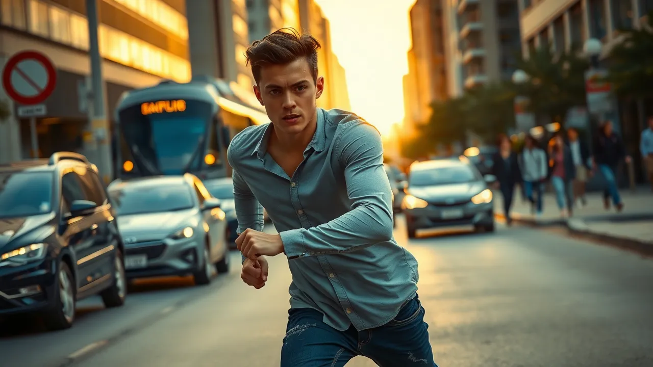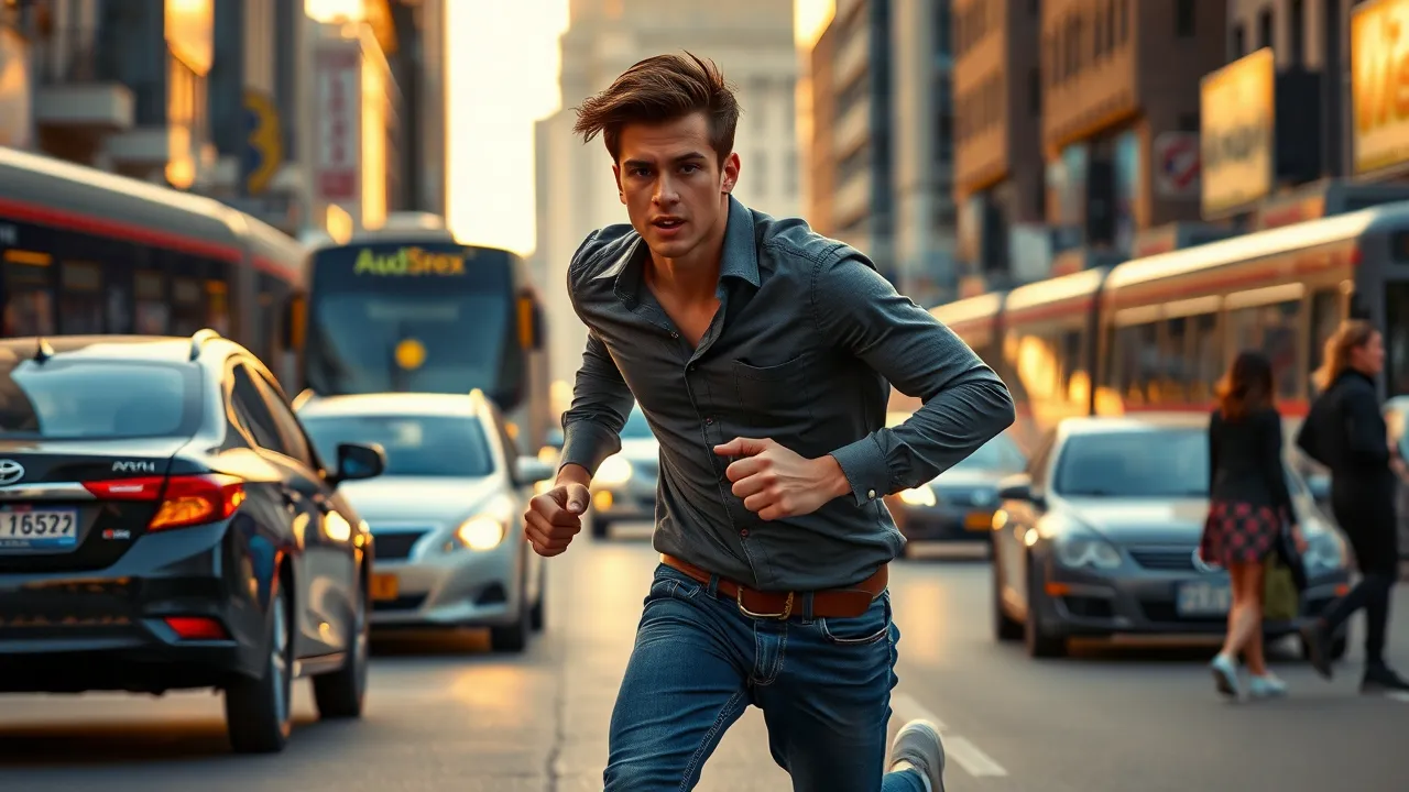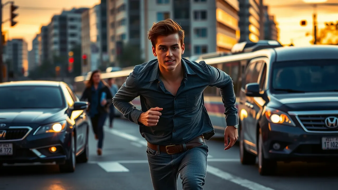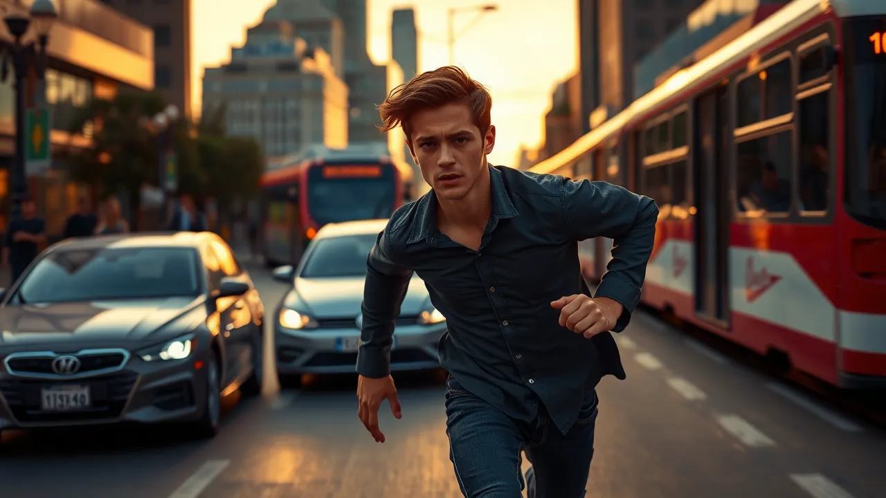 A dynamic urban scene featuring a young man mid-run. Wearing a long-sleeved shirt and jeans, his expression is intense as he navigates a busy city street. The background shows blurred traffic, including cars and a train, with pedestrians looking on. The overall atmosphere conveys urgency, with the sunset lighting creating dramatic shadows and reflections.