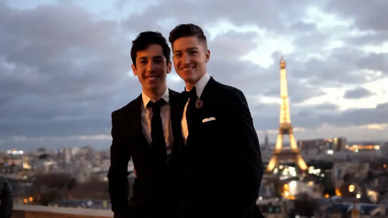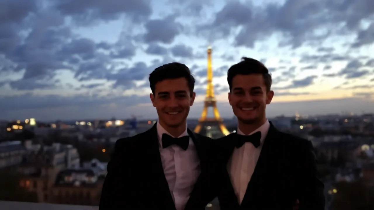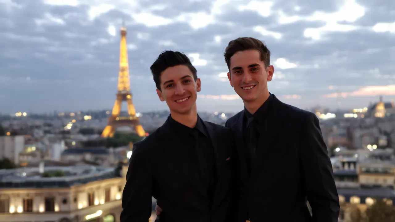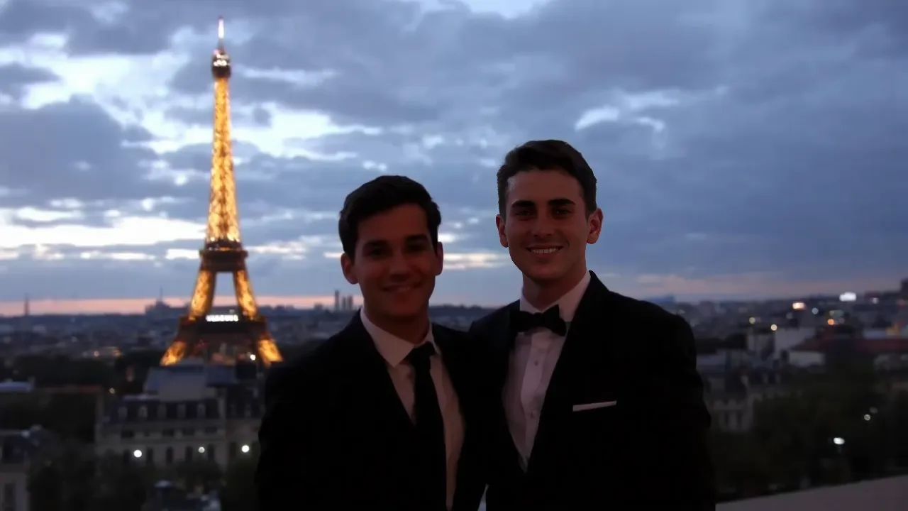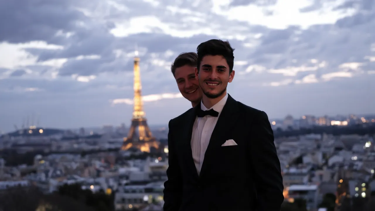 A pair of young men in formal black suits stand close together, smiling at the camera. Behind them, the Eiffel Tower is illuminated against a twilight sky filled with soft gray clouds. The city of Paris spreads out below, its lights beginning to twinkle as night falls. The scene captures a moment of joy and celebration in a romantic urban setting.