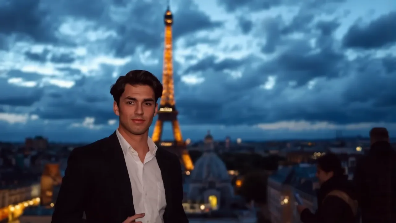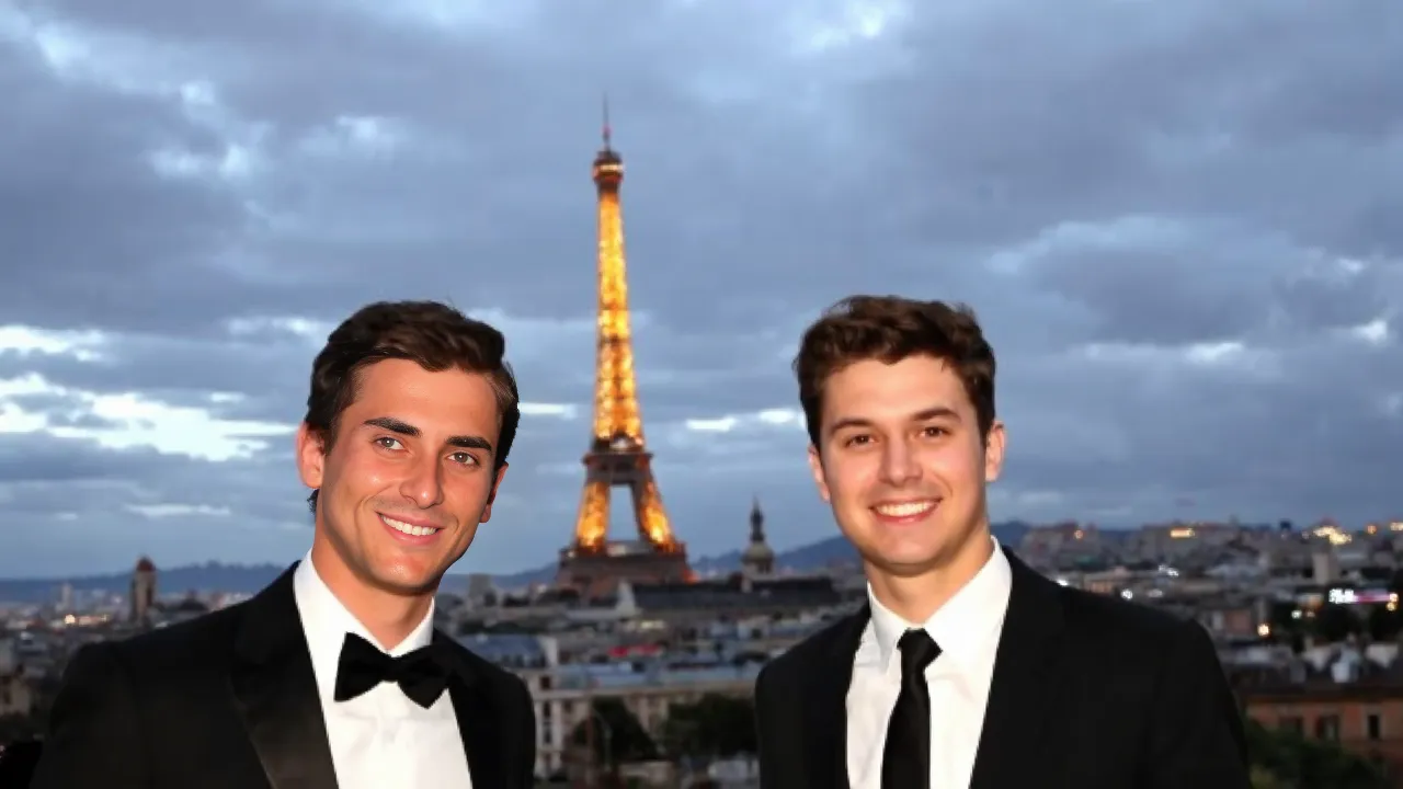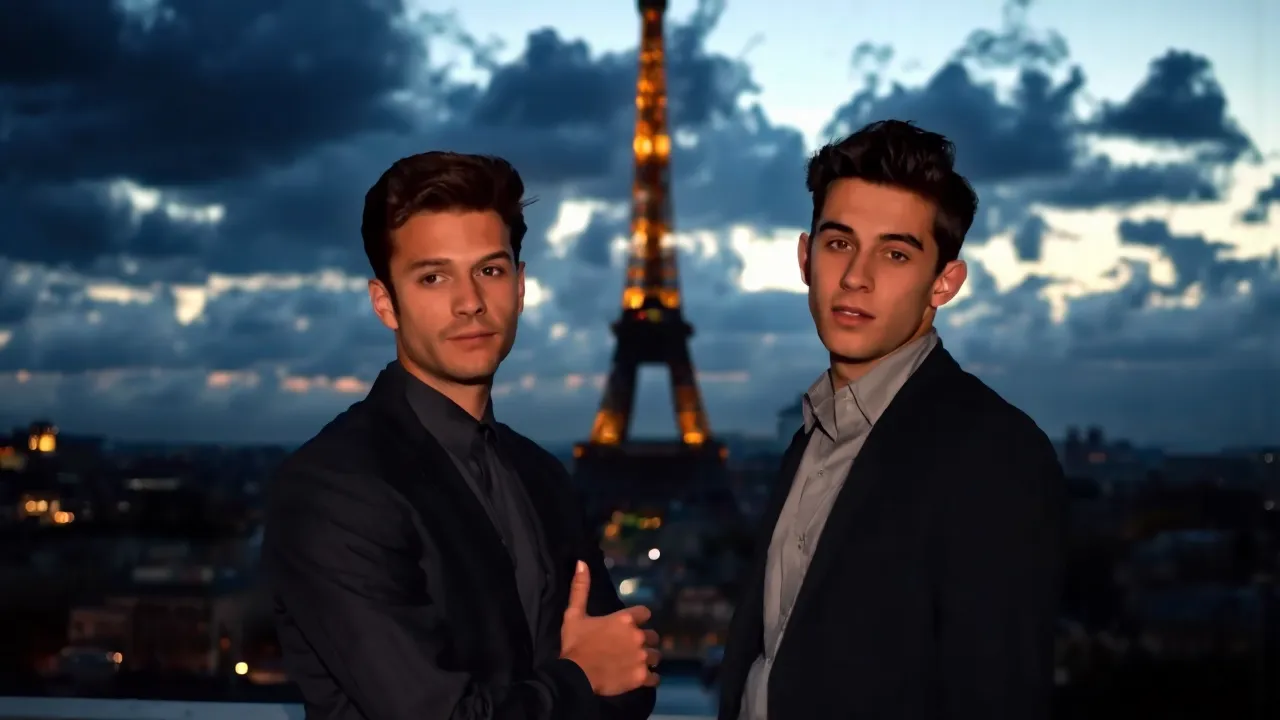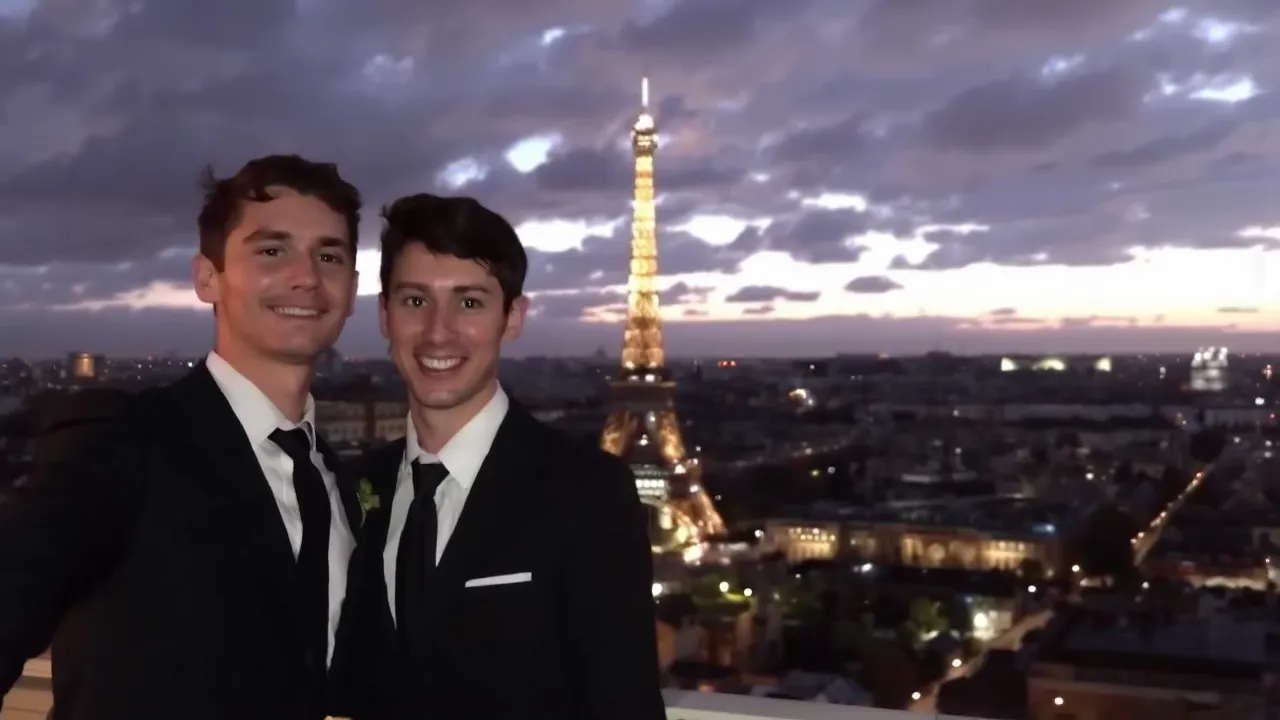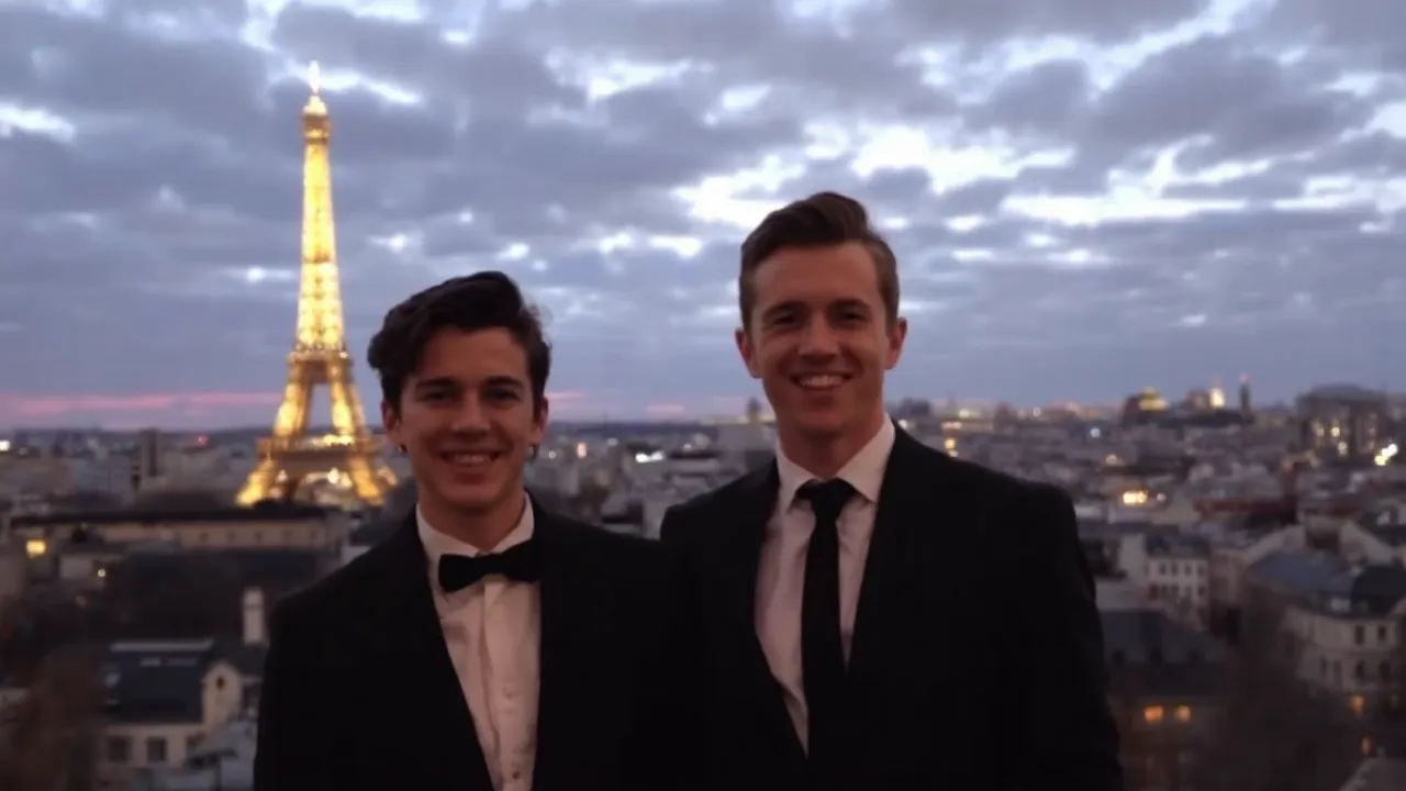 A pair of young men in formal black suits stand close together, smiling at the camera. Behind them, the Eiffel Tower is illuminated against a twilight sky filled with soft gray clouds. The city of Paris spreads out below, its lights beginning to twinkle as night falls. The scene captures a moment of joy and celebration in a romantic urban setting.