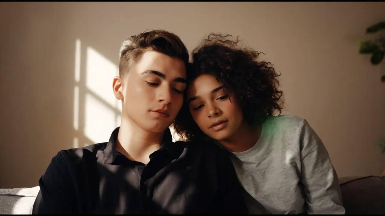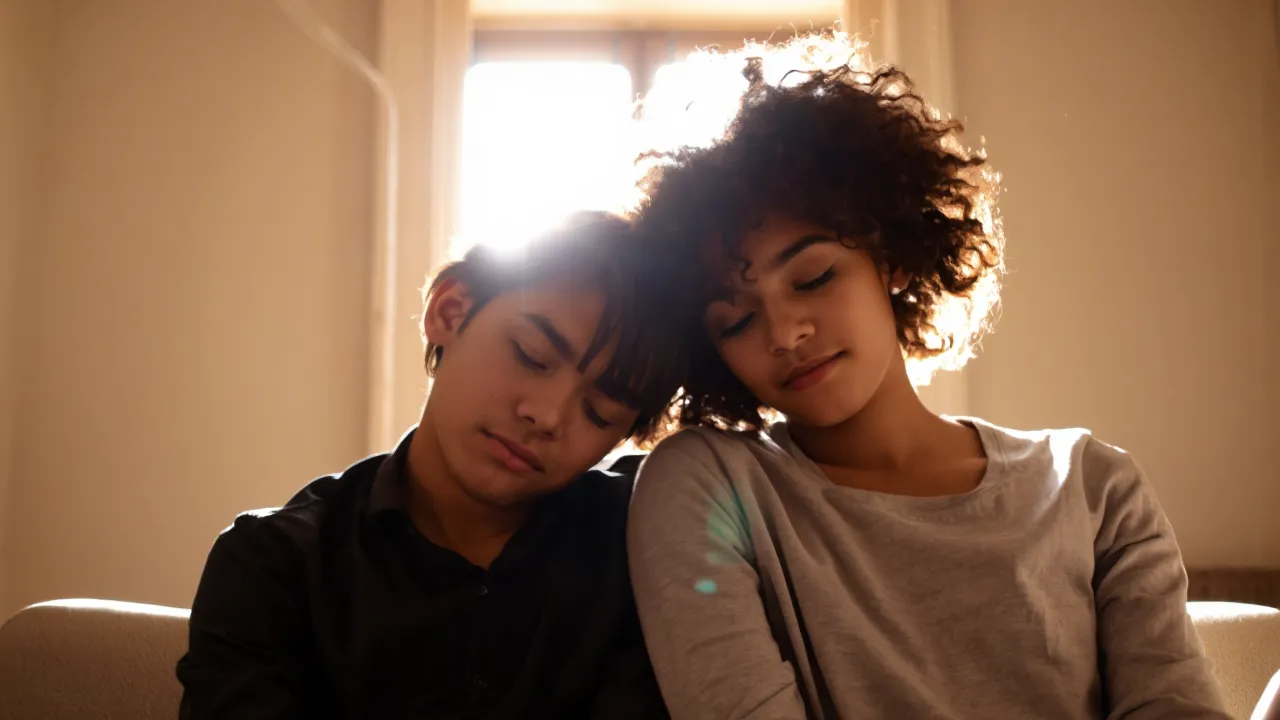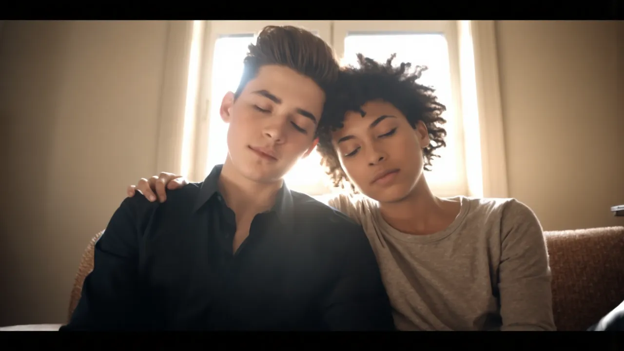 Two young people sit close together in a softly lit room. Sunlight streams in through a window and casts a warm glow on their faces. One has short, combed hair and wears a dark shirt, while the other has curly hair and wears a light, casual top. They lean against each other, exuding a sense of intimacy and tenderness, with their eyes closed and gentle expressions. The background features muted colors and highlights, enhancing the serene atmosphere of the moment.