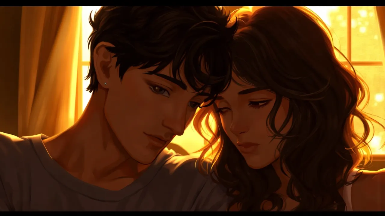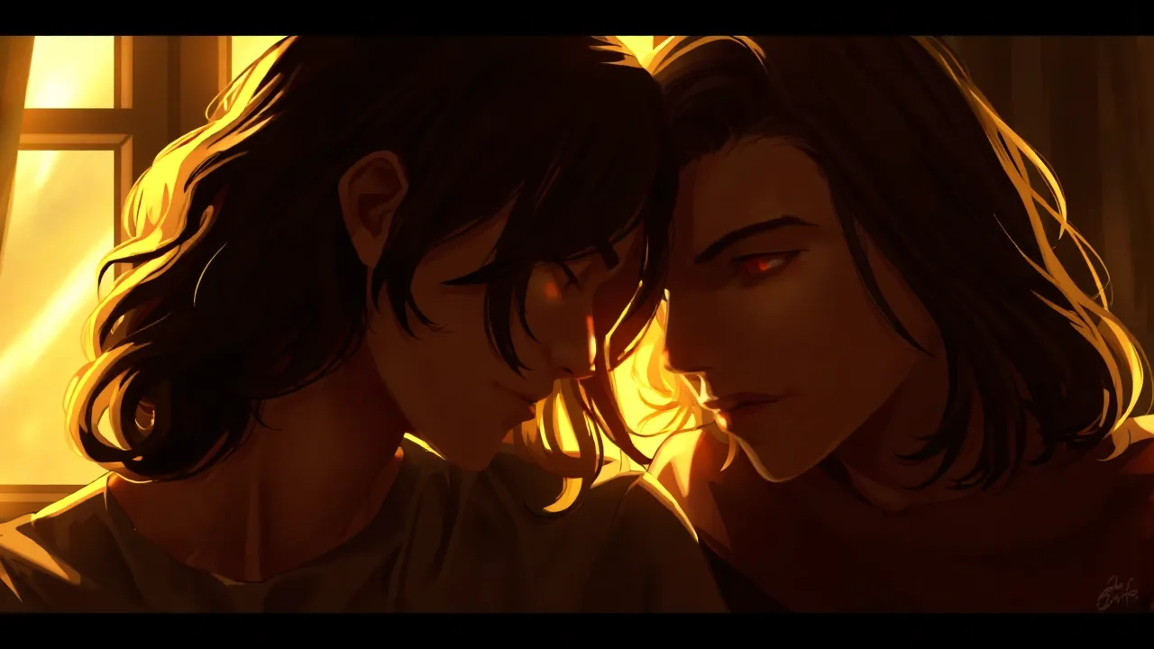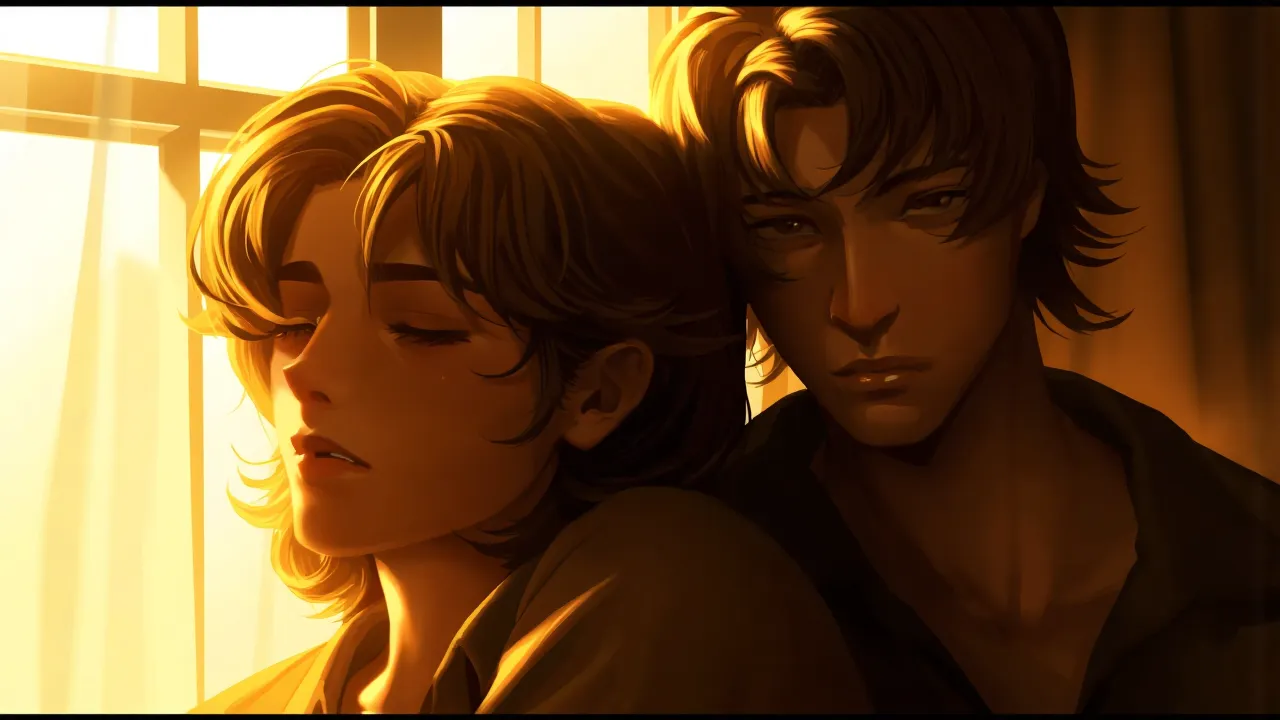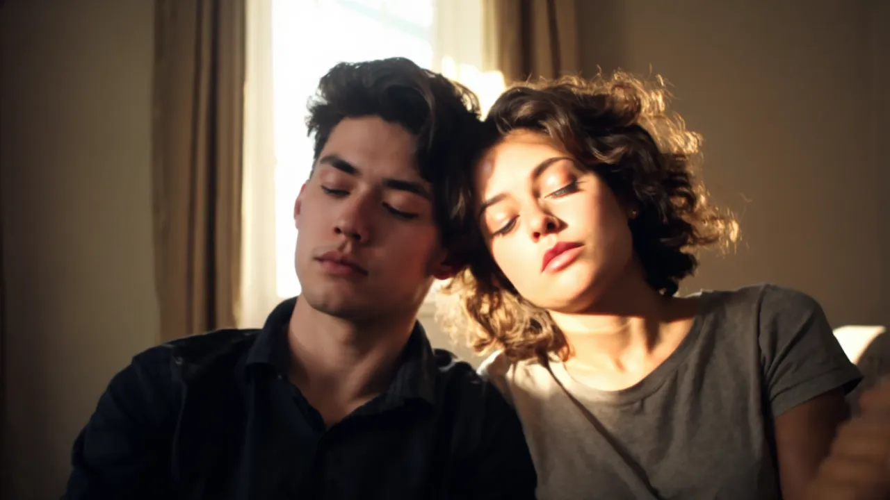 Two young people sit close together in a softly lit room. Sunlight streams in through a window and casts a warm glow on their faces. One has short, combed hair and wears a dark shirt, while the other has curly hair and wears a light, casual top. They lean against each other, exuding a sense of intimacy and tenderness, with their eyes closed and gentle expressions. The background features muted colors and highlights, enhancing the serene atmosphere of the moment.
