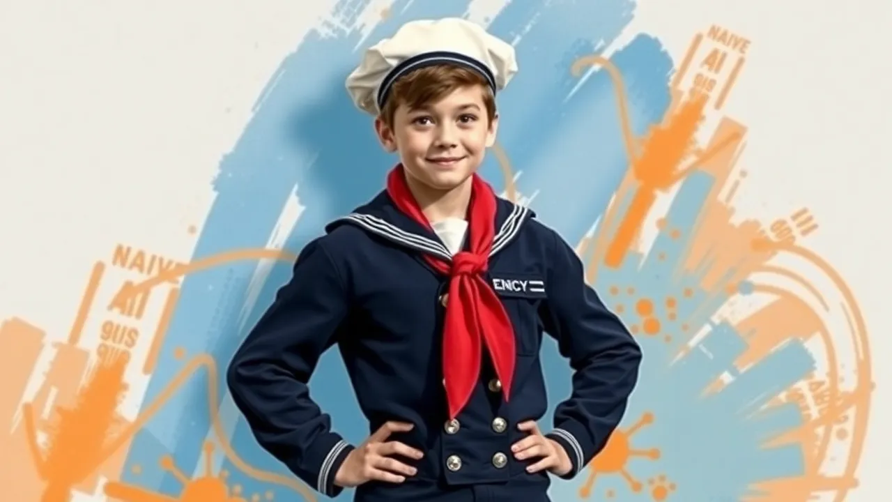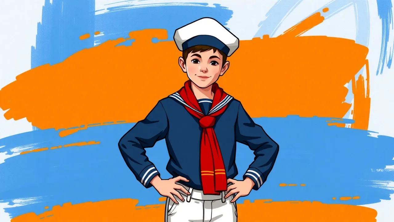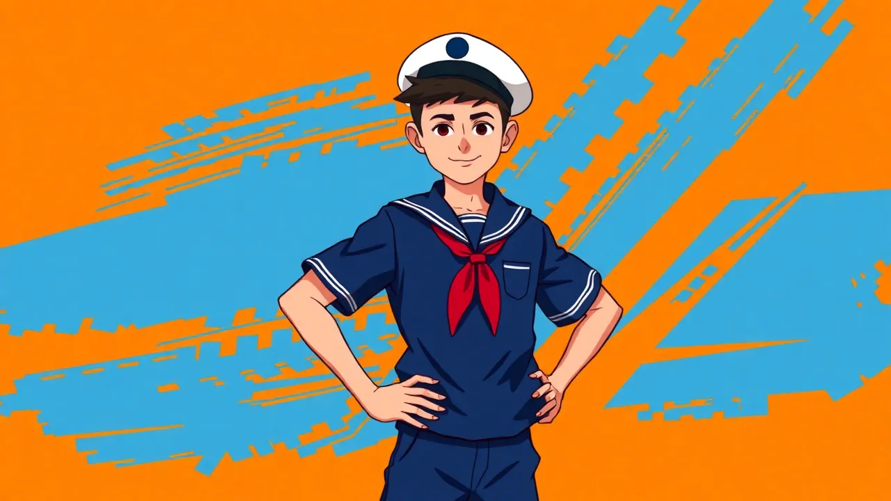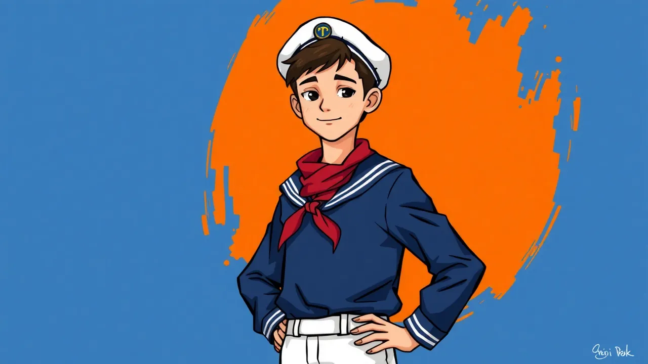 A stylized portrait of a young sailor standing confidently with his hands on his hips. He wears a traditional navy blue uniform, complete with a white hat and red scarf. The background features bold strokes of blue and orange, creating an energetic and artistic atmosphere that enhances the sailor’s proud demeanor.