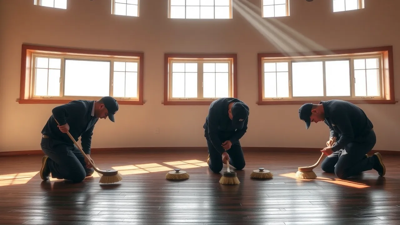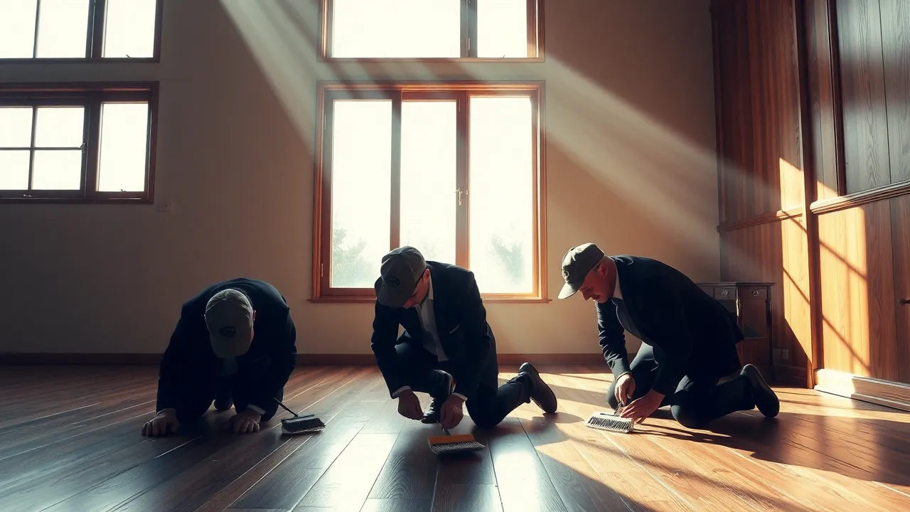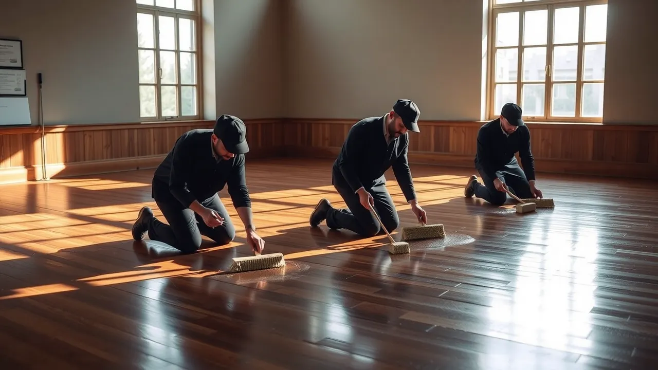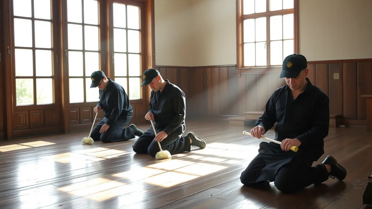 Three men kneel on a wooden floor, diligently cleaning with small brushes. They wear dark, formal attire and caps. Sunlight streams through large windows, casting soft shadows and illuminating the details of the room, creating a serene yet workmanlike atmosphere. The background features plain walls and simple wood paneling, enhancing the focus on the men’s work.