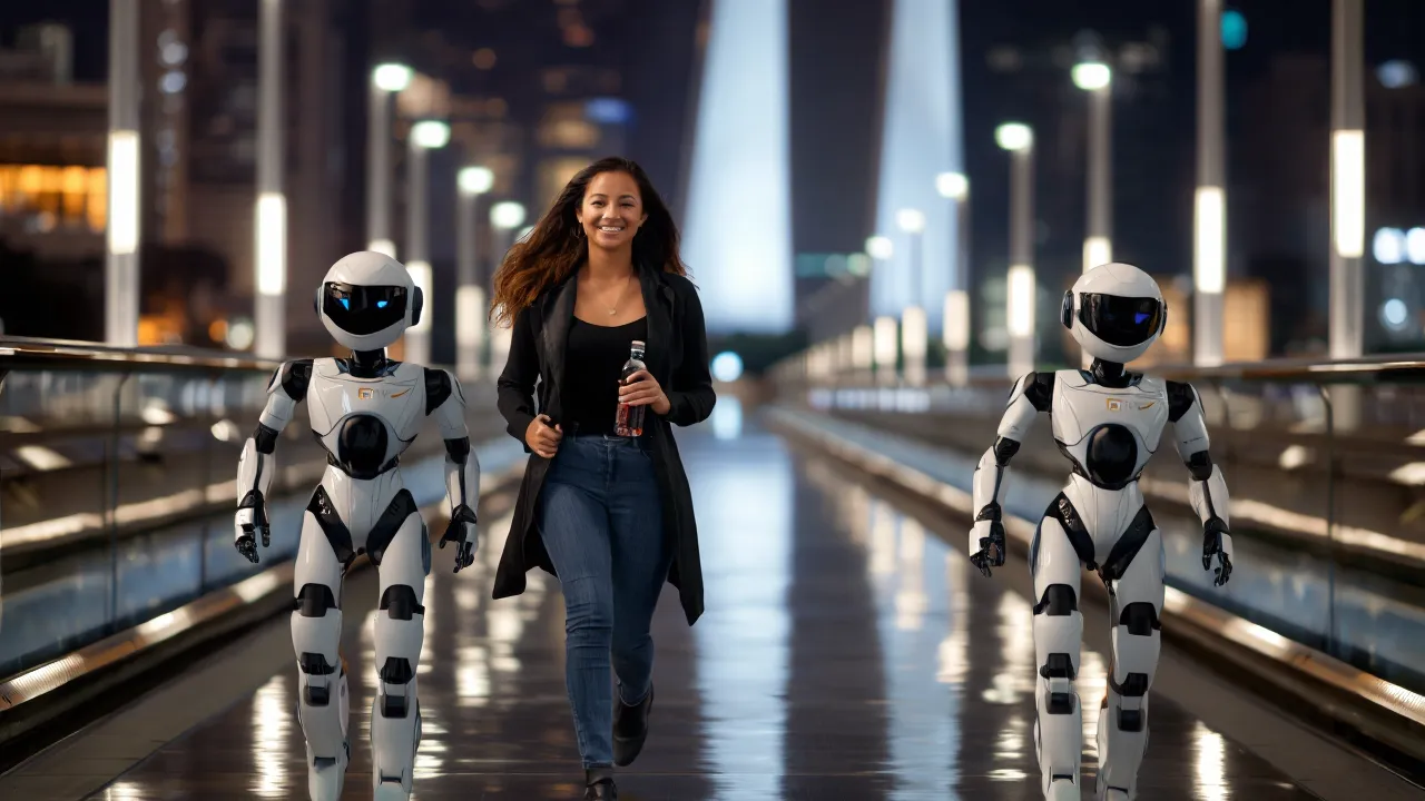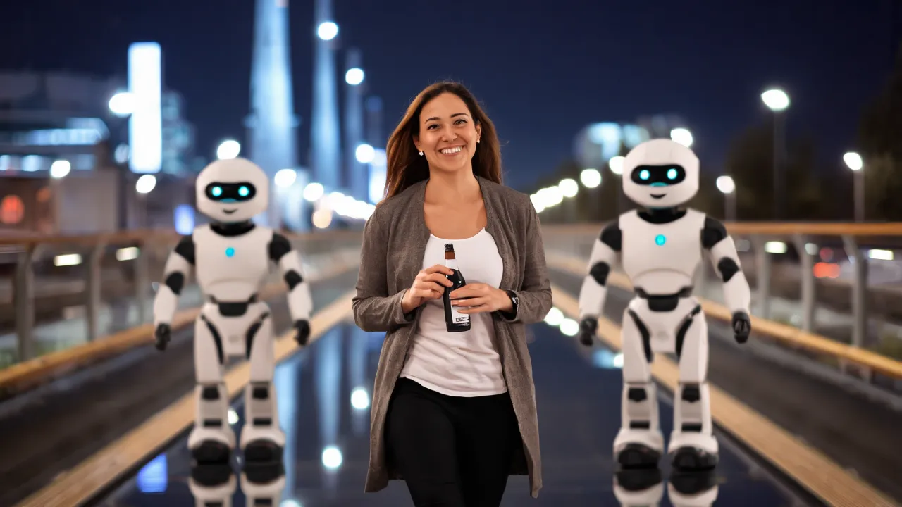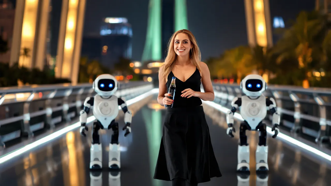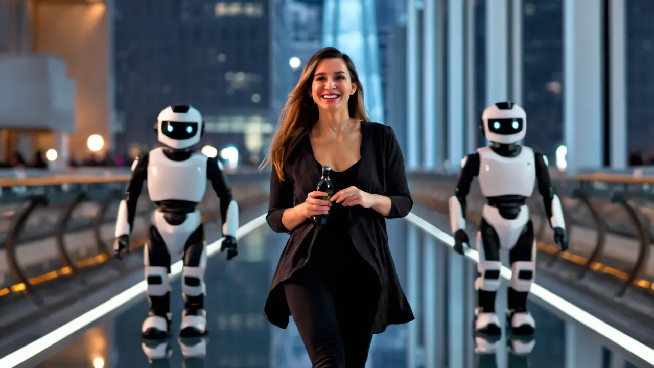 A woman smiles and walks on a sleek, reflective pathway, flanked by two humanoid robots. The woman holds a bottle, and the robots, designed with a white and black color scheme, appear friendly and engaging. The background features ambient lighting and tall structures, creating a futuristic atmosphere.