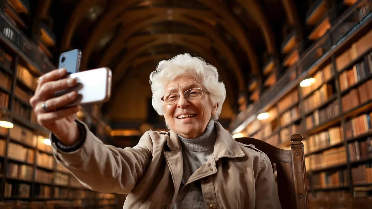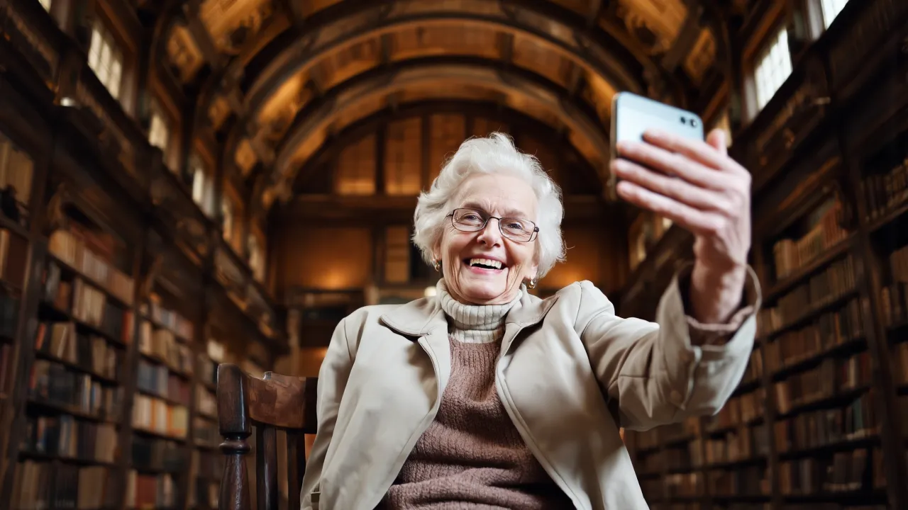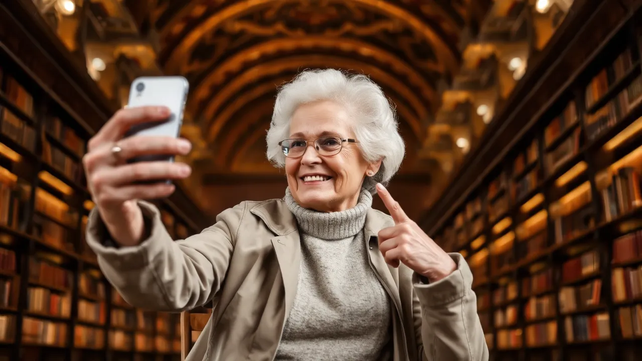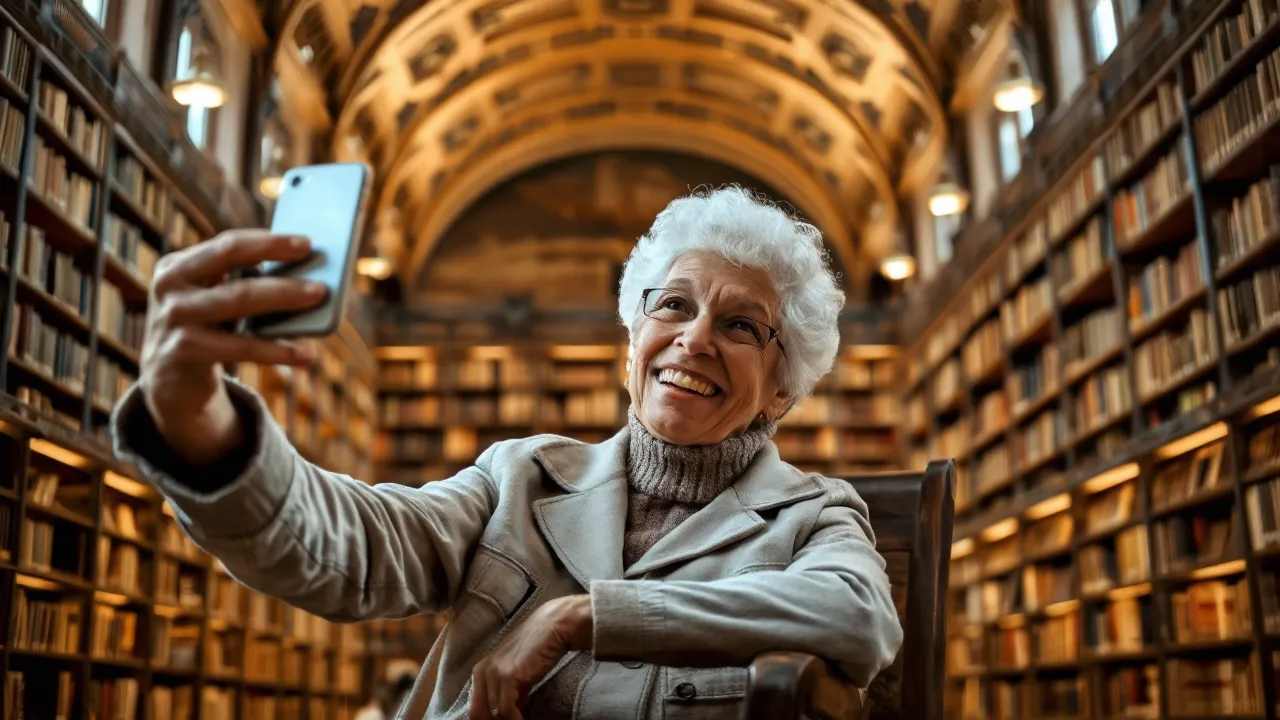 An elderly woman with short, curly white hair smiles while taking a selfie with her smartphone in a grand library. She is seated in a wooden chair, wearing a light jacket over a sweater, and is playfully pointing her finger as she poses. The library features high ceilings adorned with intricate designs and rows of bookshelves, illuminated by warm, ambient lighting.