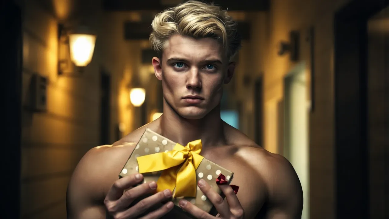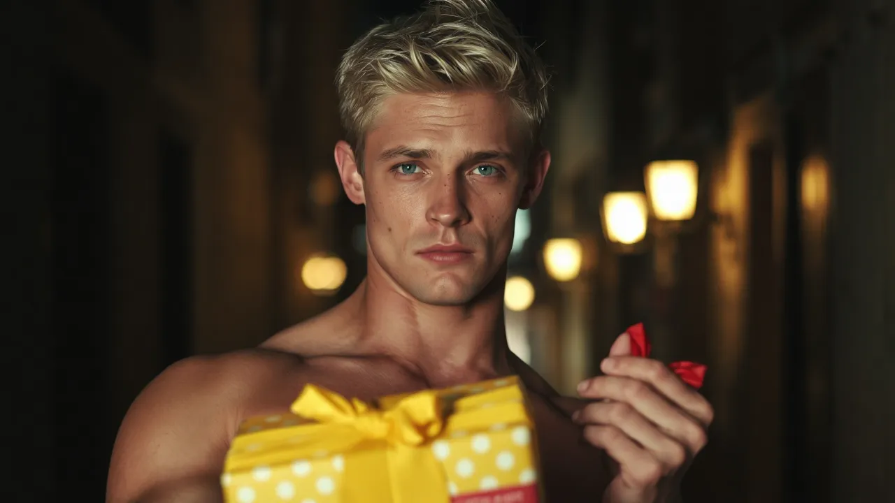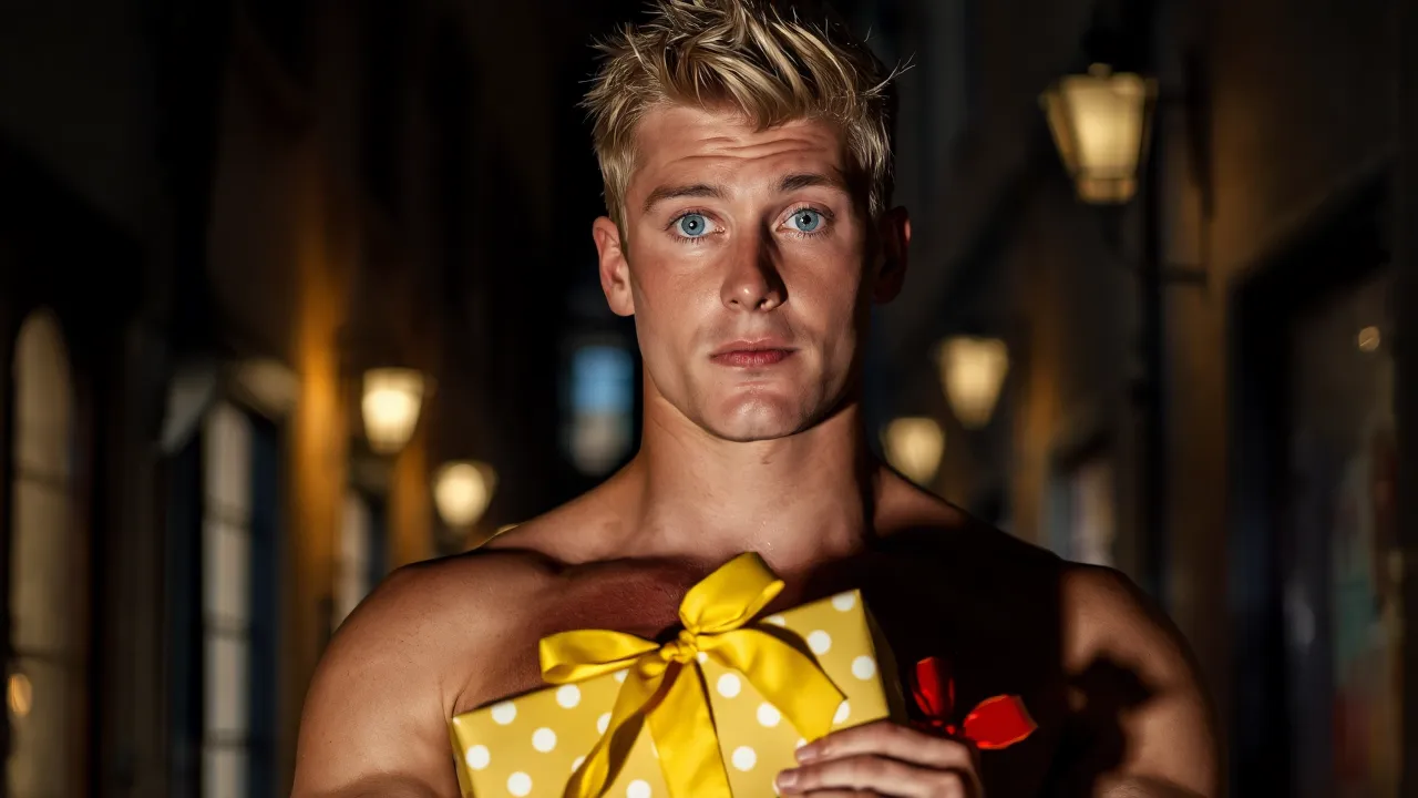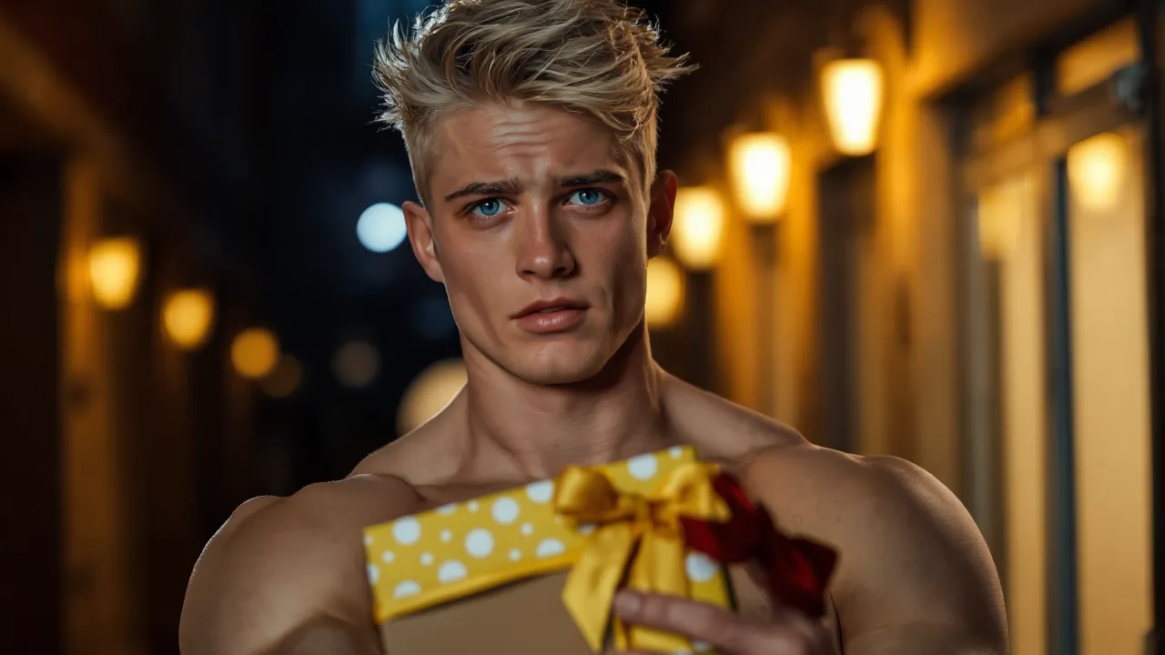 A photograph of a muscular young man with short blond hair stands in a dimly lit alley, holding a wrapped gift adorned with a yellow bow and white polka dots. He has bright blue eyes and a slight blush on his cheeks, suggesting a mixture of excitement and nervousness. In his other hand, he holds a small red bow, and beads of sweat shine on his forehead, indicating a heated or intense situation. The background features softly lit buildings, creating a cozy atmosphere.