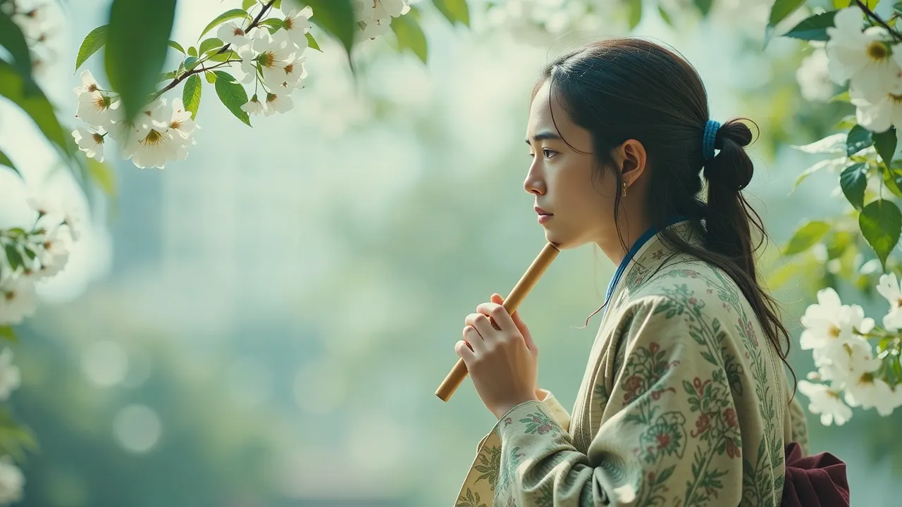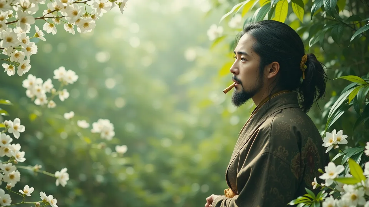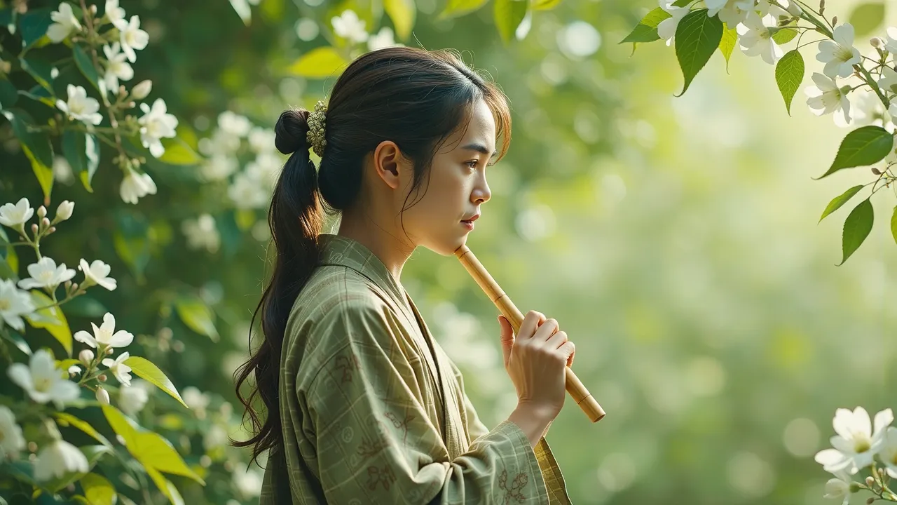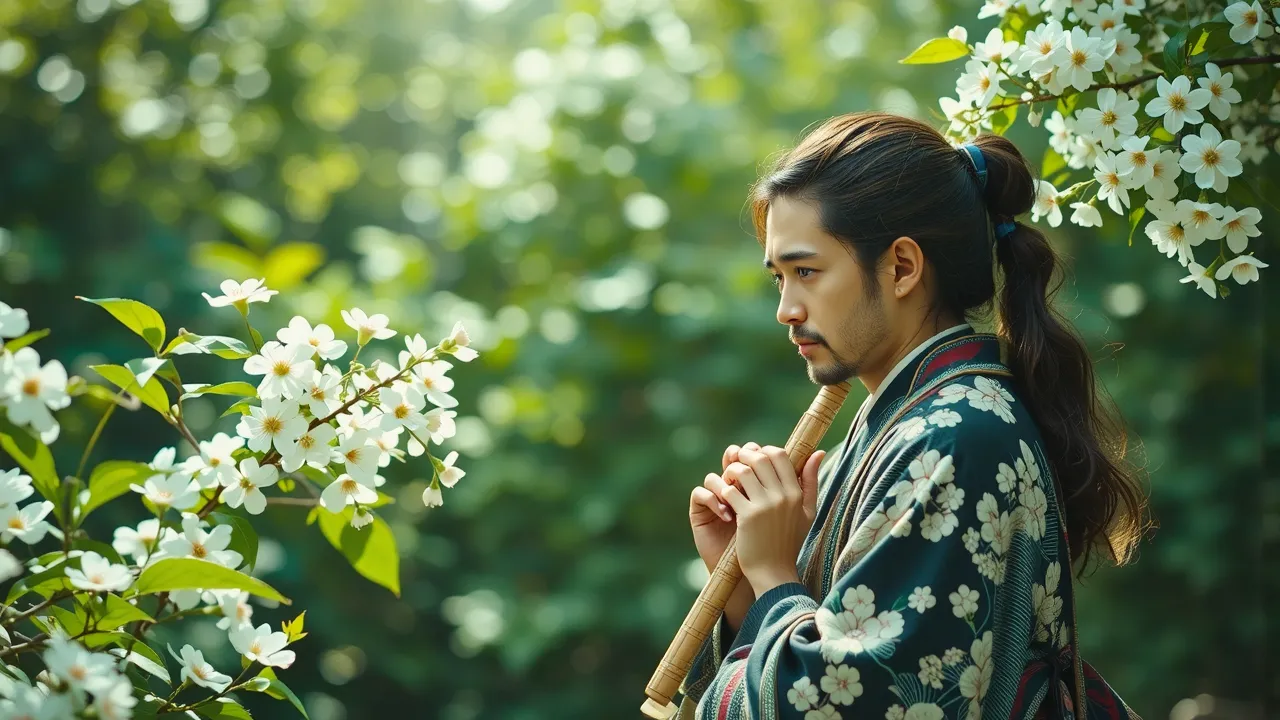 A serene portrait of a young man dressed in a traditional kimono, with long, unkempt hair and a beard. He stands in profile, playing a bamboo flute, his expression contemplative and peaceful. Surrounding him are delicate white flowers and lush green leaves, creating a harmonious blend of nature and art.
