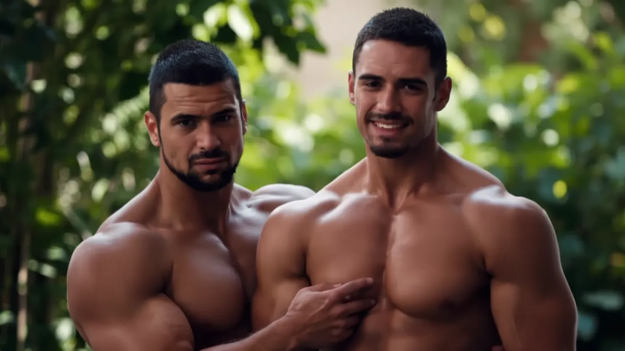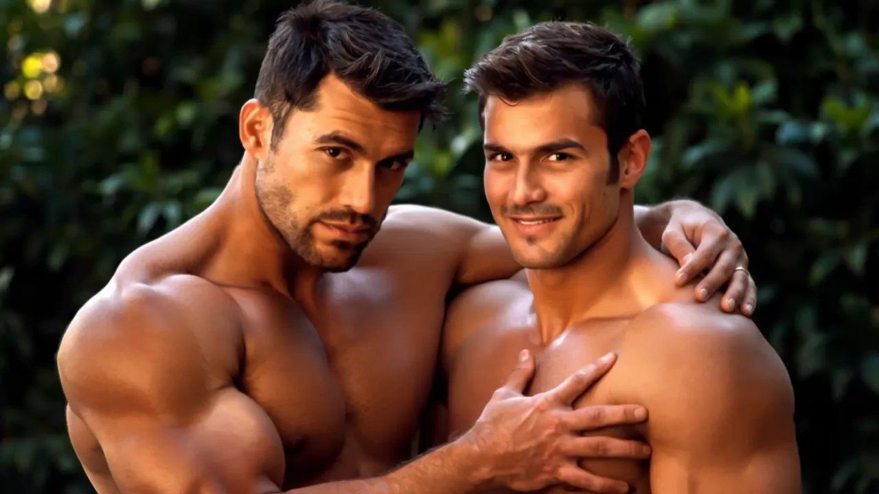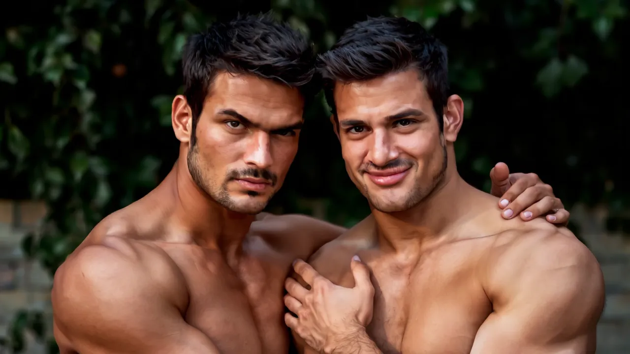 Two muscular men with short, dark hair are standing closely together, both shirtless. The man on the left has a slight beard and is looking at the camera with a serious expression, while the man on the right, who is slightly turned towards him, has a soft smile. Their arms are intertwined, creating a sense of intimacy, set against a softly lit background with green foliage.