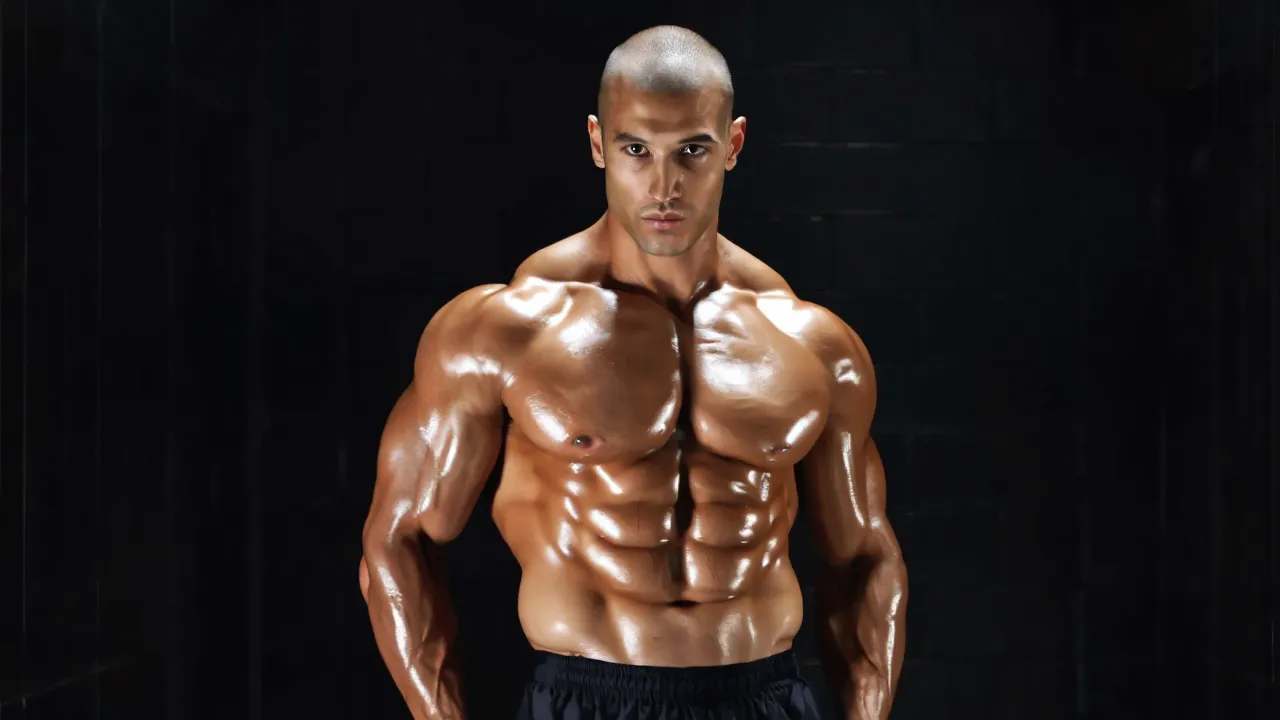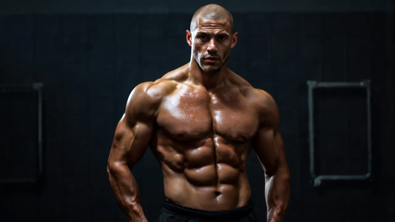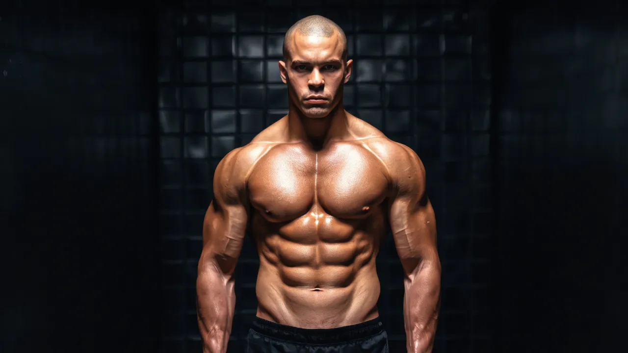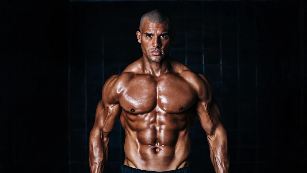A muscular man stands in a dimly lit environment with dark tiled walls. His skin gleams with moisture, highlighting his well-defined physique, including prominent abs and shoulders. He has a shaved head and a serious expression, wearing only black athletic shorts. The overall atmosphere is minimalist and focus-oriented, emphasizing his toned body.
