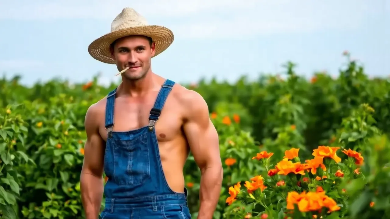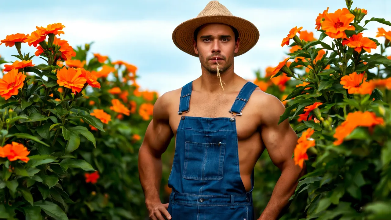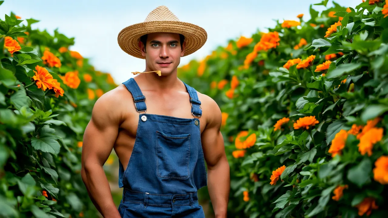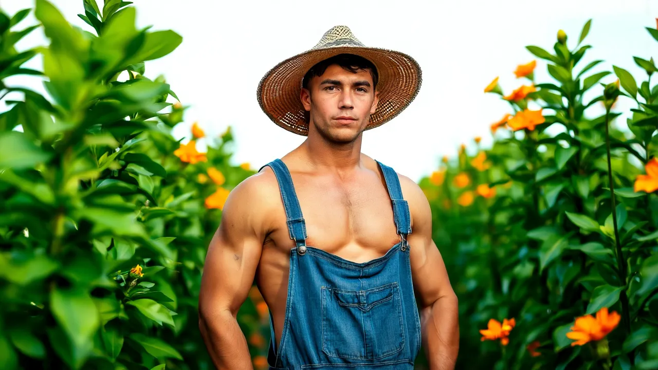 A muscular young man stands in a vibrant garden, wearing a straw hat and blue overalls. He has a confident expression and holds a piece of straw between his lips. Surrounding him are lush green plants and bright orange flowers, with a gentle breeze rustling the leaves. The background features a soft blue sky, enhancing the serene, pastoral atmosphere of the scene.