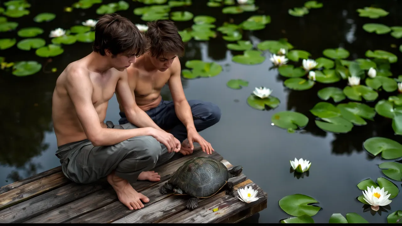 Two 23-year-old men sit on a wooden dock next to a turtle, staring at the creature. They are shirtless, have unkempt hair, and are wearing baggy pants. The serene pond is surrounded by green lily pads and delicate white water lilies, which reflect the soft light. The scene conveys a sense of calm and curiosity in an idyllic, natural setting.