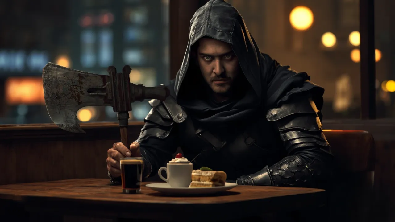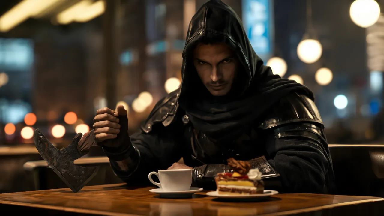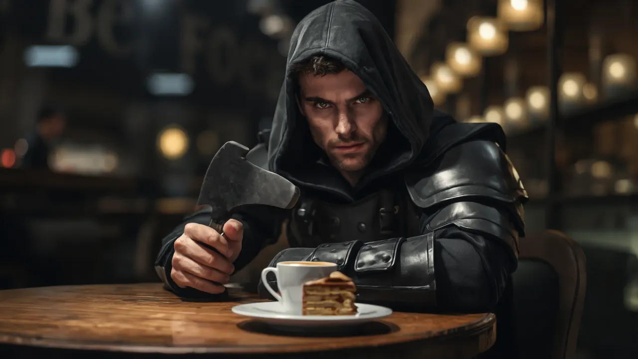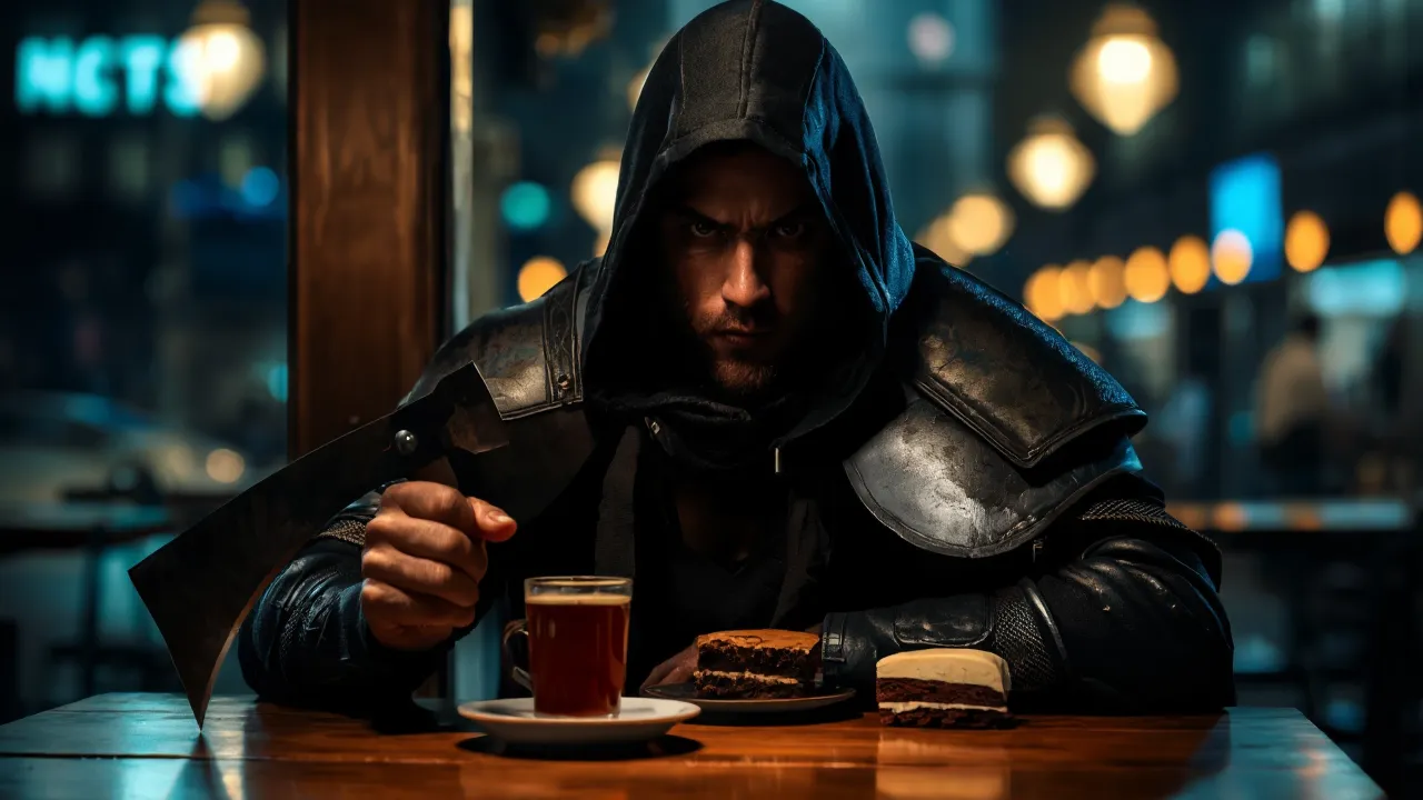 A brooding male figure sits at a wooden table in a dimly lit café at night. He wears a dark hooded cloak and armor, gripping a large battle axe in one hand, while a small cup of espresso and a slice of cake are placed in front of him. The background features blurred city lights, adding an urban atmosphere to the scene. His intense gaze suggests a captivating story or inner conflict.