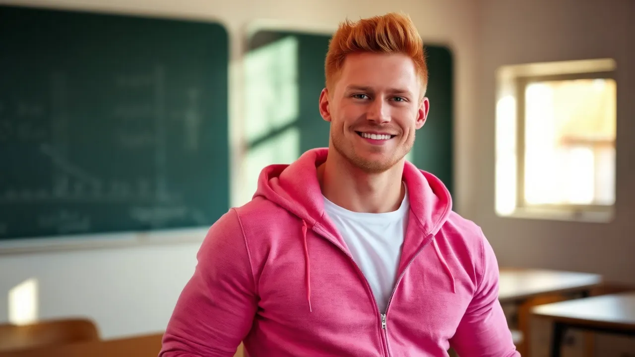A muscular young man with short, spiky orange hair and a light beard smiles confidently. He wears a pink hoodie with a white shirt underneath, slightly pulling at the pocket with one hand while the other rests in his pocket. The background features a classroom setting with a blurred chalkboard and wooden desks. Soft, natural light streams in from a window, creating a warm atmosphere.