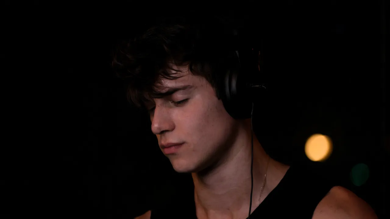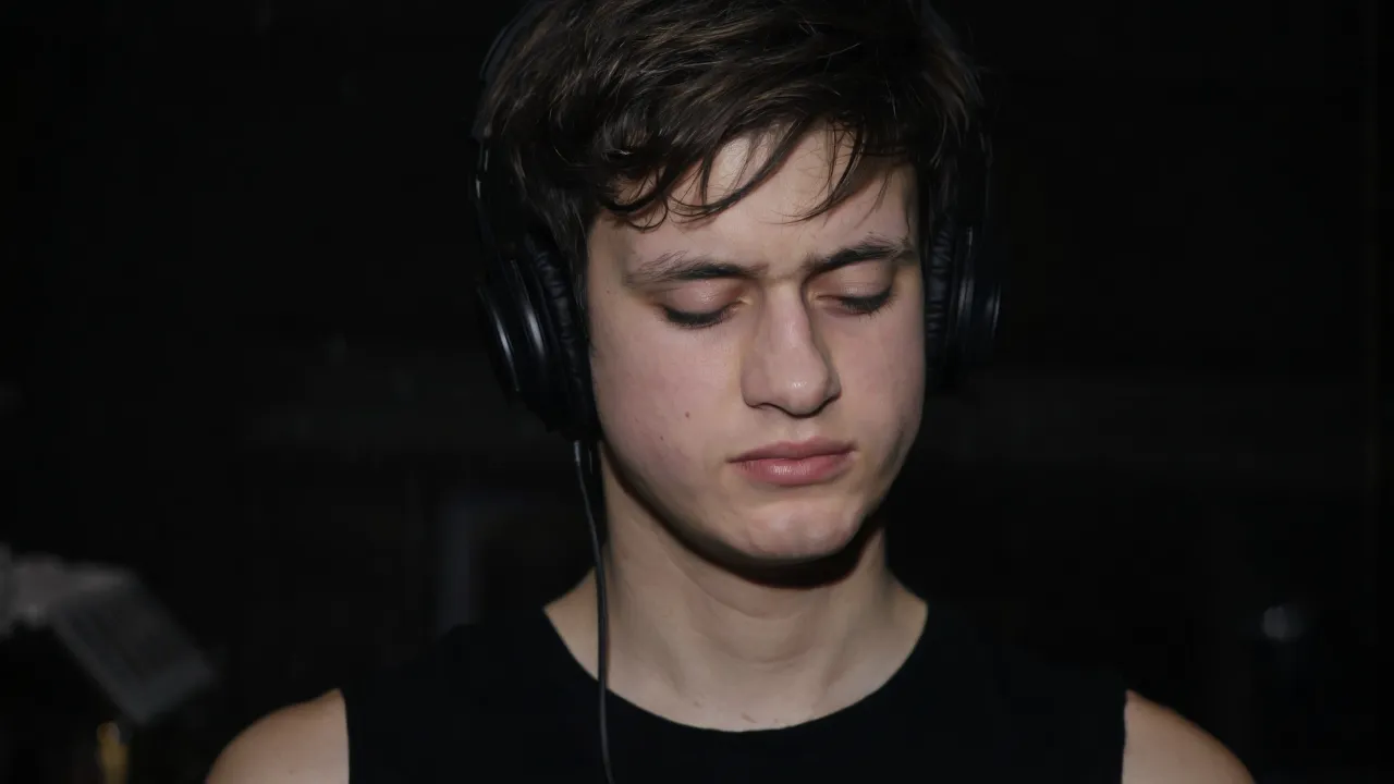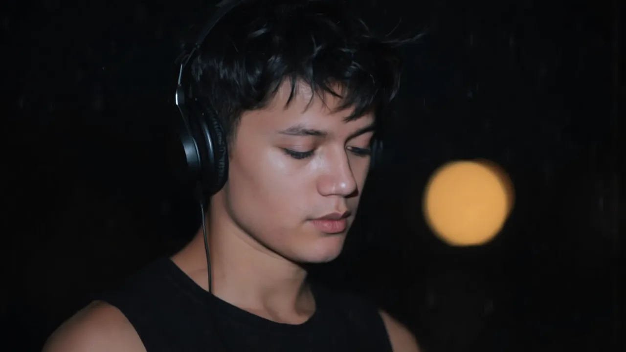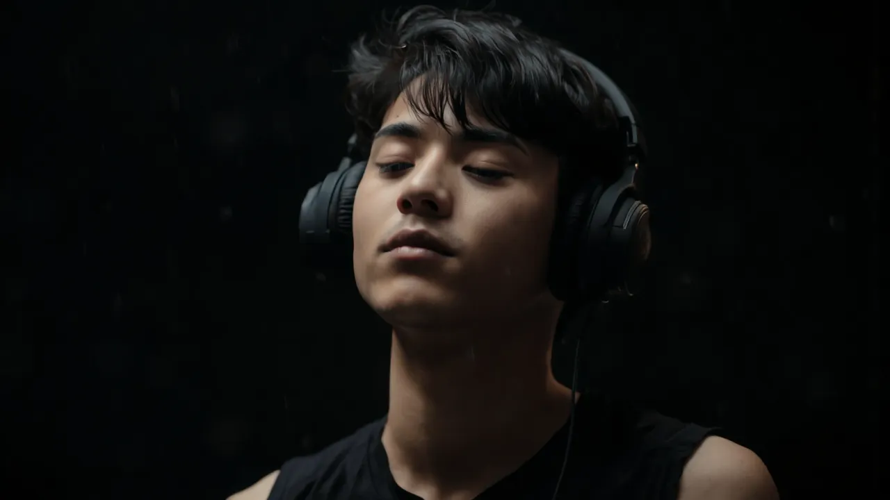 A young man wearing black headphones is immersed in music, his eyes closed and his expression serene. He has short, disheveled hair and is wearing a sleeveless black shirt. The background is dark and slightly blurred, with subtle light particles or a soft rain effect contributing to the introspective atmosphere.