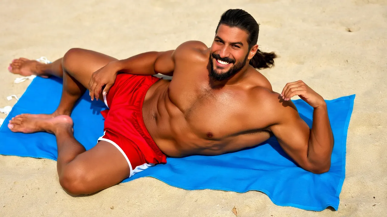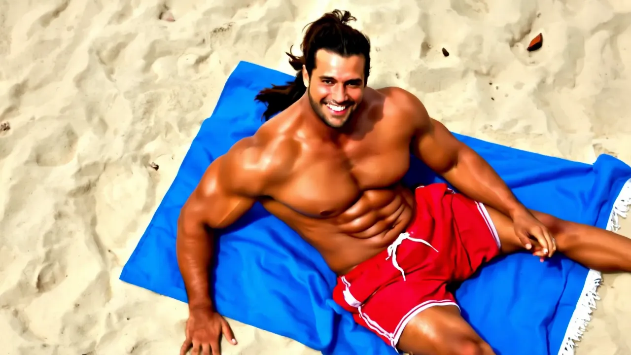 A muscular man with a confident smile rests on a blue beach towel. He has a well-defined physique, showing off his bare chest and toned arms. He’s wearing red swim trunks with white trim, and his long hair is styled in a ponytail. The sandy beach surrounds him, suggesting a relaxing summer day.