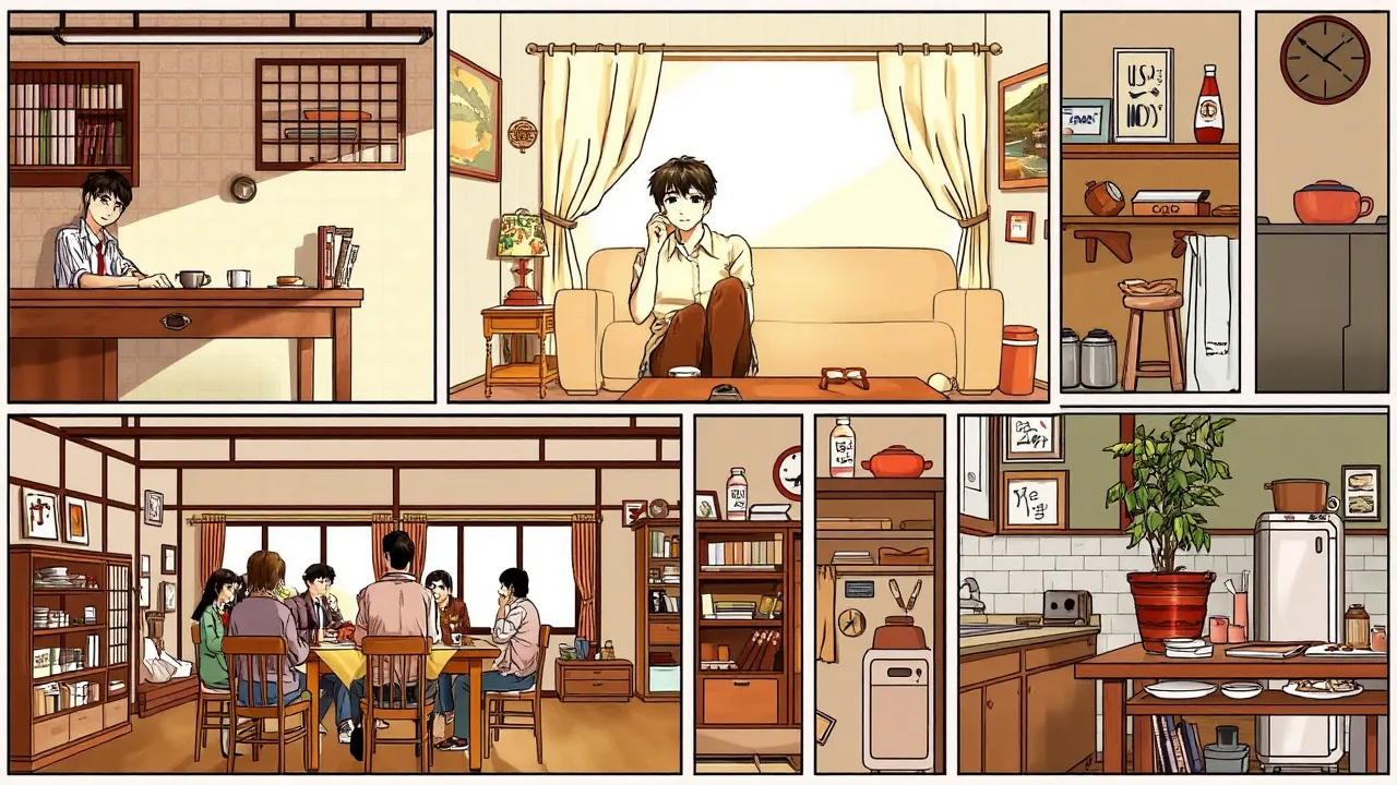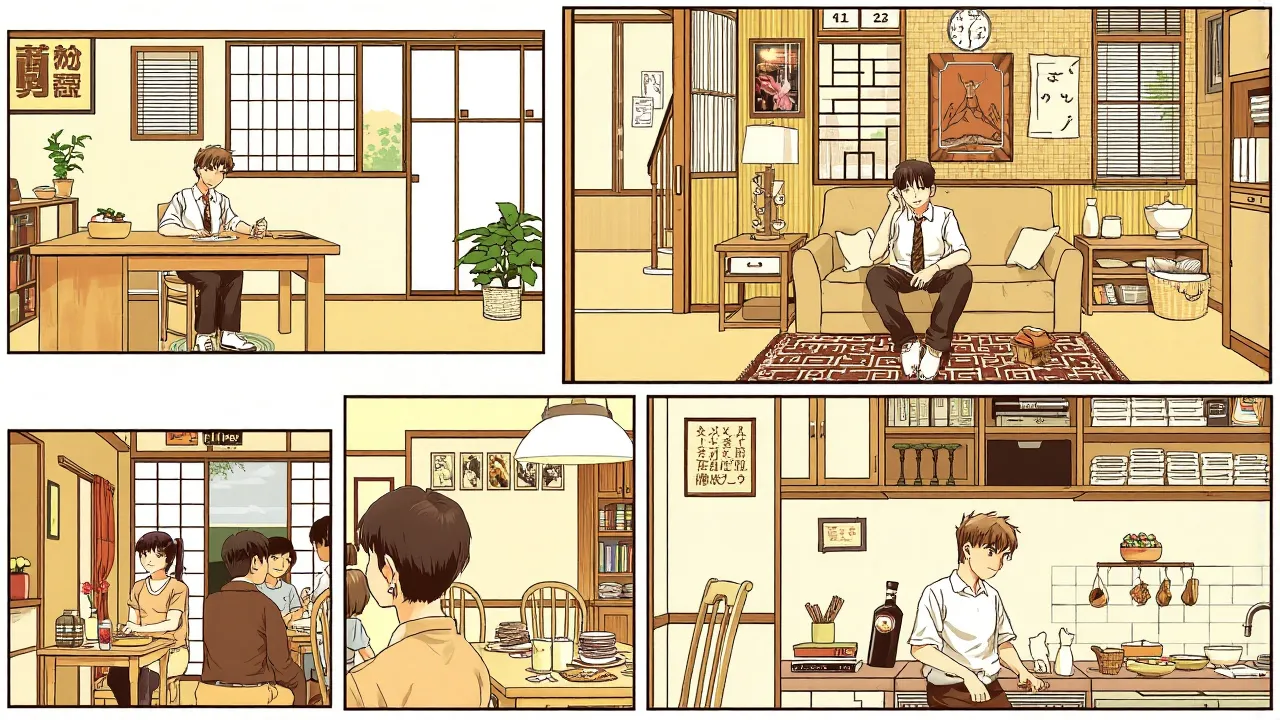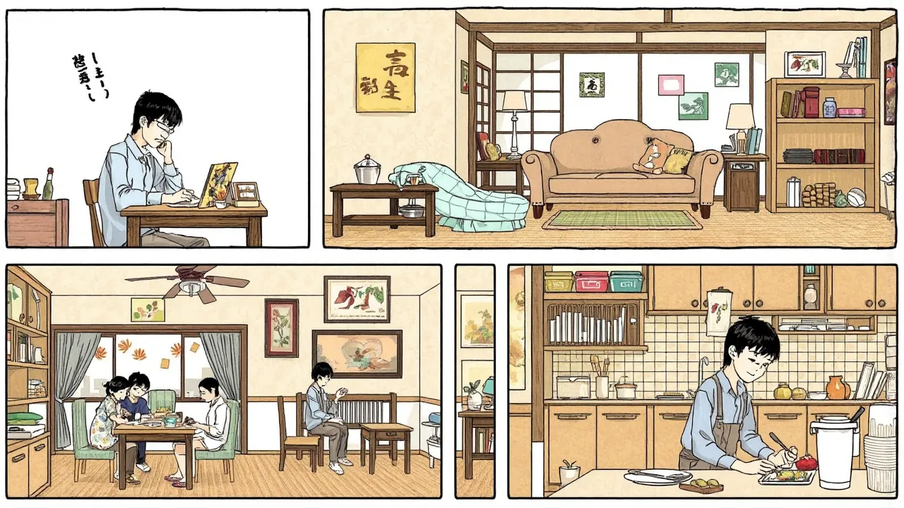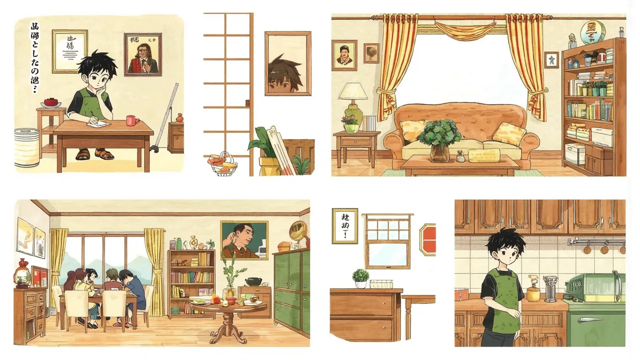 A collage of illustrations depicting various scenes in a cozy, vintage-style Japanese home. The upper left corner shows a young man sitting at a wooden desk, writing. The adjacent panel shows him thoughtfully in a bright living room, furnished with a sofa and adorned with various decorations. The lower left shows a dining room where people are chatting around a table. In the lower right, the young man is seen preparing food in a well-stocked kitchen. Overall, the images convey a warm, nostalgic atmosphere filled with personal touches and everyday activities.