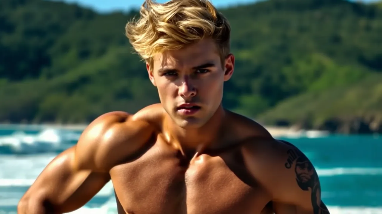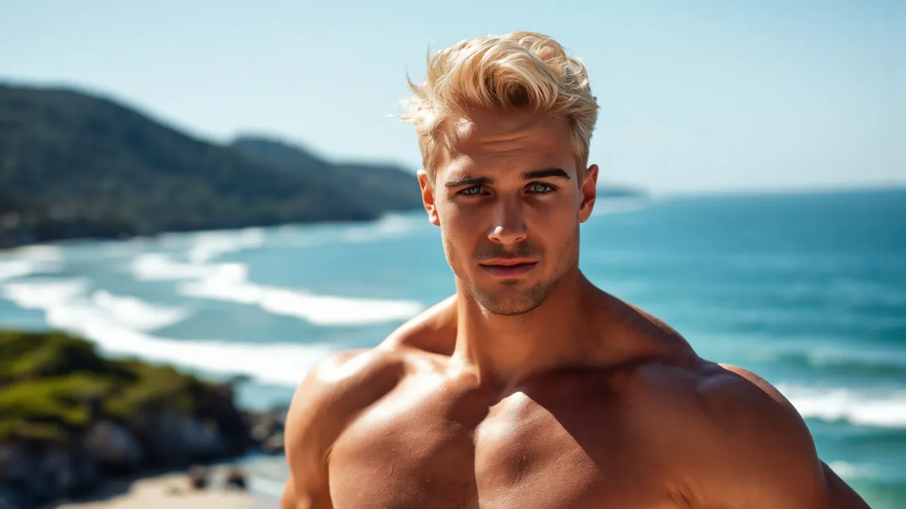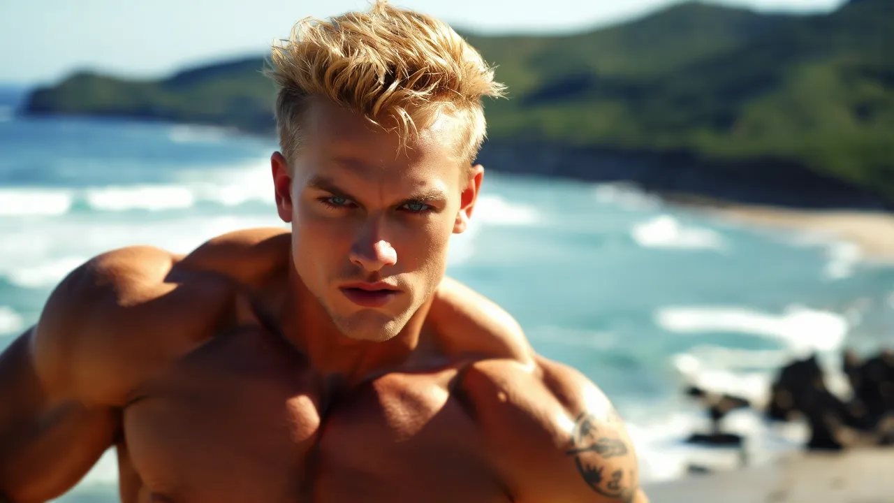 A muscular young man with tousled blonde hair poses against a scenic beach backdrop. His chiseled features and strong jawline highlight a confident expression. The sunlight accentuates his toned physique, particularly his strong shoulders and arms, which feature a detailed tattoo. The ocean waves and lush green hills in the background create a vibrant, summery atmosphere.
