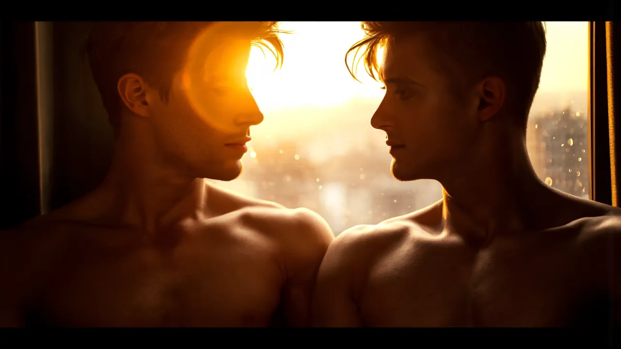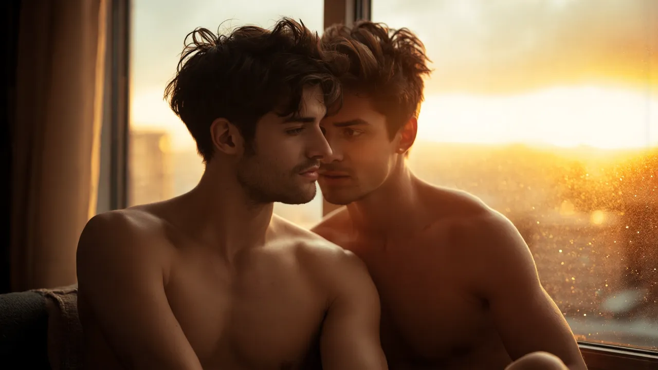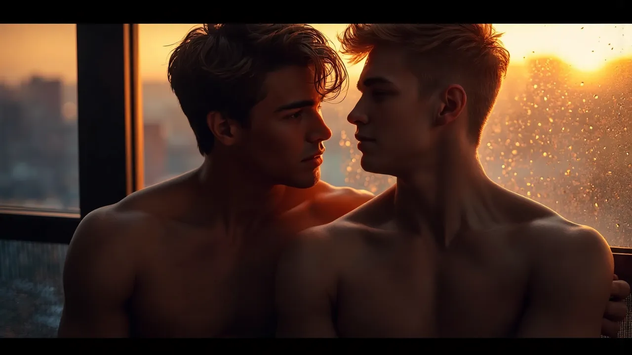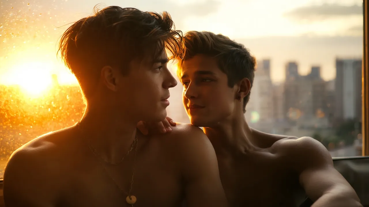 Two young men sit close together in a warm and intimate setting, surrounded by soft, golden sunset light. They are shirtless, showcasing their toned physiques and gentle expressions. One has tousled hair and a contemplative gaze, while the other gazes lovingly at him. Raindrops are visible on the window behind them, contributing to a romantic atmosphere. The background features a blurred cityscape, suggesting an urban setting.