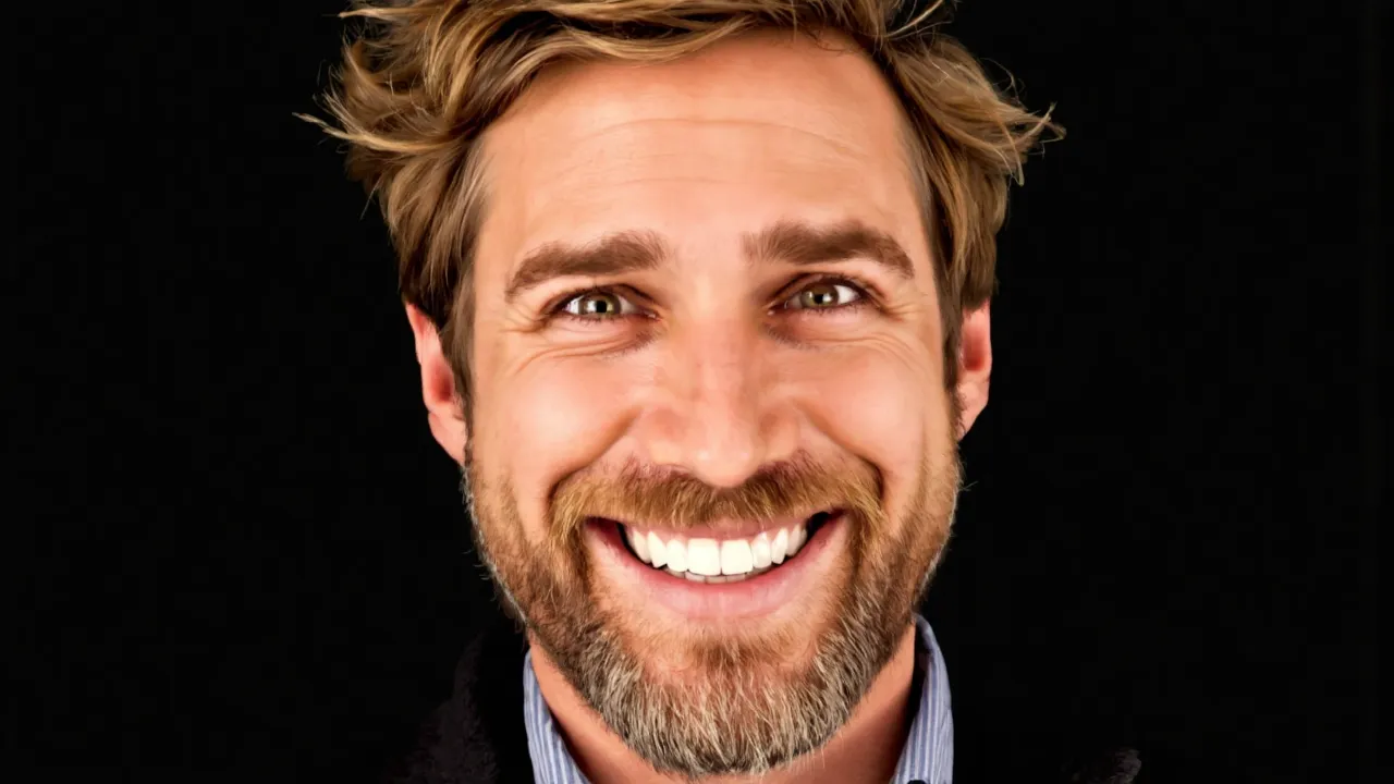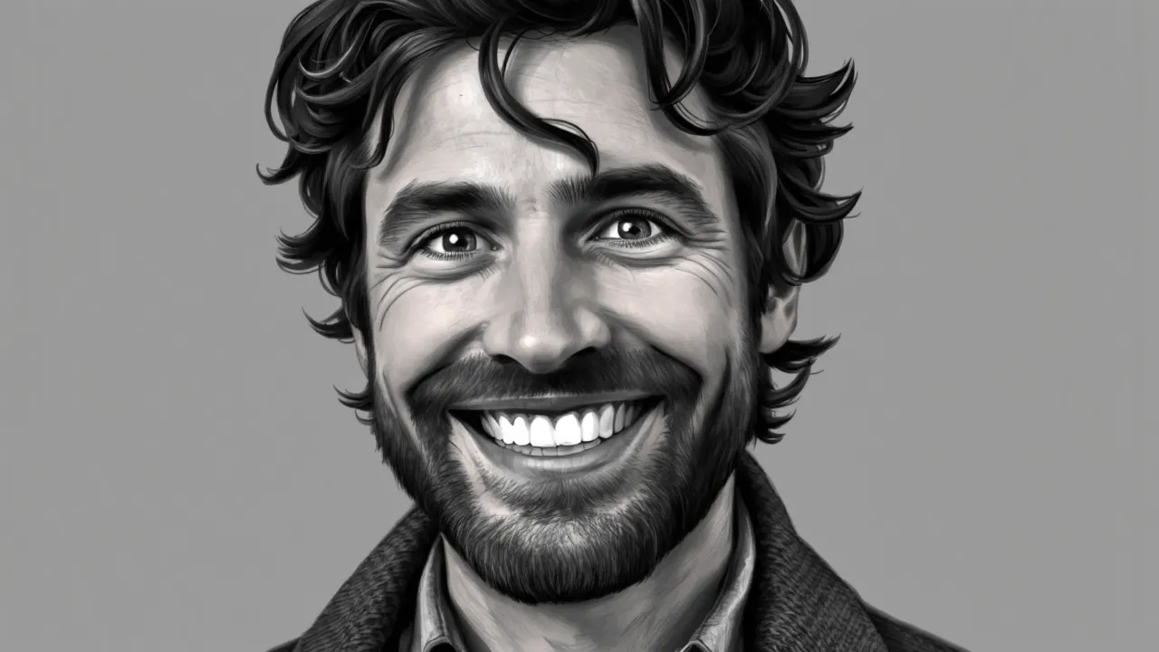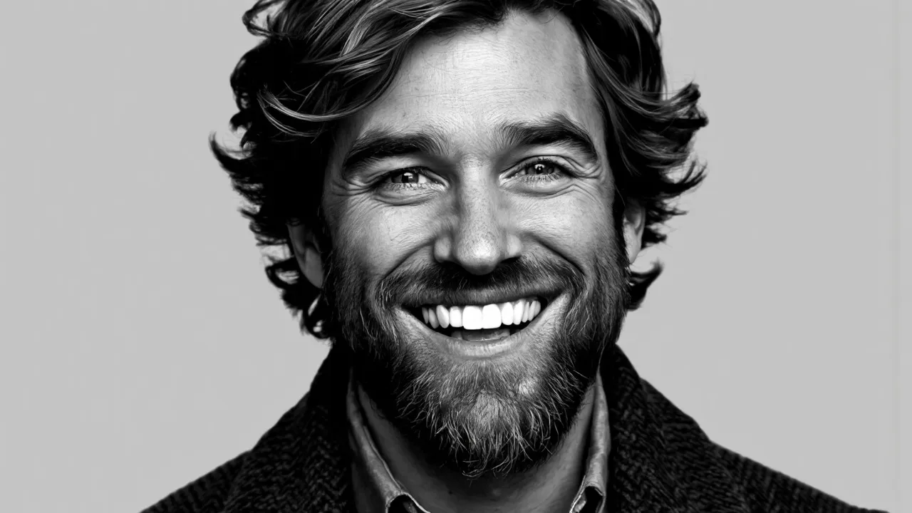 A portrait of a smiling man with wavy, tousled hair and a well-groomed beard. He has bright eyes and a broad smile, showing off his white teeth. The man is wearing a collared shirt and a textured coat, which adds depth to the image through detailed shading and contrast. The background is simple, drawing attention to his cheerful expression.
