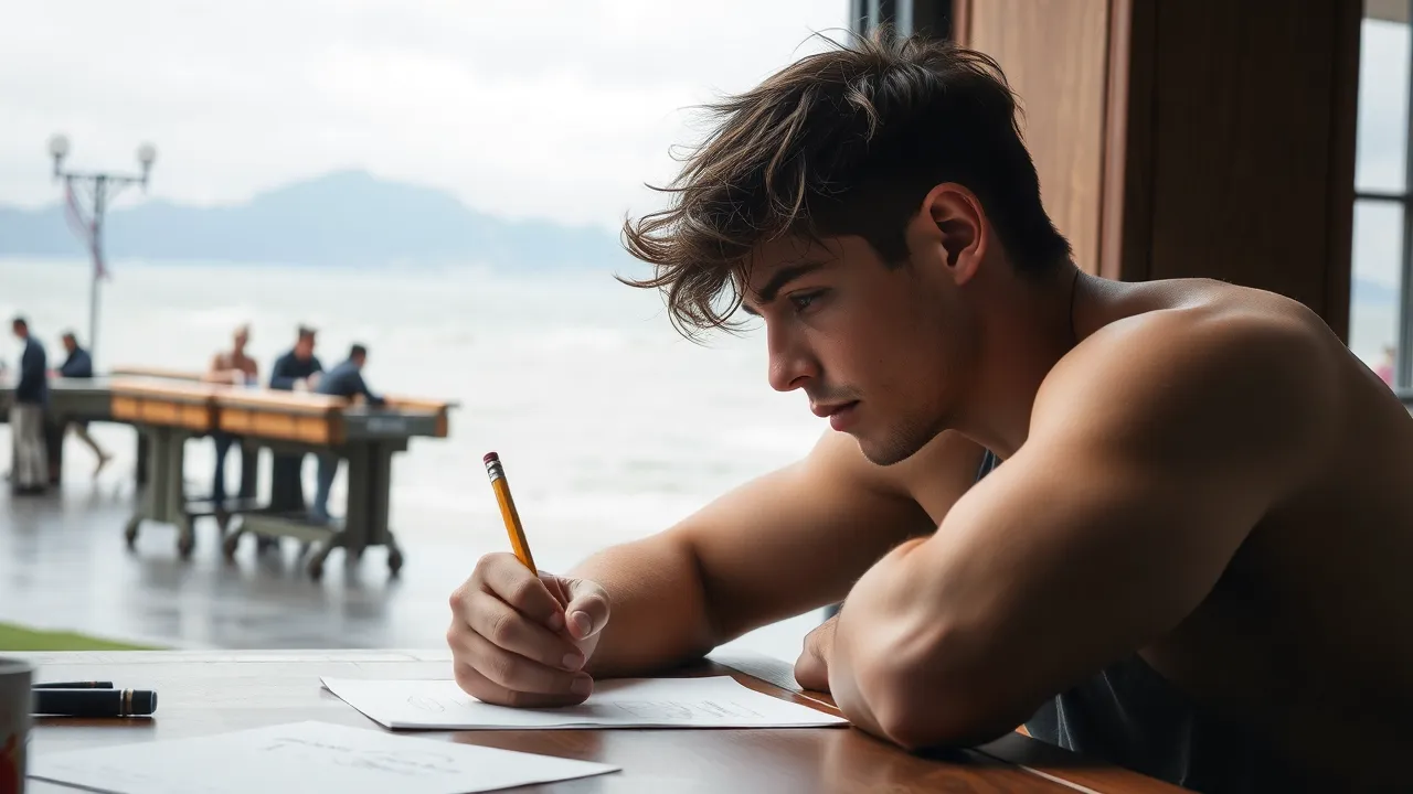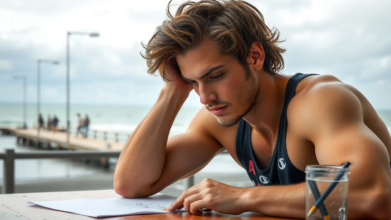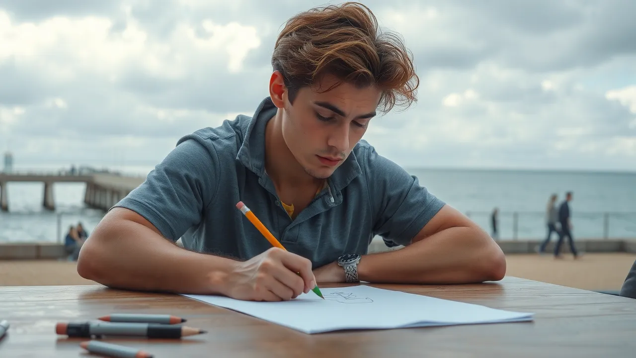 A contemplative young man of athletic build sits at a table, resting his head on one hand while the other holds a pencil on paper. His hair is disheveled. In the background, a view of the sea can be seen, with a pier and distant figures walking along the shore under a cloudy sky. The scene captures a moment of quiet introspection and creativity.