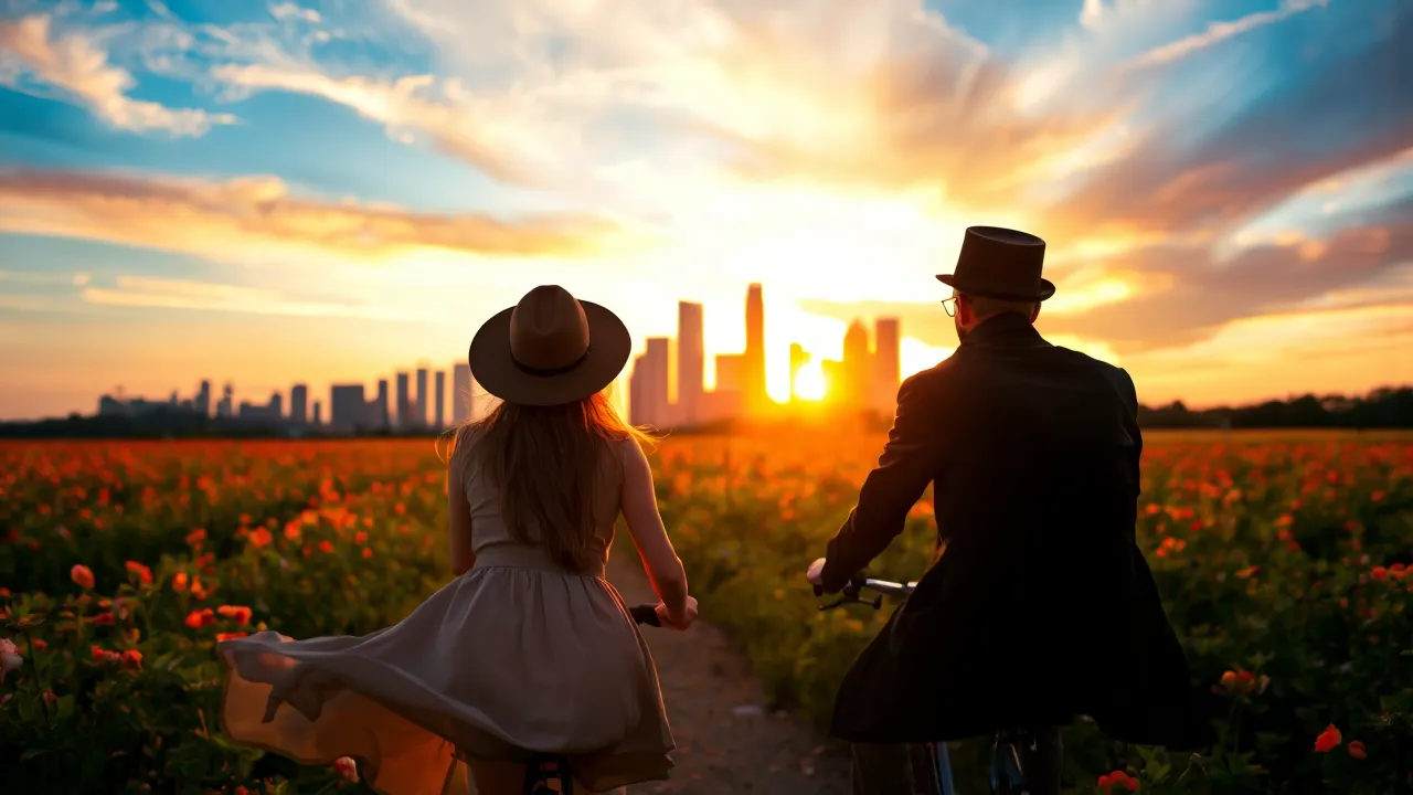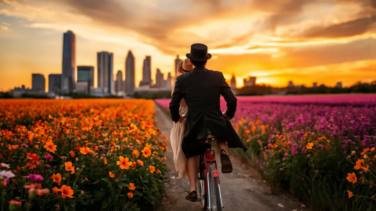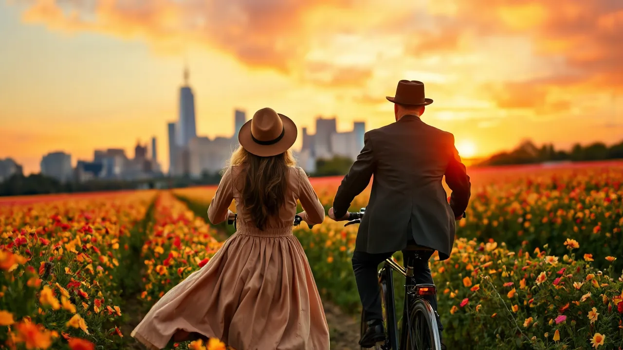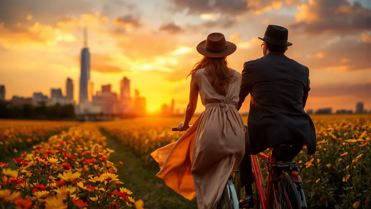 A panoramic view of two cyclists riding through a vibrant field of flowers at sunset. The woman, wearing a flowing beige dress and a brown hat, is seen from behind, while the man, wearing a black top hat and coat, rides forward on his bicycle. In the background, a skyline of tall skyscrapers shines against the colorful sky, creating a romantic and serene atmosphere.